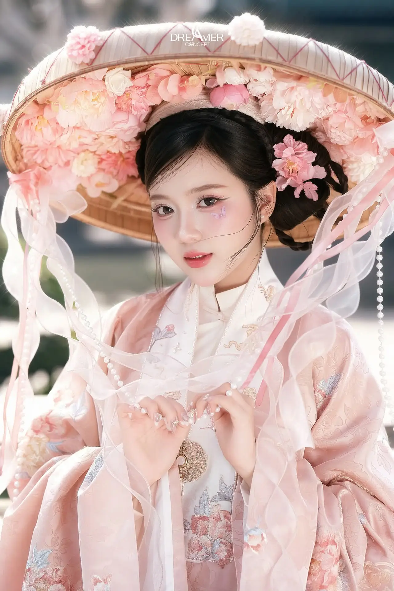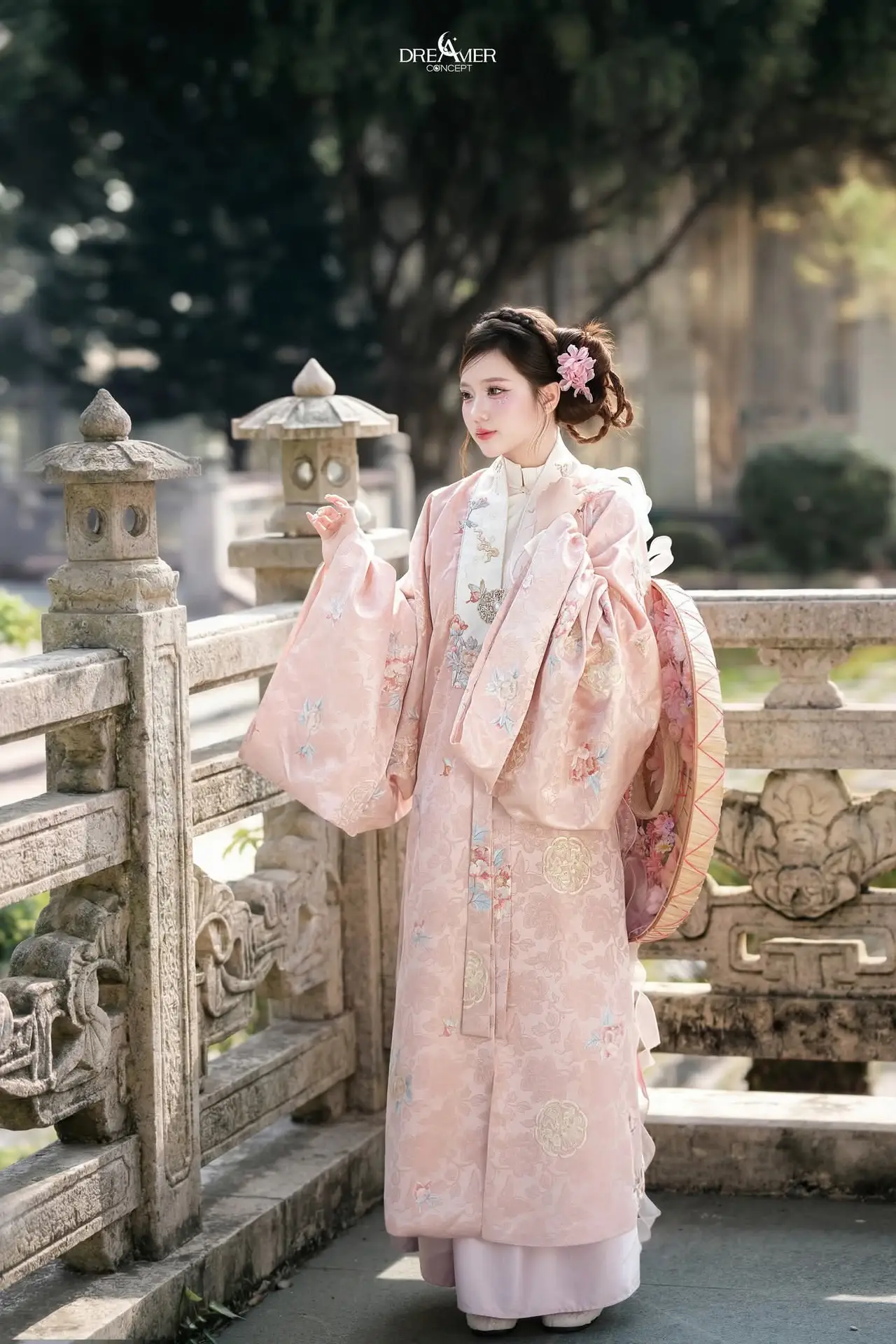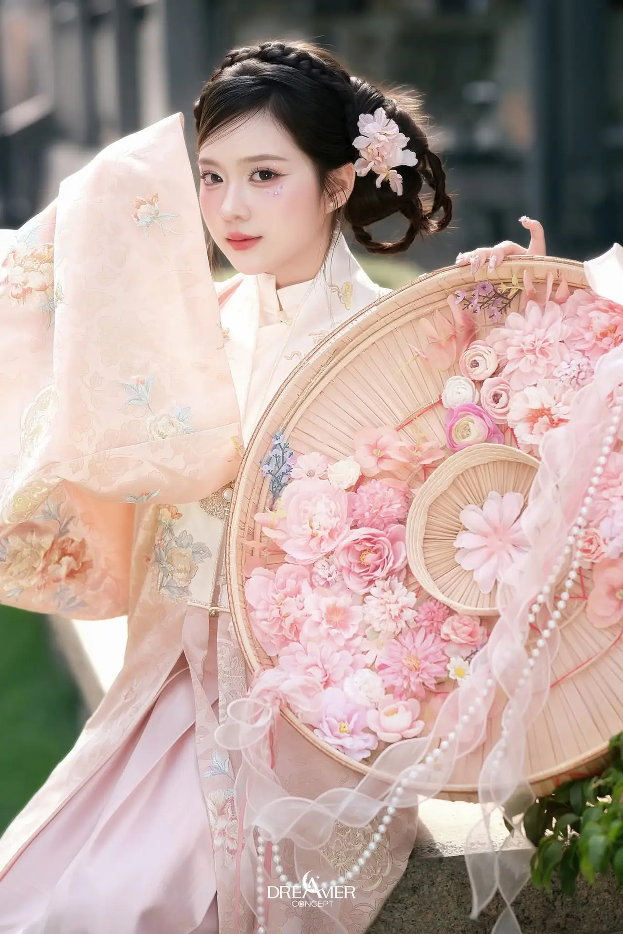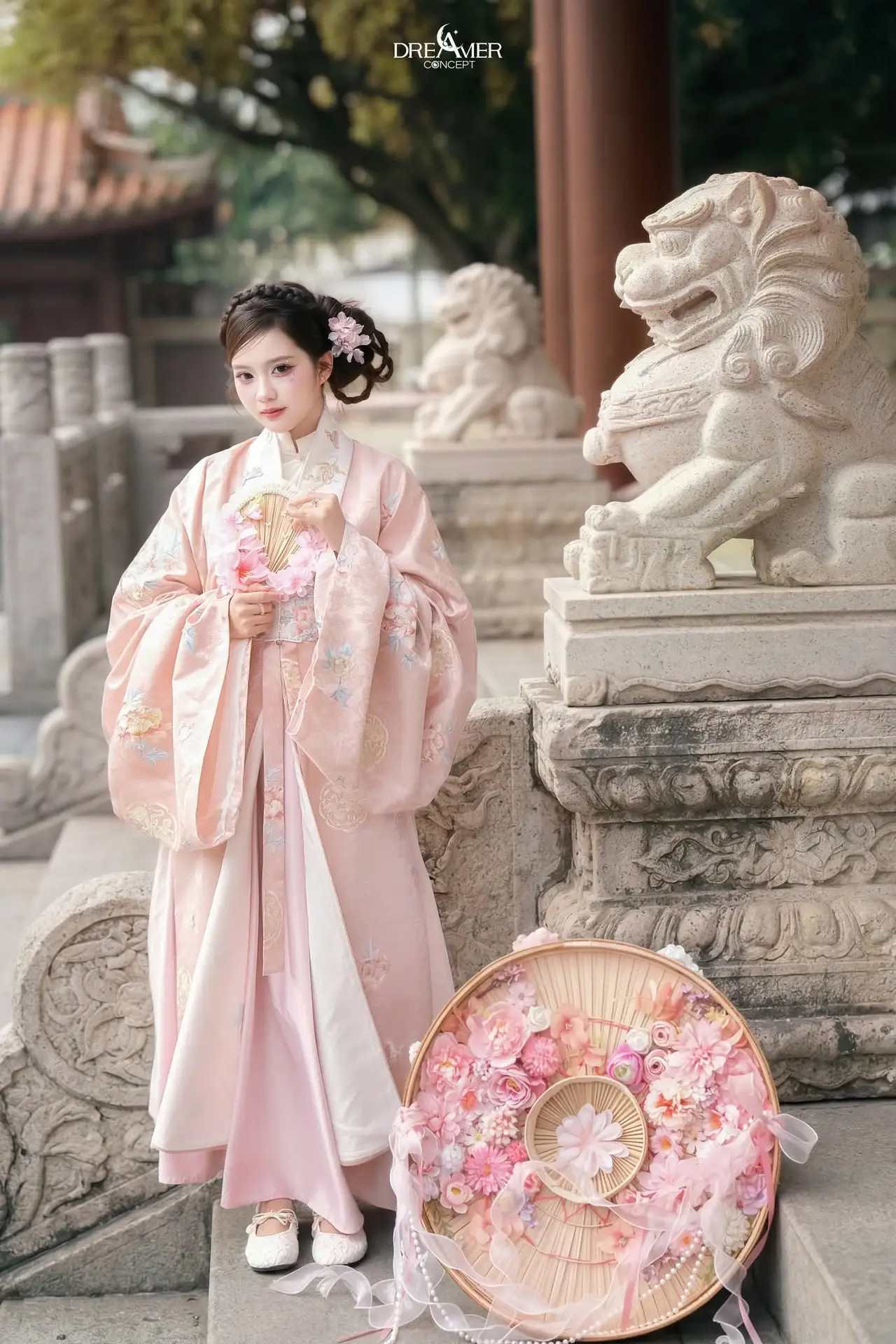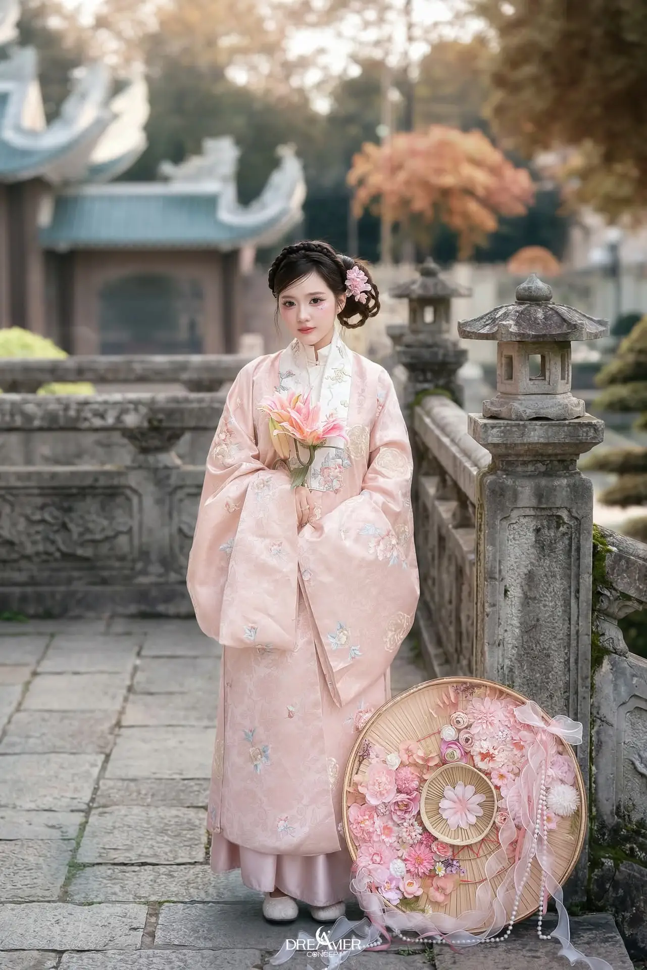 The images transports us to a deeply traditional setting where Asian beauty shines through the figure of a young woman in a delicate pink Hanfu. The gown with its gentle pink hue adorned with meticulously embroidered patterns and traditional design elements accentuates her elegance and grace. Her hair styled in a high bun with floral accents combined with subtle jewelry completes her fluid and ethereal demeanor. The girl stands amidst an ancient garden scene featuring intricately carved stone railings creating a harmonious picture between human and architecture. This moment is not just an admiration of an outfit but a profound feeling for the cultural depth and timeless beauty of traditional Chinese attire evoking peace and nostalgia for a golden past.