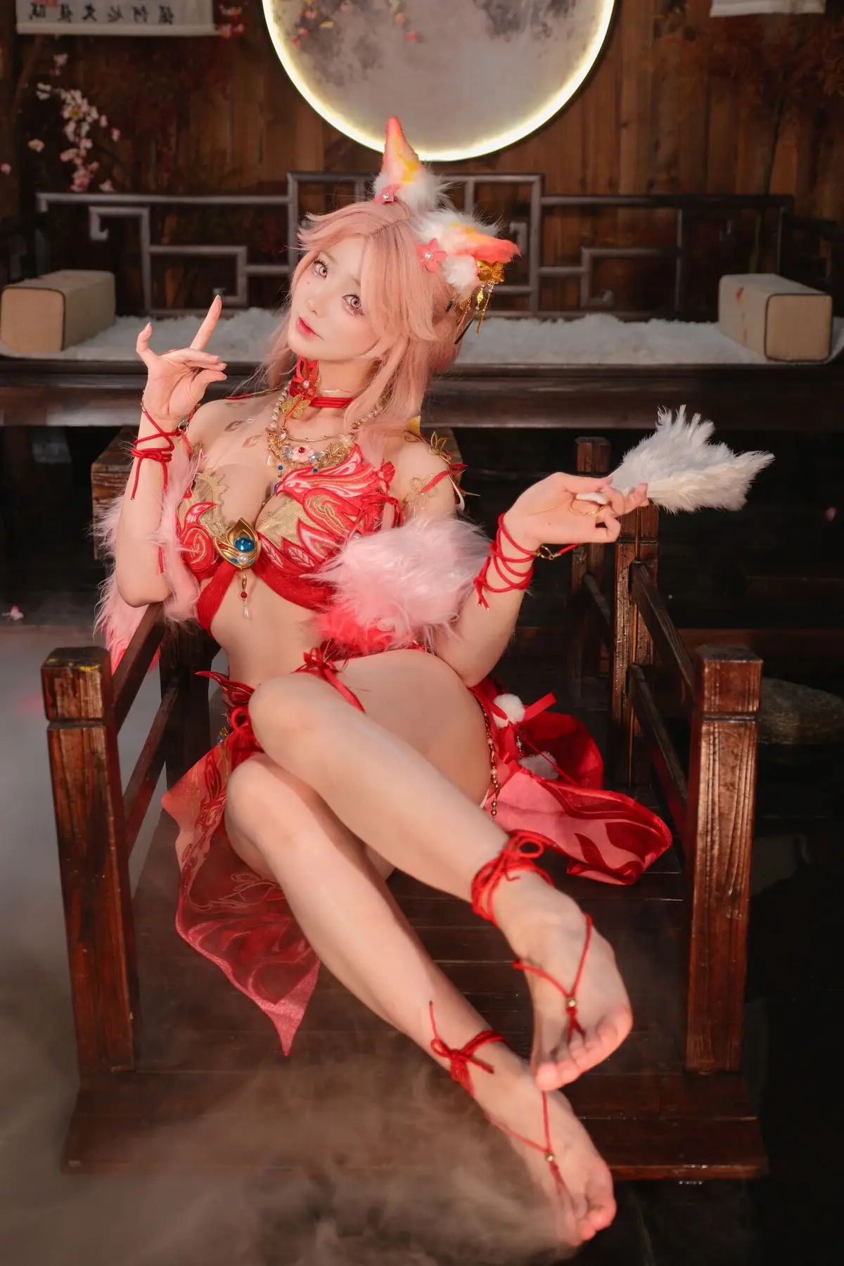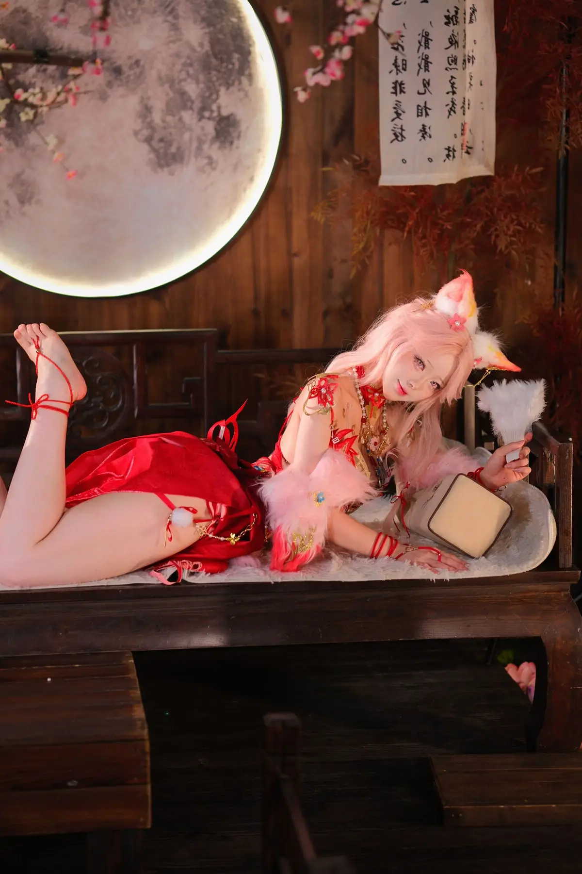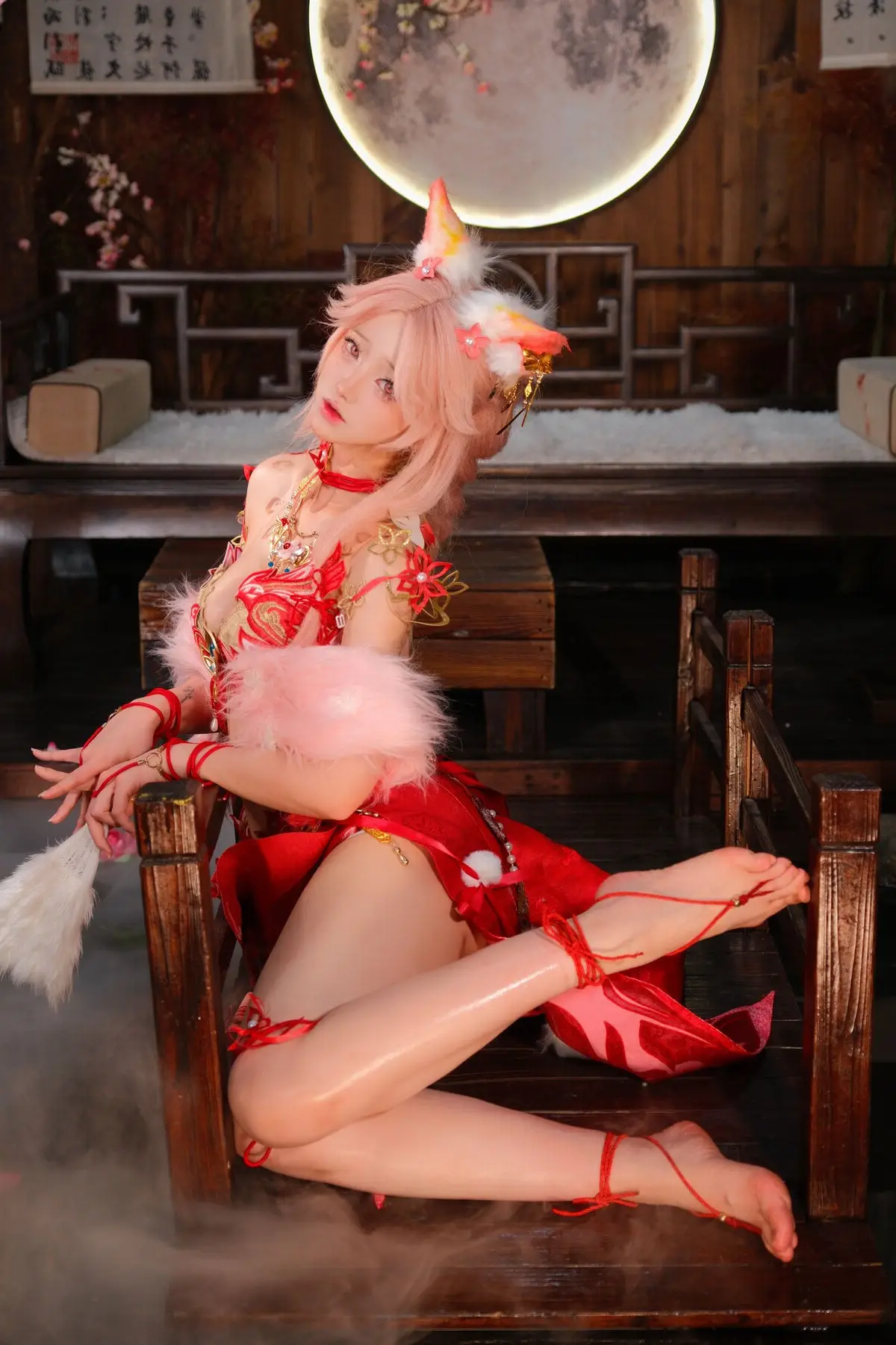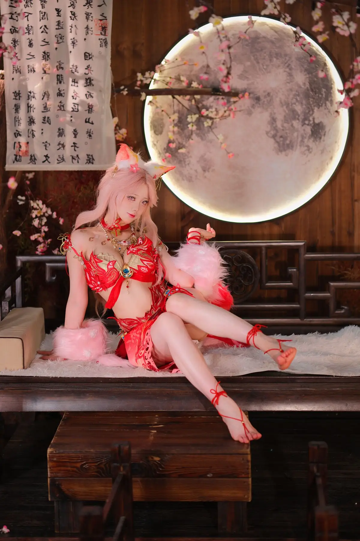 This stunning image features Coser Maeno Taita embodying Yulinglong from the game Naraka Bladepoint. She captivates in a vibrant red costume, posing gracefully with a white fan. The setting, rich in Asian aesthetic, with delicate cherry blossoms and a prominent moon motif, creates an ethereal and mysterious atmosphere. Maeno Taita perfectly portrays the fox spirit Yulinglong, exuding an alluring and enigmatic charm. Every detail, from the elaborate attire to her expressive pose, is meticulously crafted, drawing viewers into the fantastical world of Naraka Bladepoint. This impressive cosplay showcases the cosplayer's talent and dedication.#Cosplay #NarakaBladepoint #Yulinglong #MaenoTaita #AsianFantasy