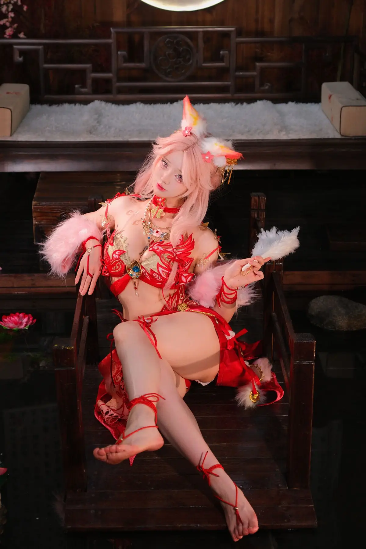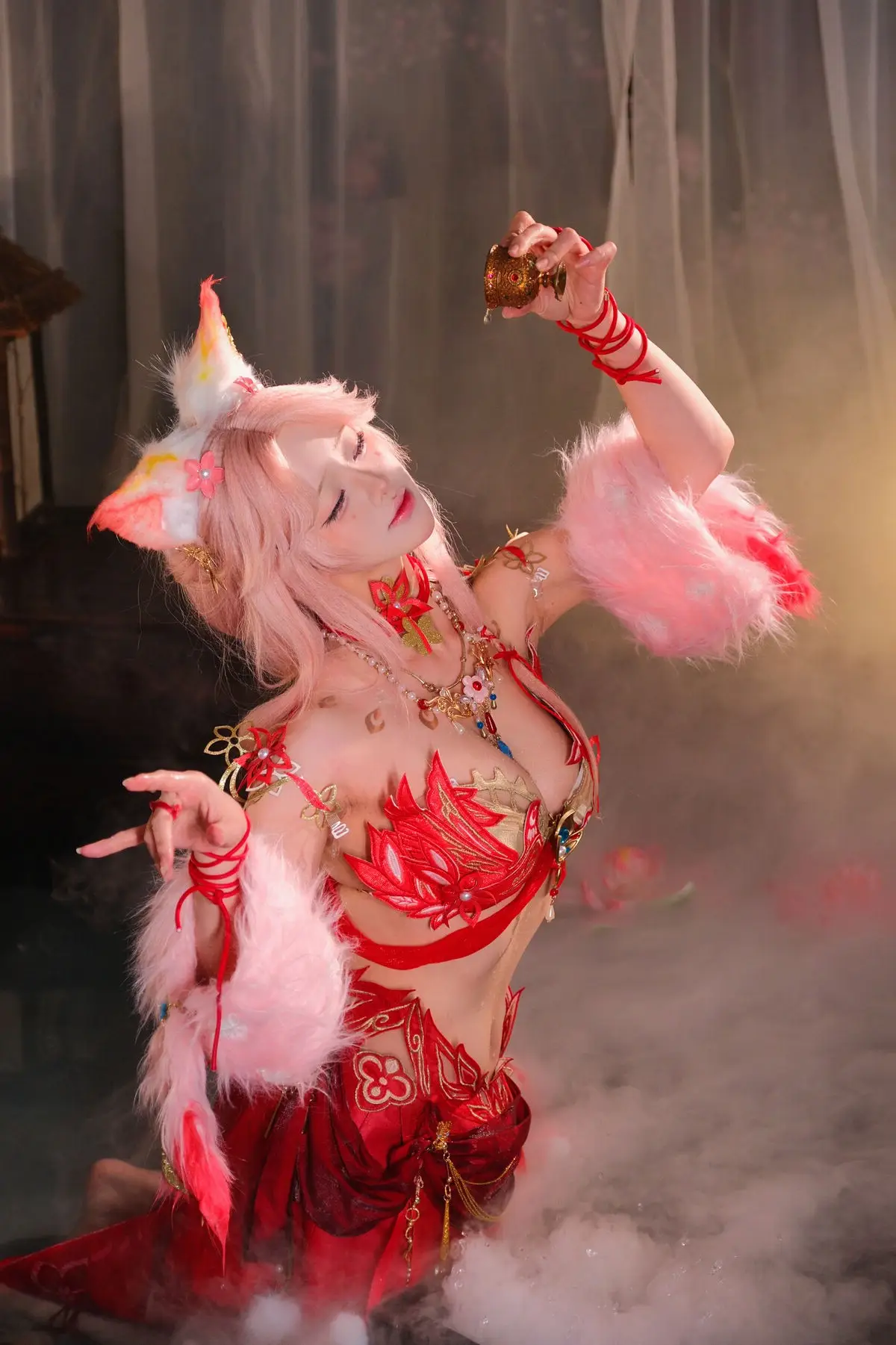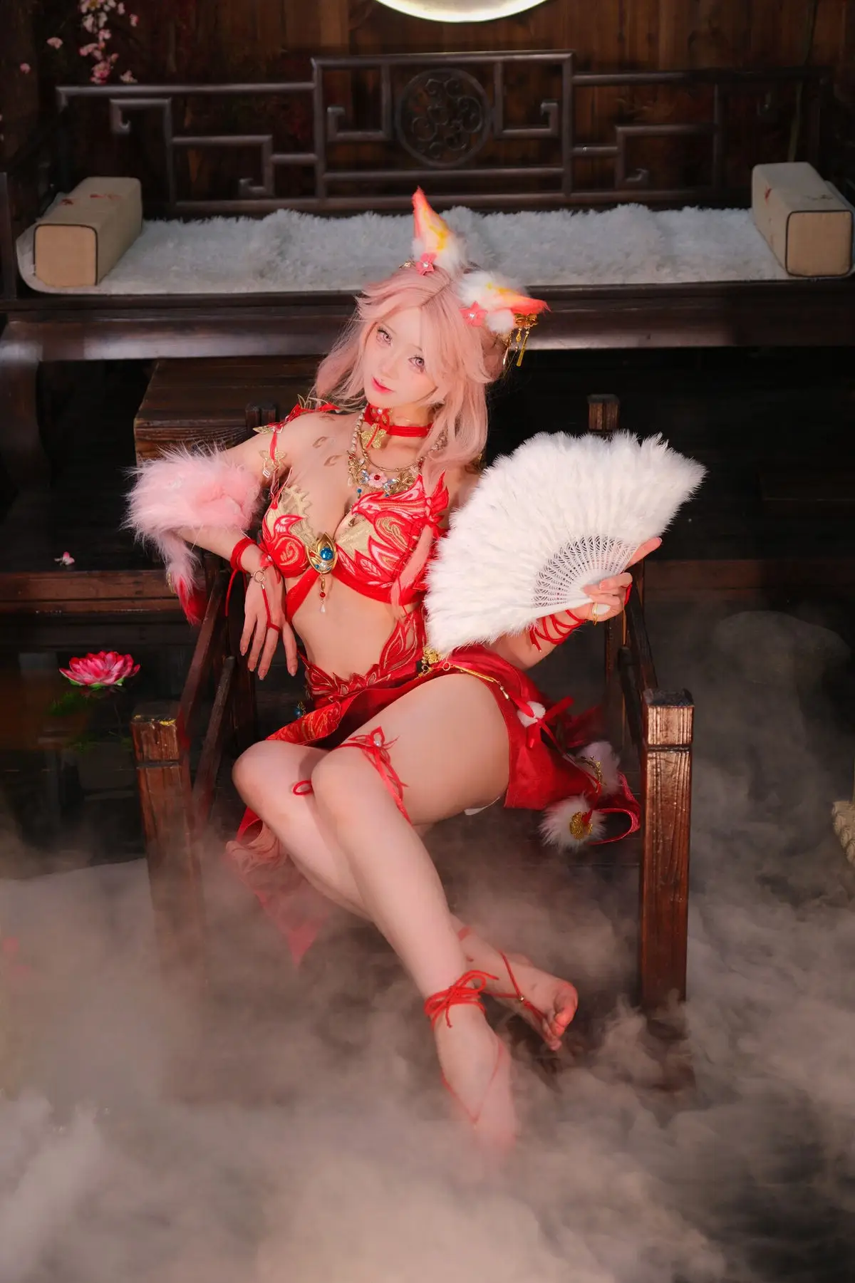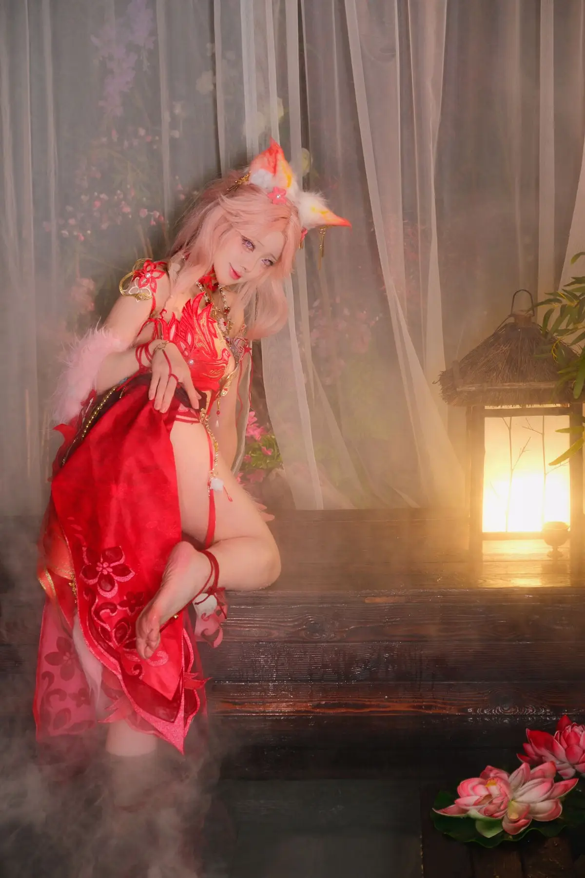 This stunning image features Coser Maeno Taita embodying Yulinglong from the game Naraka Bladepoint. She captivates in a vibrant red costume, posing gracefully with a white fan. The setting, rich in Asian aesthetic, with delicate cherry blossoms and a prominent moon motif, creates an ethereal and mysterious atmosphere. Maeno Taita perfectly portrays the fox spirit Yulinglong, exuding an alluring and enigmatic charm. Every detail, from the elaborate attire to her expressive pose, is meticulously crafted, drawing viewers into the fantastical world of Naraka Bladepoint. This impressive cosplay showcases the cosplayer's talent and dedication.#Cosplay #NarakaBladepoint #Yulinglong #MaenoTaita #AsianFantasy