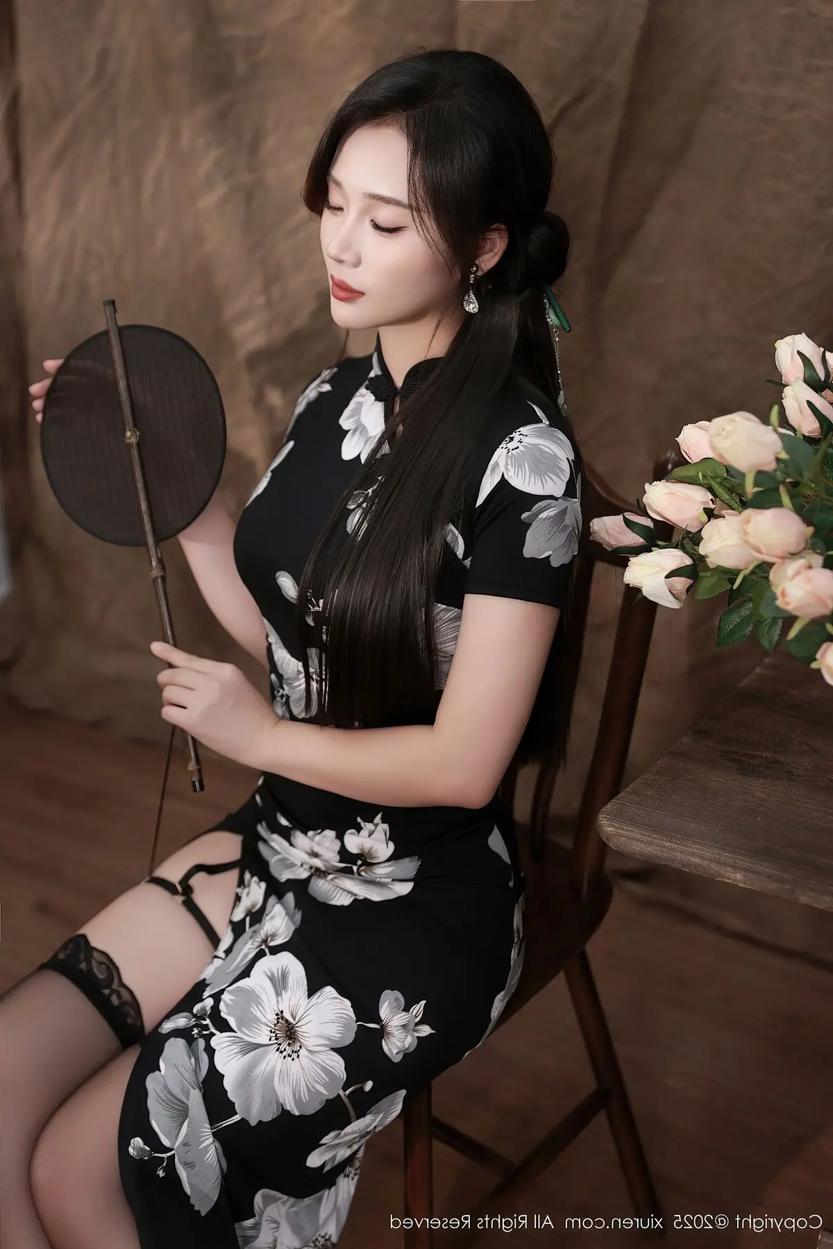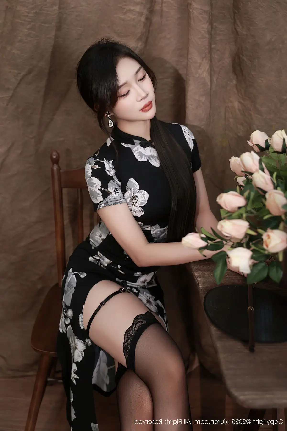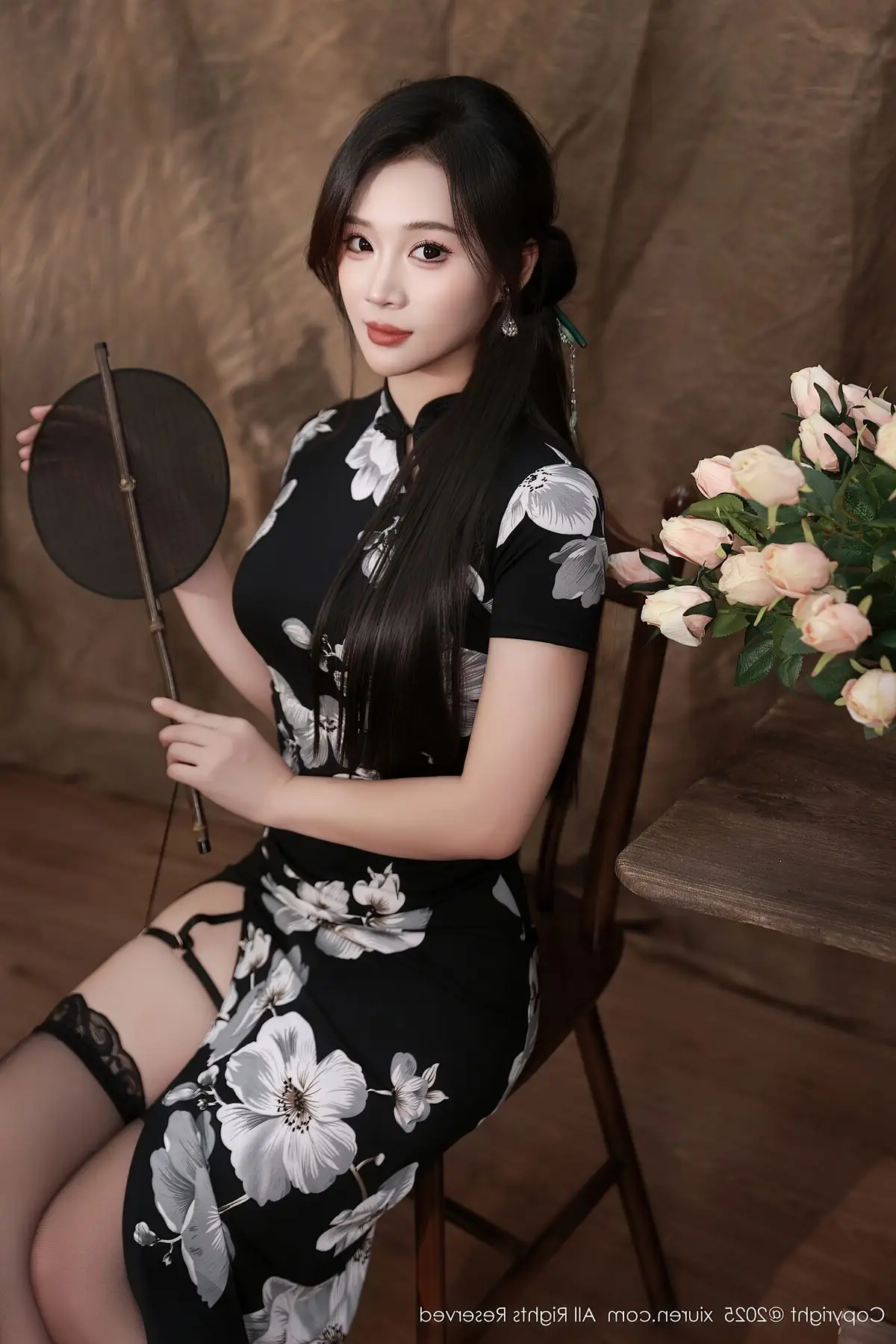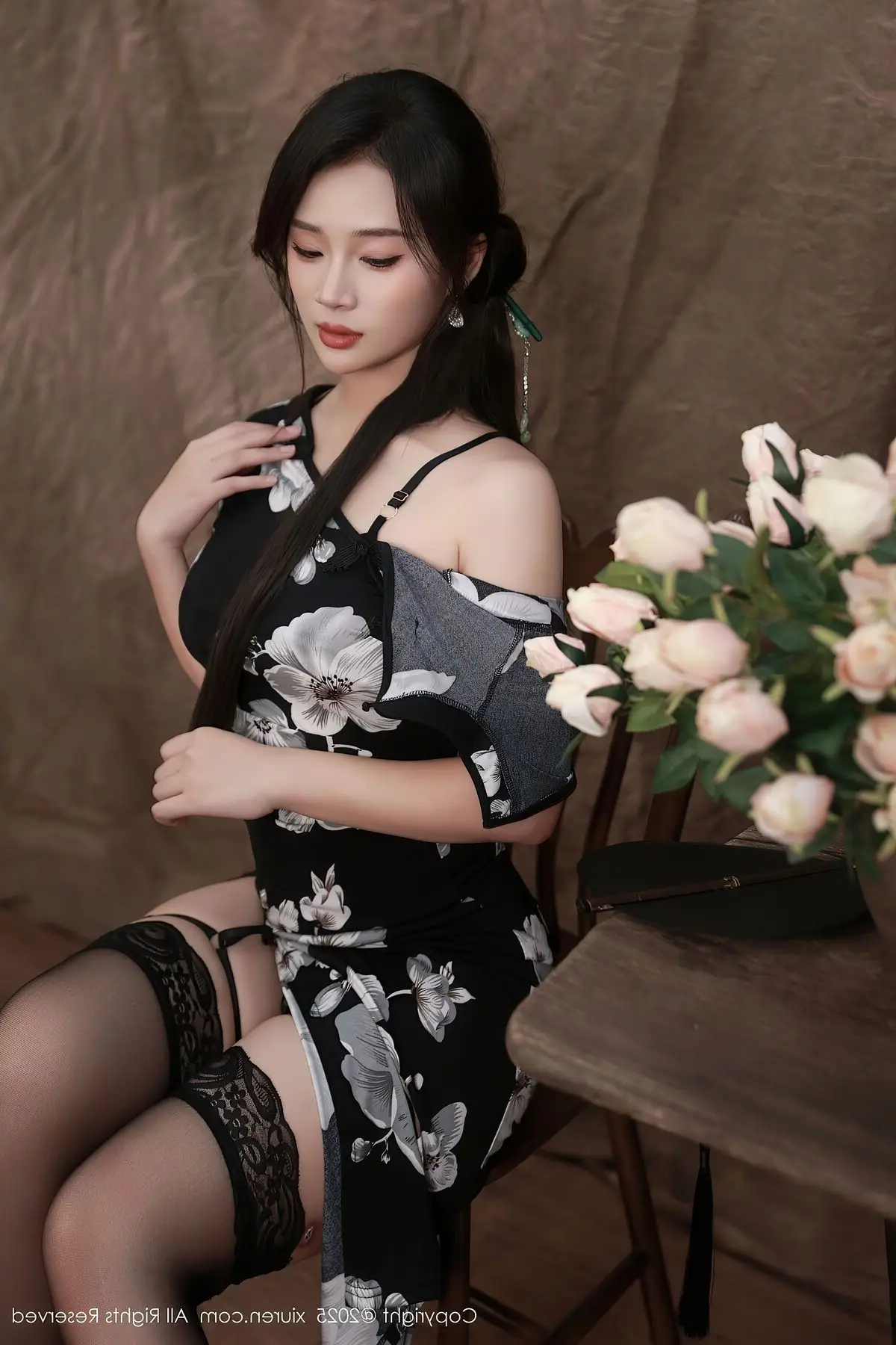 In the XiuRen No.10655 photo set, model Nan Qiao radiates with elegant and captivating beauty. She is featured in a sophisticated floral dress design with a modern oriental flair, gracefully accentuating her soft figure. The dress, adorned with delicate floral patterns on a dark background, along with its deep-cut back and slender straps, creates an alluring and seductive appeal. Nan Qiao is depicted seated gently on a wooden chair, her dreamy gaze and delicate hand gestures further enhancing her charming demeanor and captivating aura. This image not only showcases her physical beauty but also portrays a confident and mysterious elegance, making it impossible for viewers to look away. It's a truly impressive fashion display by Nan Qiao, perfectly blending traditional essence with a contemporary fashion sensibility.
