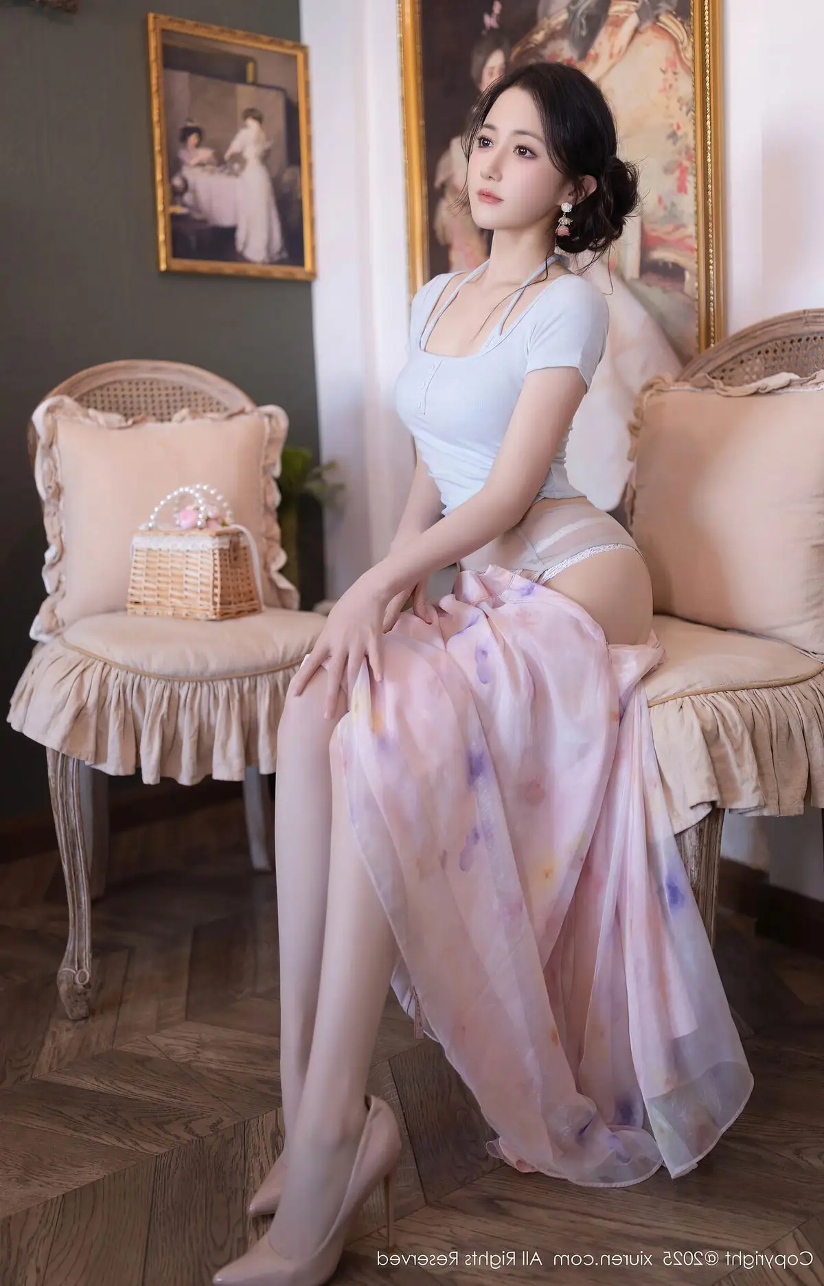 This captivating image features Chinese model Xiao Jiu from the IESS SXJ No.2110 collection, exuding an aura of graceful charm and subtle allure. Posed elegantly on the floor, her relaxed yet poised posture highlights the delicate lines of her figure. The light, patterned dress, with its gentle flow and high slit, beautifully accentuates her long, slender legs. Her direct gaze conveys confidence and a touch of mystery, drawing viewers into the scene. With one high heel on and the other casually placed beside her, Xiao Jiu embodies a blend of modern sophistication and timeless Asian beauty. This particular shot perfectly encapsulates the unique aesthetic of IESS and the undeniable talent of this remarkable Chinese model.