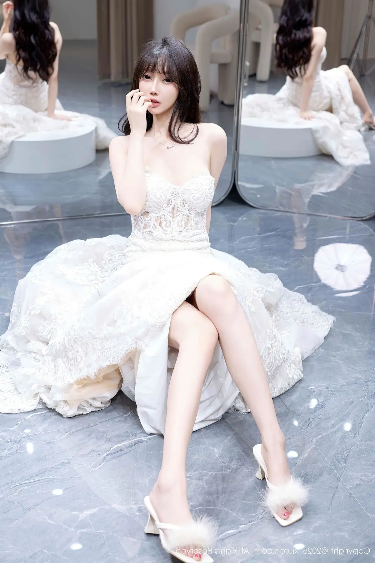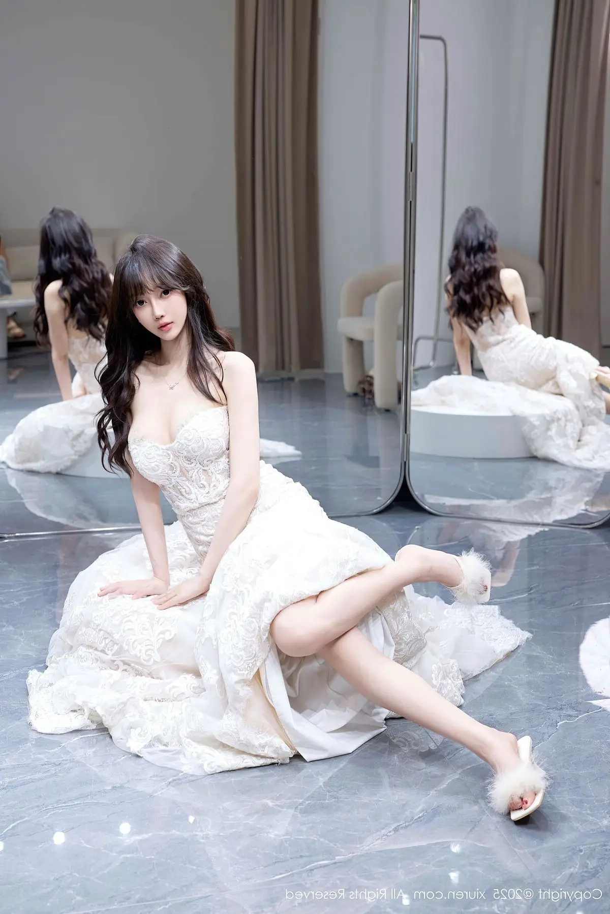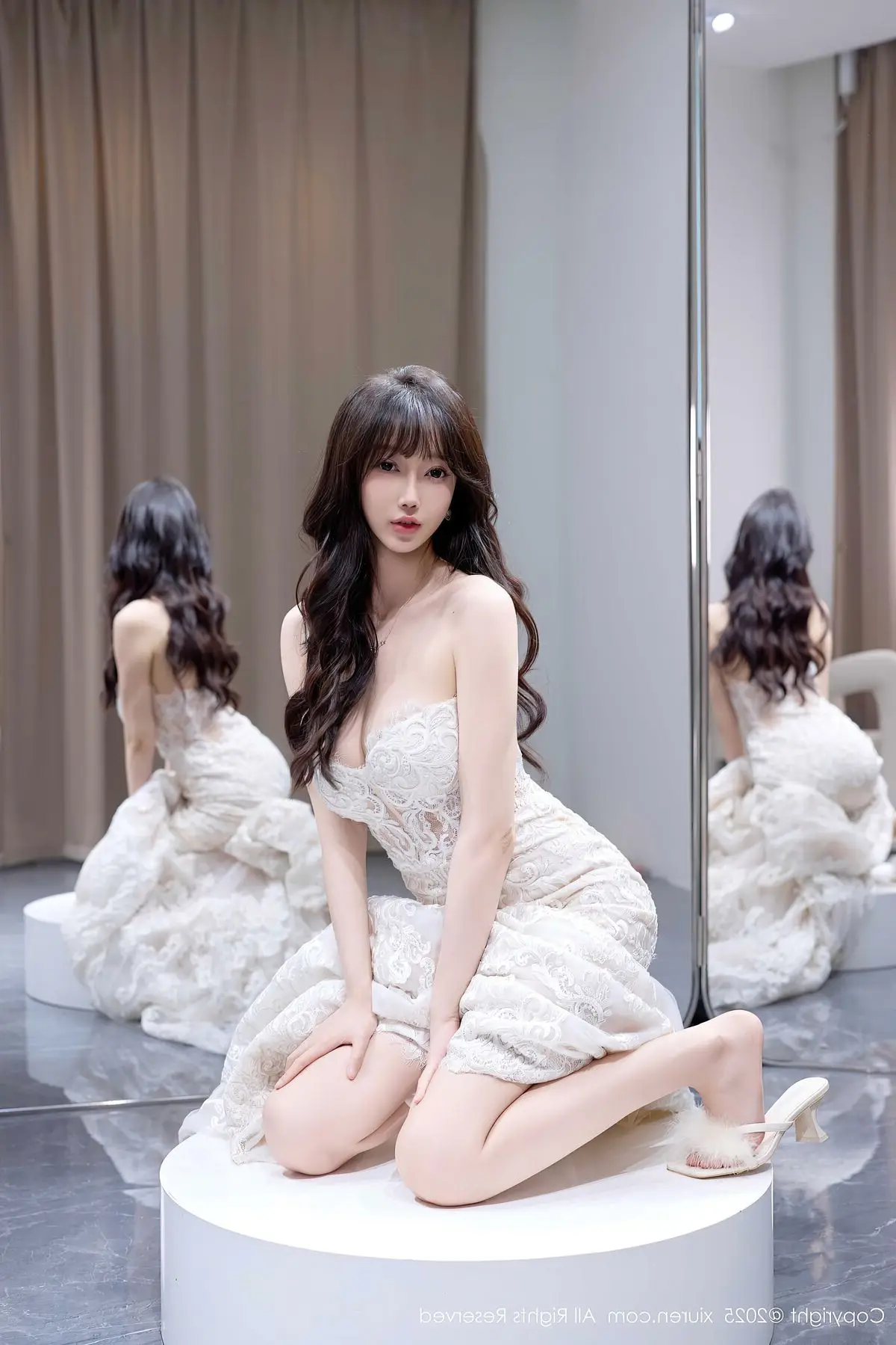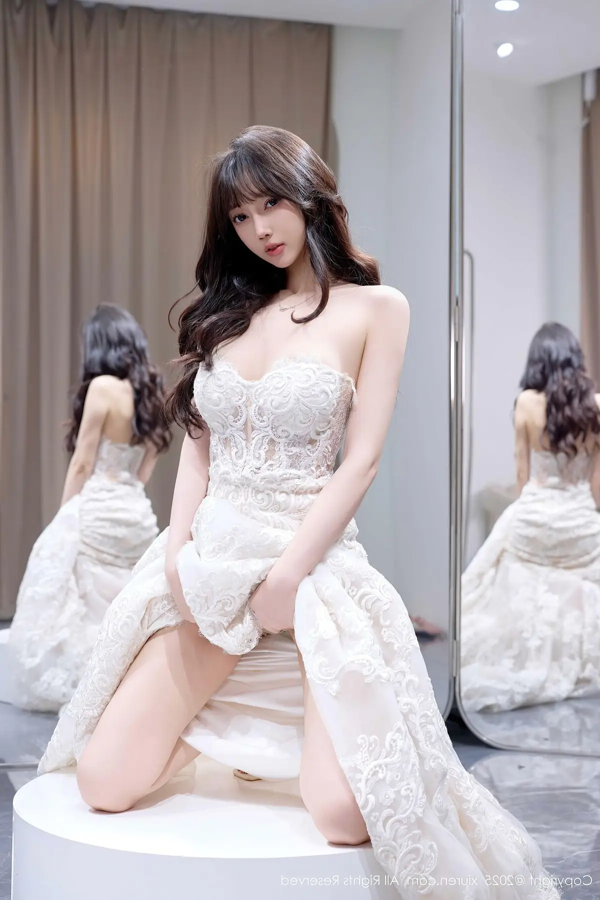 In this captivating XiuRen No10663 photoshoot Yue Er Yue Er radiates charm in a pristine white wedding gown The intricate lace details of the form-fitting dress accentuate her graceful silhouette Her alluring figure complemented by long flowing hair creates an image of timeless romance and elegance Yue Er Yue Ers gentle gaze and confident demeanor in the luxurious bridal showroom highlight her stunning beauty This collection promises unforgettable moments showcasing the grace and allure of a woman on her special day