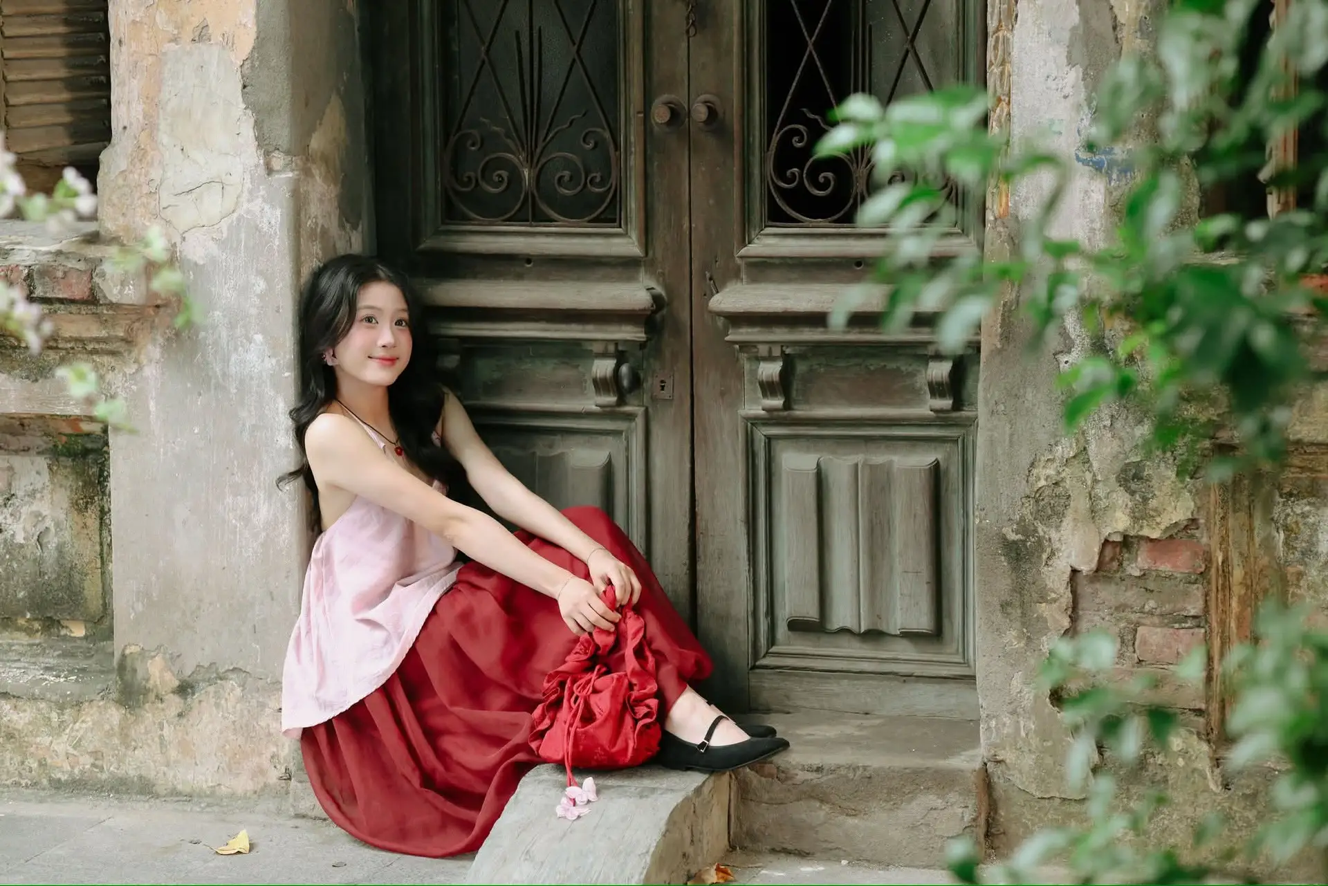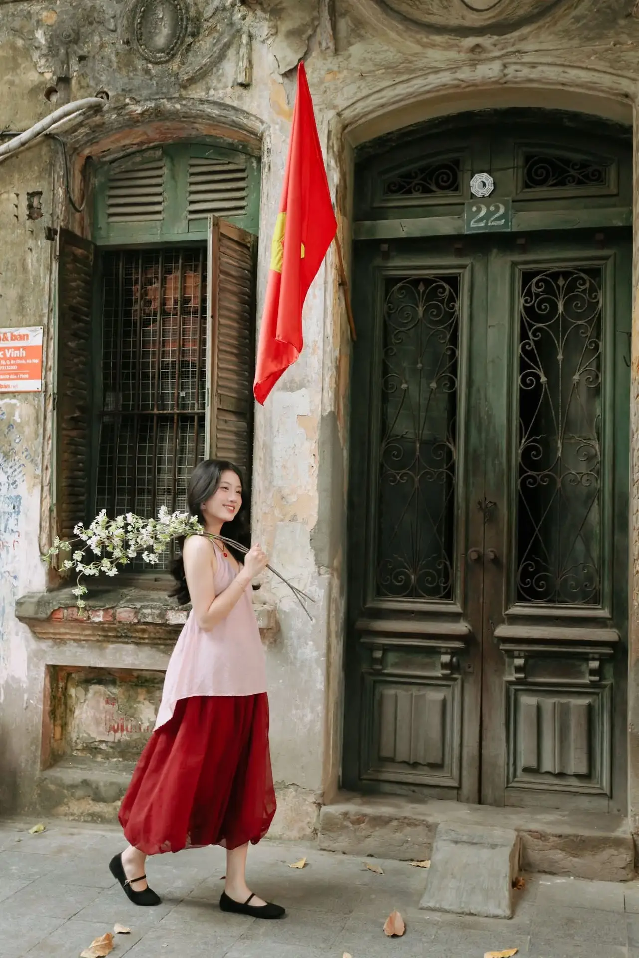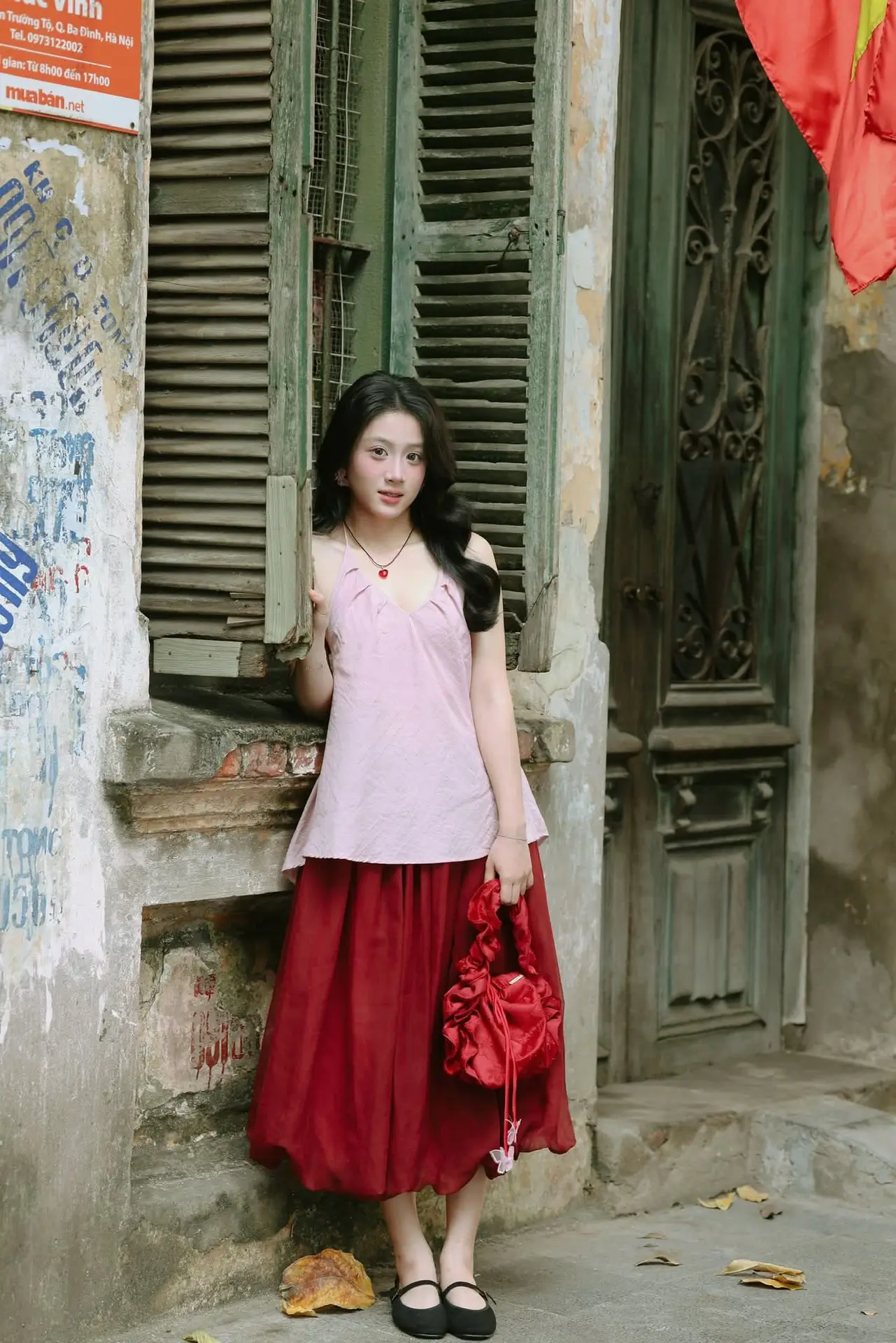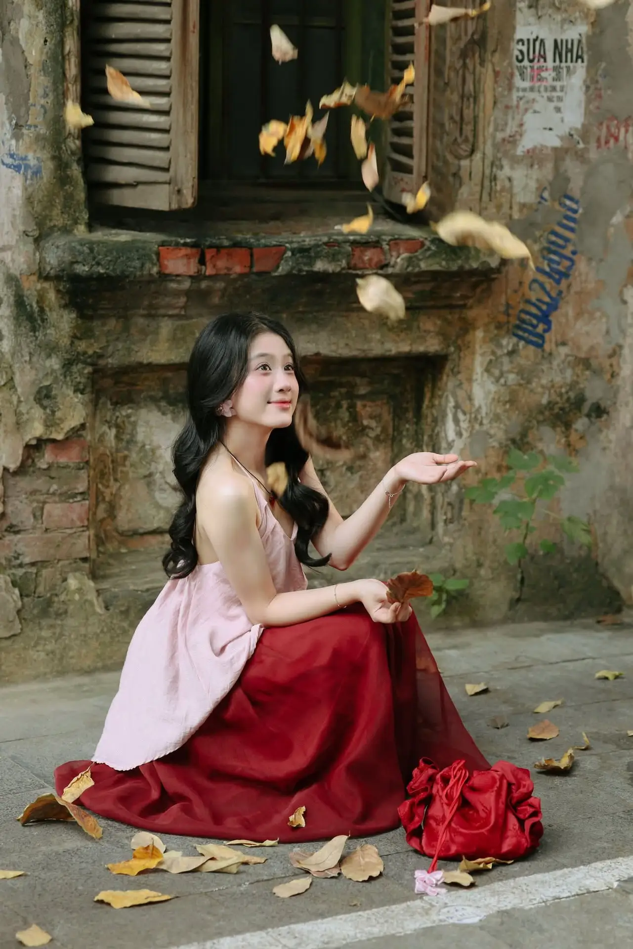 This stunning portrait captures a Vietnamese girl exuding ethereal beauty and grace She wears the traditional conical hat Nón Lá a symbol of Vietnamese culture with natural elegance highlighting her pure Asian charm Her long wavy dark hair paired with a soft pink dress and a flowing red skirt creates a harmonious blend of classic and modern styles Her clear eyes and gentle expression convey a profound sense of peace This image not only showcases her physical beauty but also evokes the characteristic elegance and demureness of Vietnamese women The blurred ancient street background further accentuates the timeless allure of this Asian muse offering a deeply emotional visual experience#VietnameseBeauty #ConicalHat #AsianMuse #VietnameseCulture #TraditionalAttire
