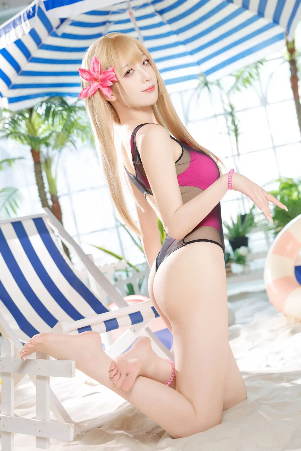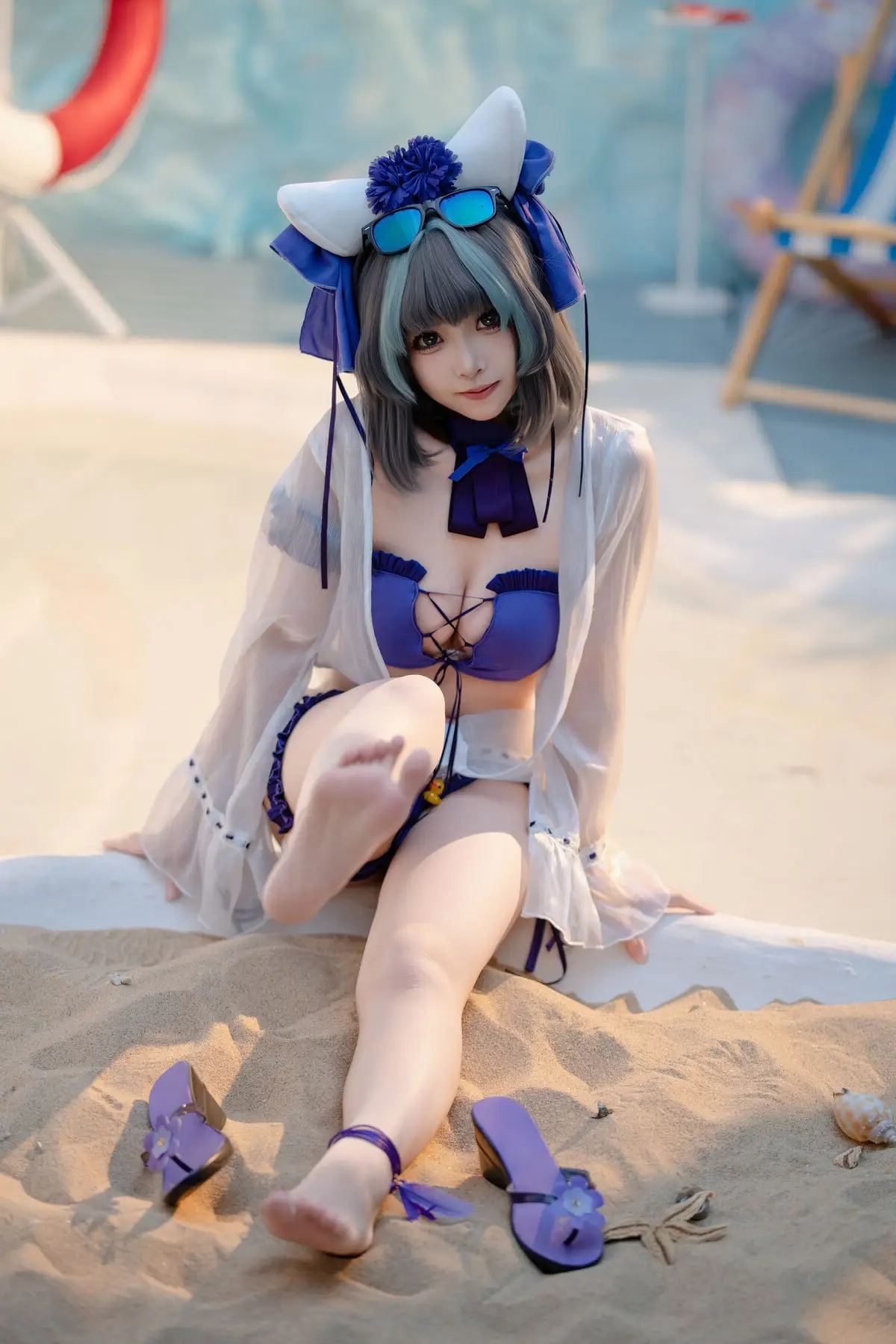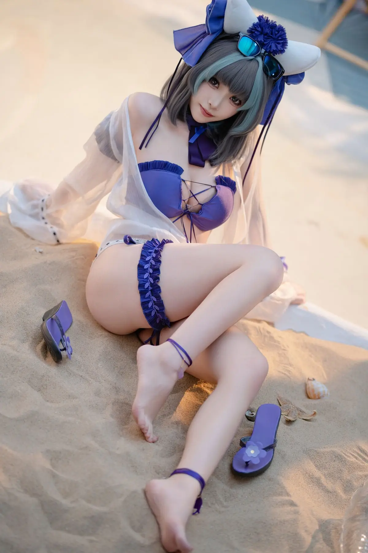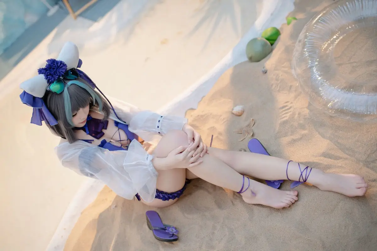 Coser Bangni (Bangni邦尼) delivers a captivating portrayal of Swimsuit Cheshire, bringing vibrant summer vibes to life. Dressed in a charming purple bikini, complete with adorable cat ears and stylish blue sunglasses, Bangni shines brightly against the golden sands of the beach. Each photograph in this extensive 87-picture collection beautifully captures her grace and alluring demeanor, transporting viewers to an idyllic summer getaway. Bangni's sweet and energetic beauty as Cheshire is sure to mesmerize, evoking a desire for clear blue waters and warm sunshine. This is a must-see photoshoot for cosplay enthusiasts and anyone who loves the essence of summer beauty.#CoserBangni #SwimsuitCheshire #AzurLaneCosplay #BeachCosplay #SummerCosplay