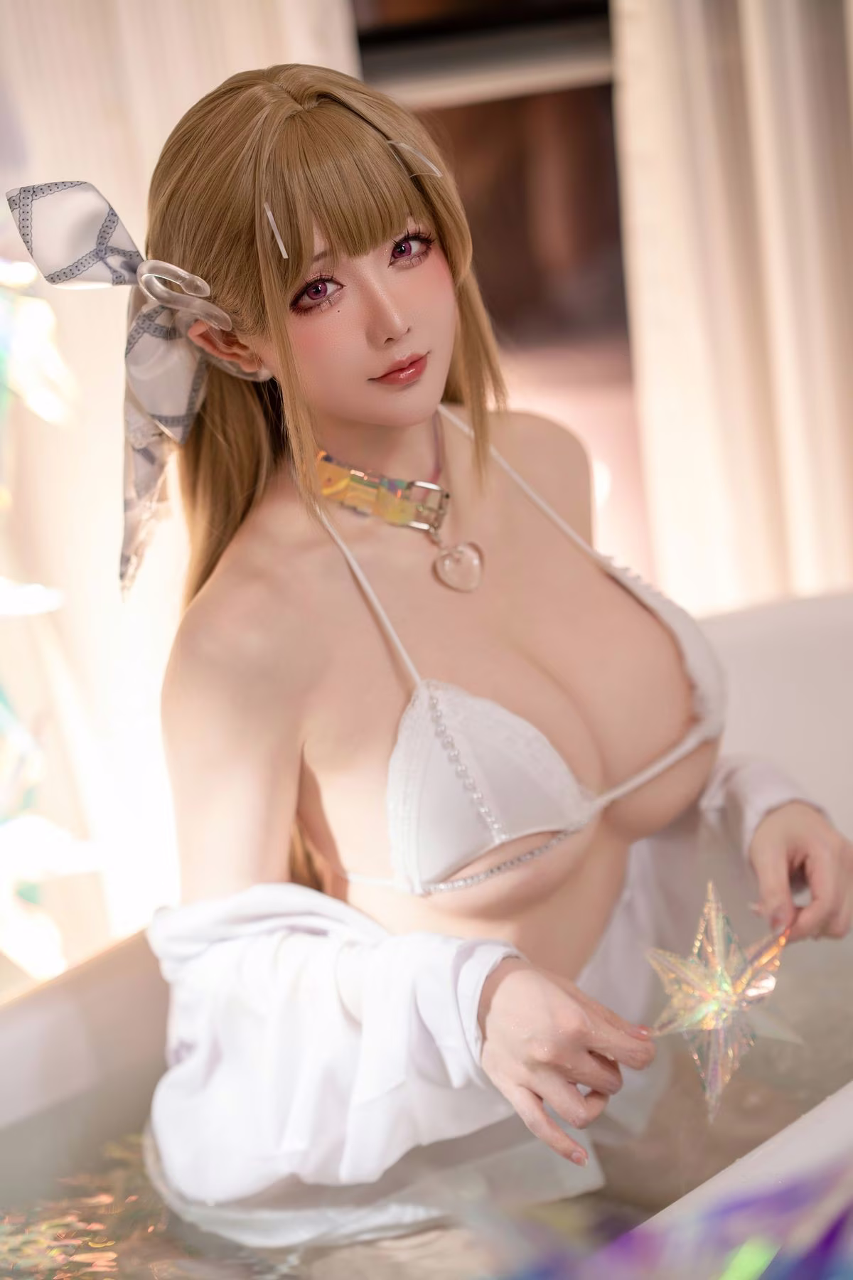 Coser Shui Miao Aqua appears enchantingly in a pristine white bikini, highlighting her graceful figure and soft curves. With long flowing dark hair and gentle eyes, she poses by the bathtub, delicately holding the showerhead, creating a moment that is both sensual and artistic. Natural light from the window behind further accentuates her pure beauty, exuding an irresistible allure. This photoshoot not only showcases Shui Miao Aqua's unique personal style but also offers deep insight into the blend of East Asian charm and modernity. Every detail, from the attire to the expression, is meticulously crafted, forming a perfect picture of grace and elegance.#Coser #ShuiMiaoAqua #WhiteBikini #AsianBeauty #SwimwearFashion #ArtisticPhotography