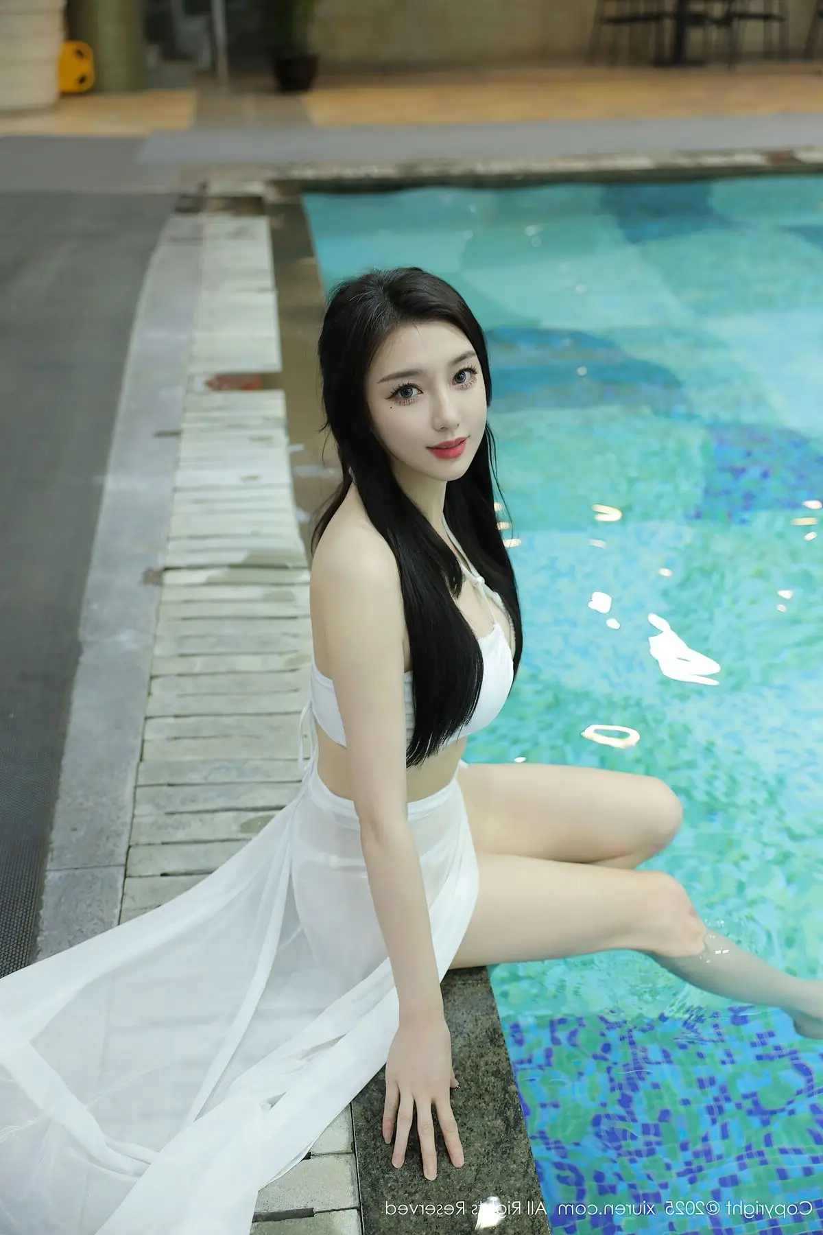 In this captivating image, model Su Yi Nuo radiates ethereal beauty by the serene blue swimming pool. She is elegantly dressed in a pristine white bikini top paired with a flowing sheer skirt, creating a look that is both alluring and sophisticated. Su Yi Nuo's direct gaze and gentle smile draw the viewer in, showcasing her confidence and graceful charm. The clear waters of the pool provide a tranquil backdrop, enhancing her natural allure and evoking a sense of relaxation and romance. This particular shot is part of a special collection from XiuRen, where Su Yi Nuo delivers memorable moments, embodying her unique and captivating style. Collection No10441 promises an enchanting visual experience.#SuYiNuo #XiuRen #White #Bikini #Poolside #Beauty #AsianModel