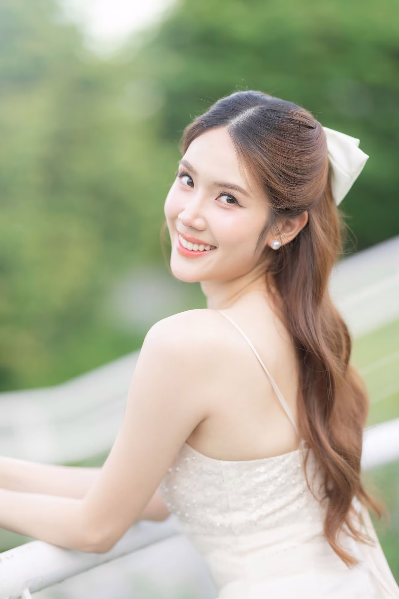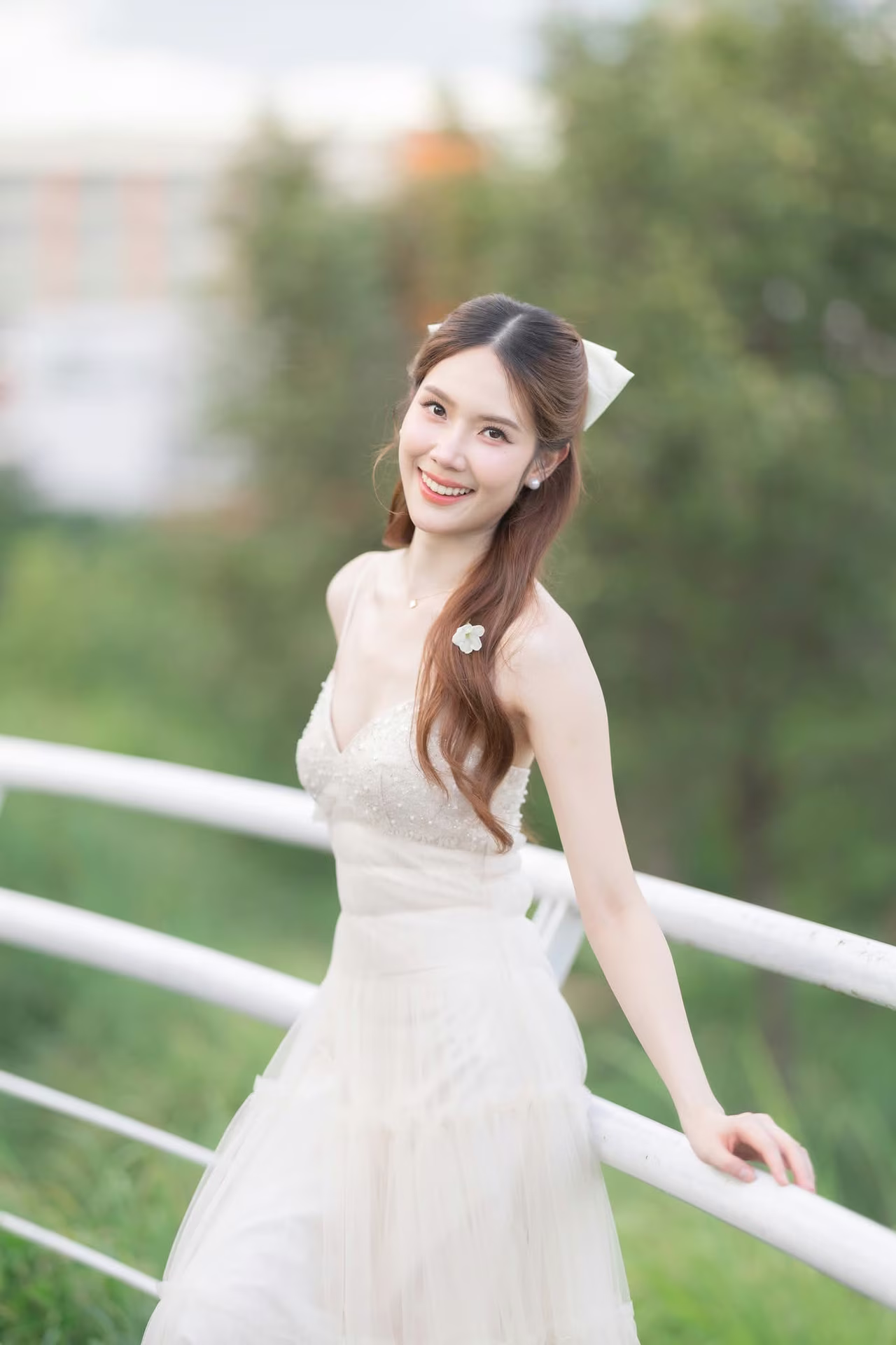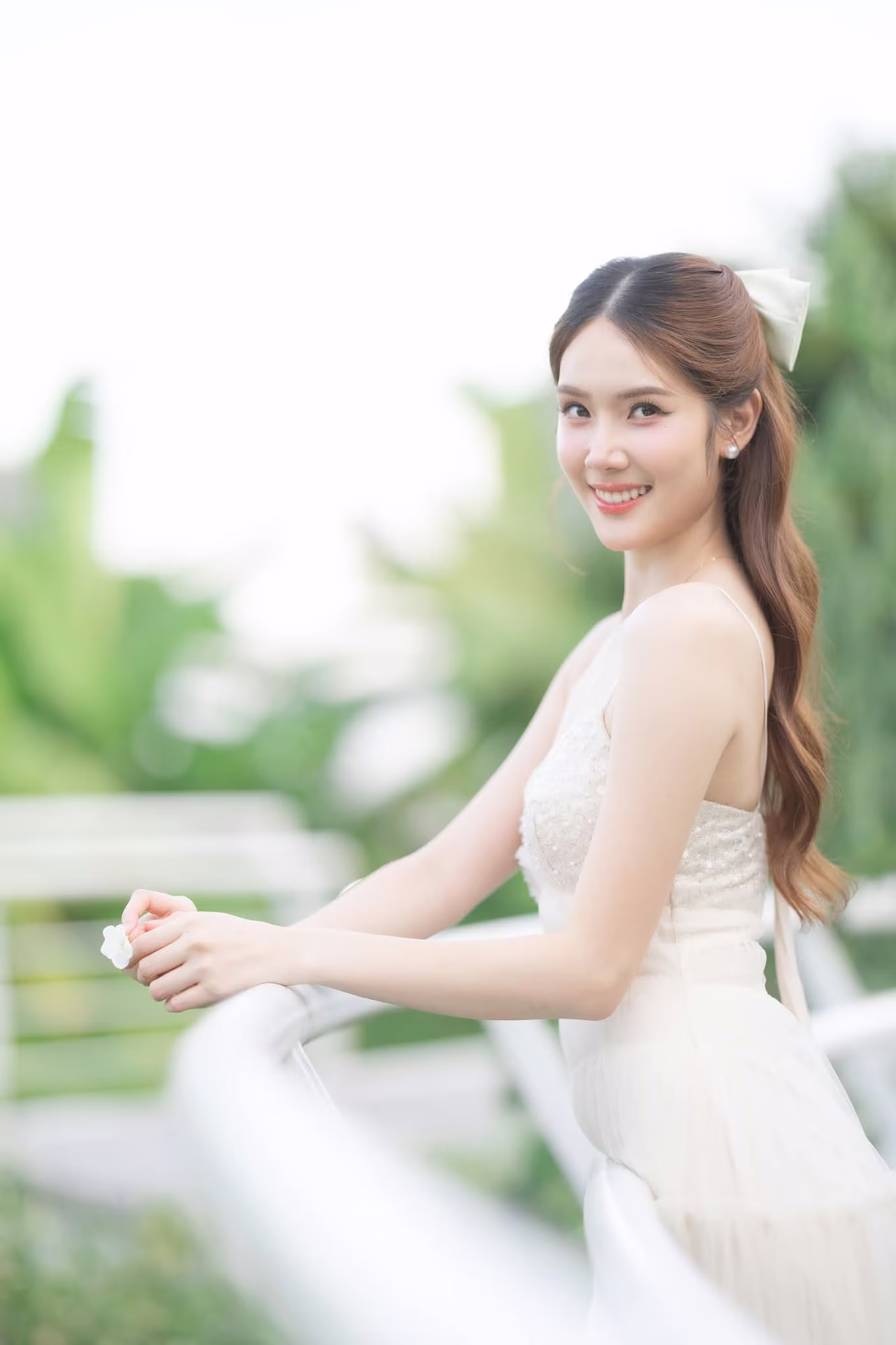 This stunning photograph captures a young woman exuding gentle beauty and refined elegance. She is adorned in a sophisticated ivory-white sleeveless dress, featuring a soft cowl neck design that gracefully highlights her slender shoulders and graceful figure. Her hair is neatly styled in an updo, complemented by sparkling earrings, creating an overall look of luxury and class. A romantic touch is added by the delicate bouquet of small pink roses she lovingly holds, symbolizing purity and affection. Her gaze, directed slightly away, carries a dreamy and serene quality, as if lost in a moment of quiet contemplation. This is more than just a portrait; it is an artistic capture where natural beauty harmonizes with exquisite style, captivating the viewer. The woman radiates an ethereal charm, evoking the image of a bride on her happiest day. #Vietnamese #pretty #charm