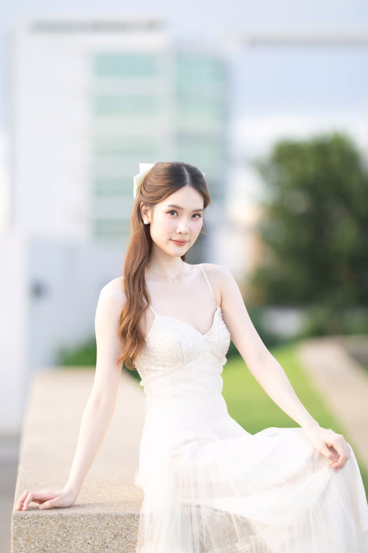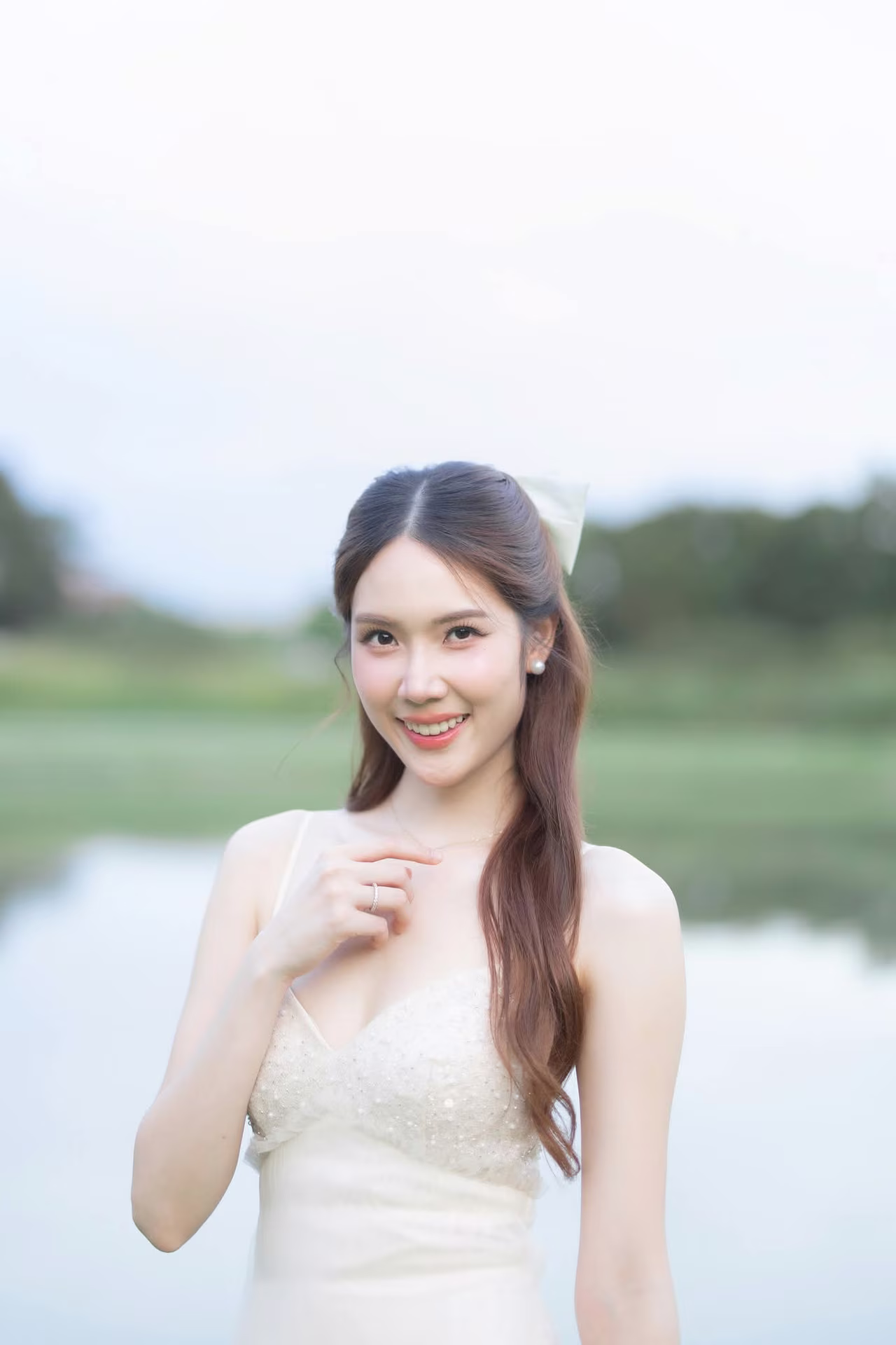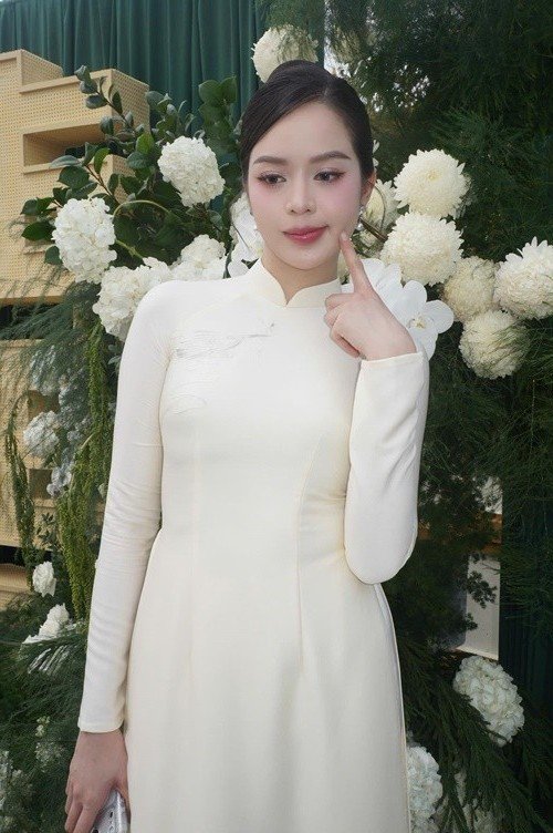 This stunning photograph captures a young woman exuding gentle beauty and refined elegance. She is adorned in a sophisticated ivory-white sleeveless dress, featuring a soft cowl neck design that gracefully highlights her slender shoulders and graceful figure. Her hair is neatly styled in an updo, complemented by sparkling earrings, creating an overall look of luxury and class. A romantic touch is added by the delicate bouquet of small pink roses she lovingly holds, symbolizing purity and affection. Her gaze, directed slightly away, carries a dreamy and serene quality, as if lost in a moment of quiet contemplation. This is more than just a portrait; it is an artistic capture where natural beauty harmonizes with exquisite style, captivating the viewer. The woman radiates an ethereal charm, evoking the image of a bride on her happiest day. #Vietnamese #pretty #charm