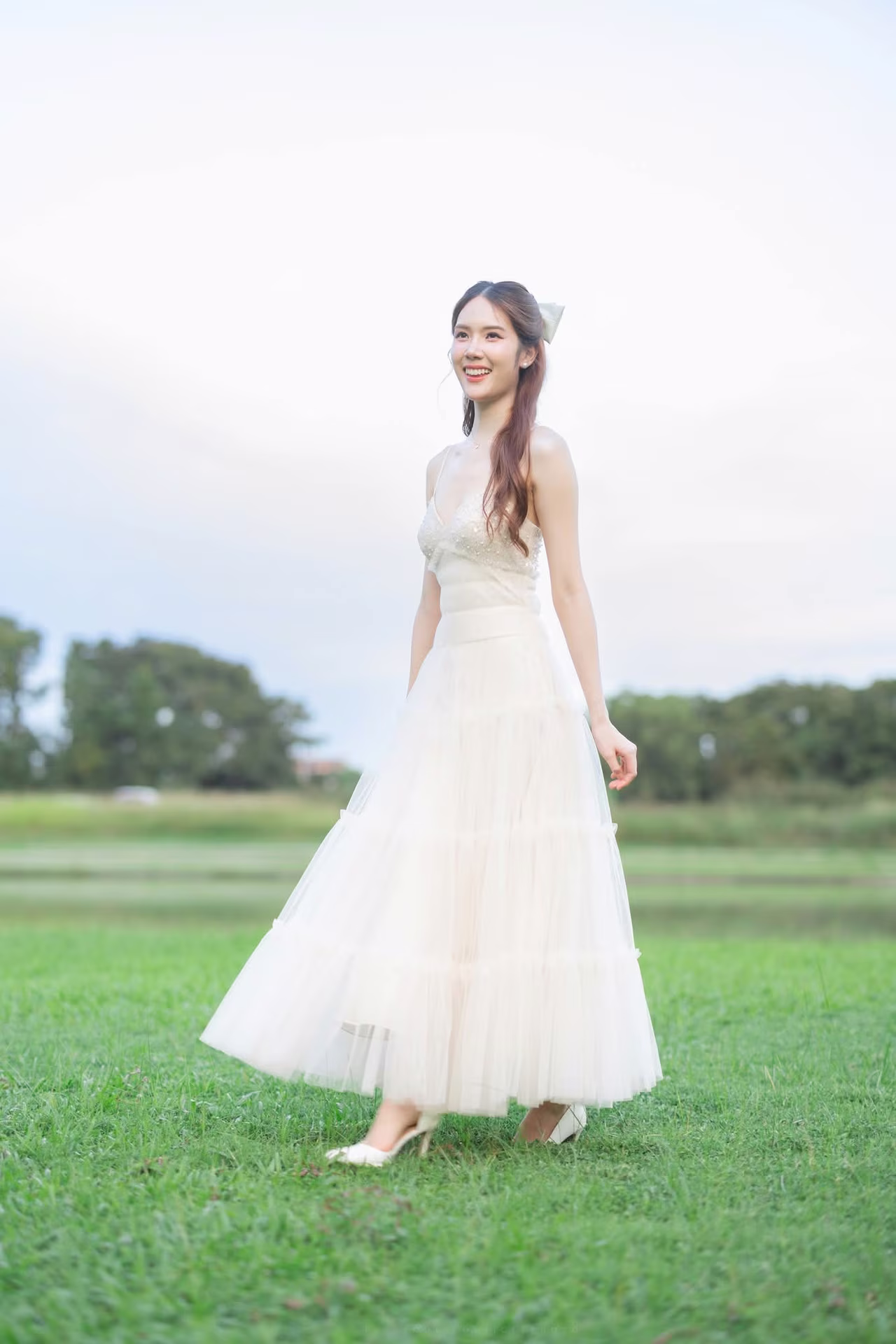 This captivating image captures a beautiful young woman in a flowing pristine white gown exuding an aura of elegance and grace Her long hair gently cascades as she gazes with a radiant joyful smile her eyes sparkling with happiness seemingly savoring every moment She stands gracefully amidst a lush green lawn under a serene sky creating a romantic and picturesque scene The natural light beautifully highlights her pure beauty and ethereal charm This photograph is more than just an image it is a narrative of joy new beginnings and the harmonious blend of natural beauty with the serene outdoor environment