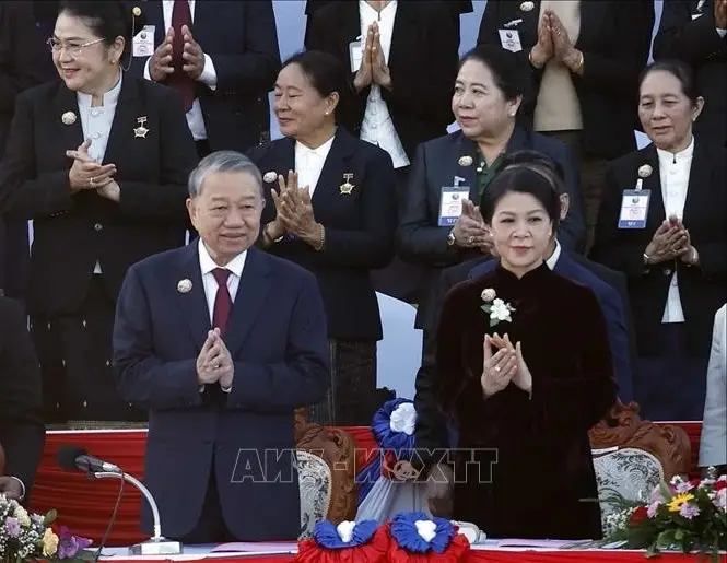 This stunning image captures a solemn and proud moment during the 50th National Day celebration of the Lao People's Democratic Republic. At the historic ThatLuang Square in the capital Vientiane, thousands of citizens and dignitaries gathered to witness the magnificent military and civilian parade. Contingents of soldiers, splendid floats, and parade participants showcased the spirit of unity, strength, and national pride of the Lao people. This event is not just a 50th National Day commemoration but also a vivid testament to the brilliant development and firm independence journey of the Land of a Million Elephants. The atmosphere was solemn yet filled with joy and hope for a bright future.#LaosNationalDay #50YearsLaosIndependence #VientianeParade #ThatLuangSquare #LaoPDR