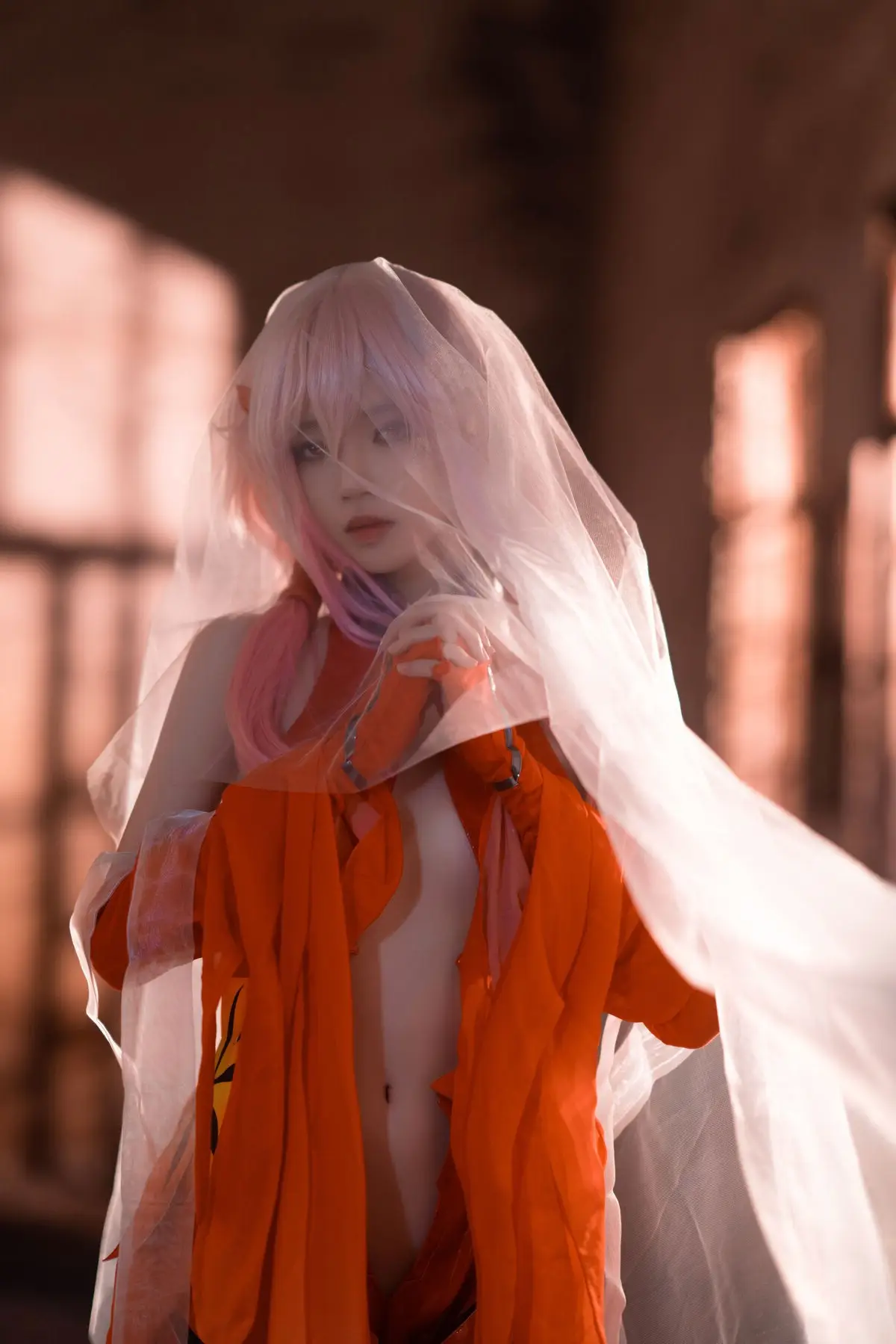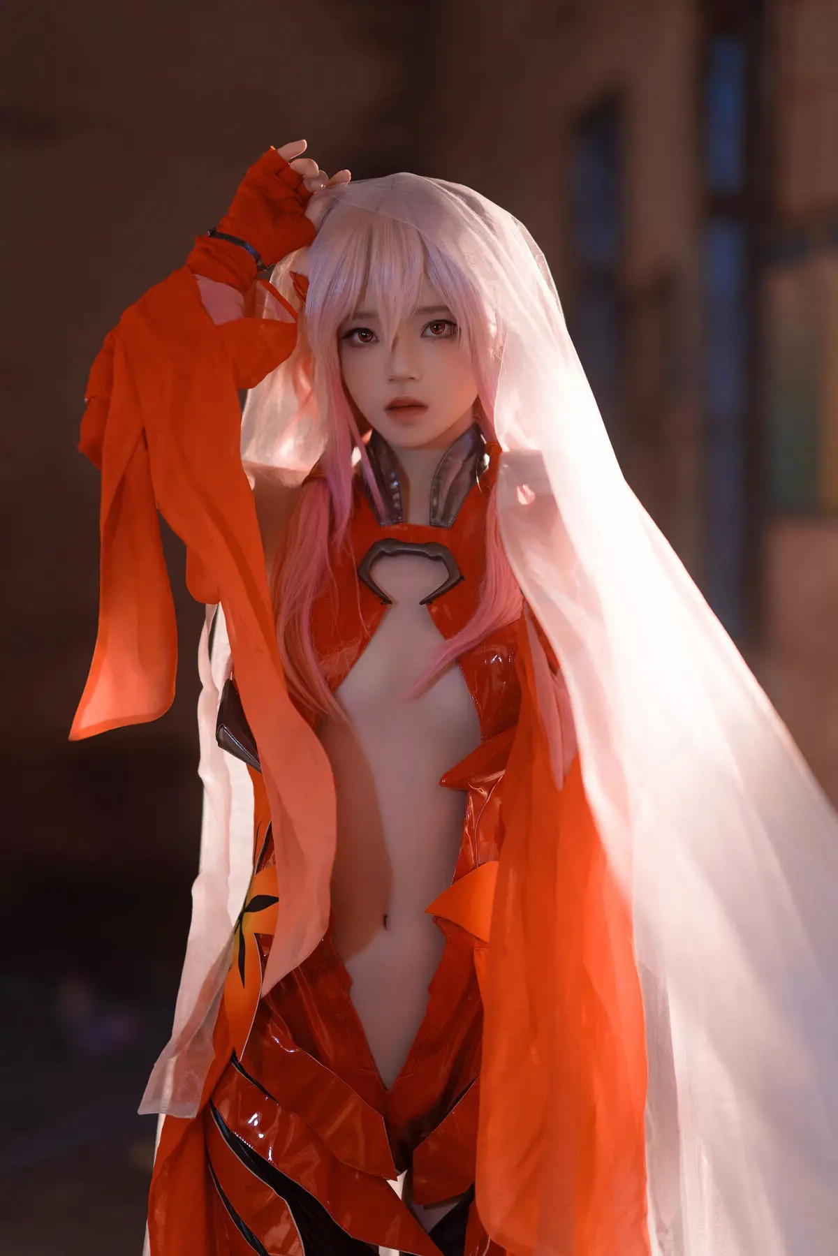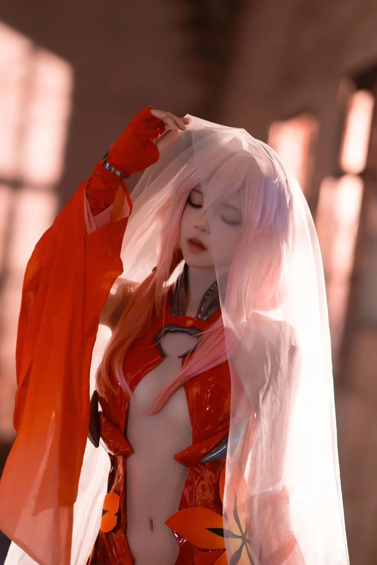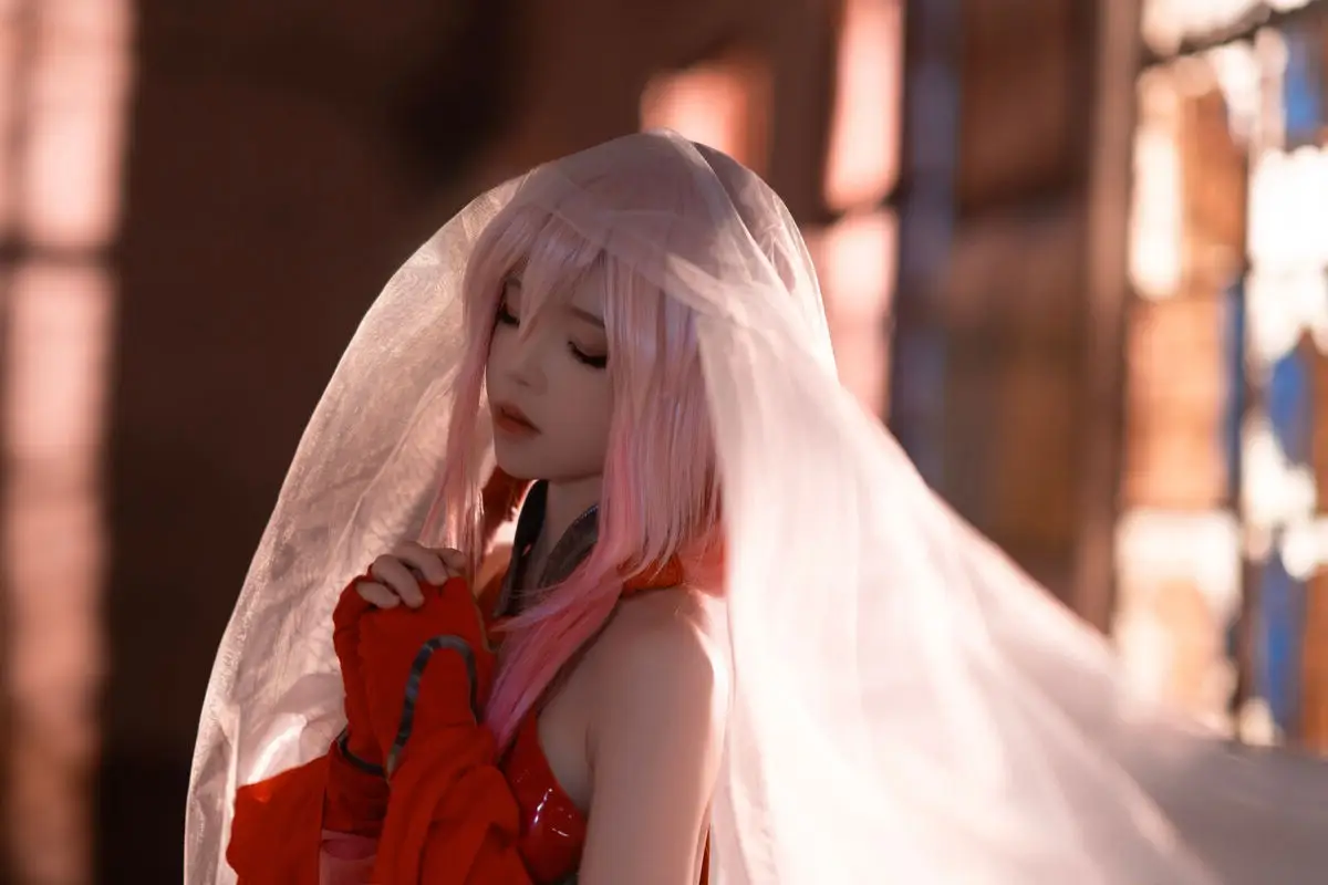 Coser 桜桃喵 masterfully brings Inori Yuzuriha from Guilty Crown to life, presenting a vibrant and enchanting portrayal. Her rendition, featuring Inori's signature pink hair and flowing red attire, perfectly encapsulates the character's ethereal and mysterious charm. The image, set against a dramatic backdrop of a dilapidated structure, creates a striking contrast that highlights Inori's fragile yet resilient presence. Every detail, from the intricate costume to the subtle expression, is meticulously crafted, conveying the depth and emotion of 楪祈. This breathtaking piece of cosplay artistry captivates viewers and flawlessly reinterprets the world of Guilty Crown.