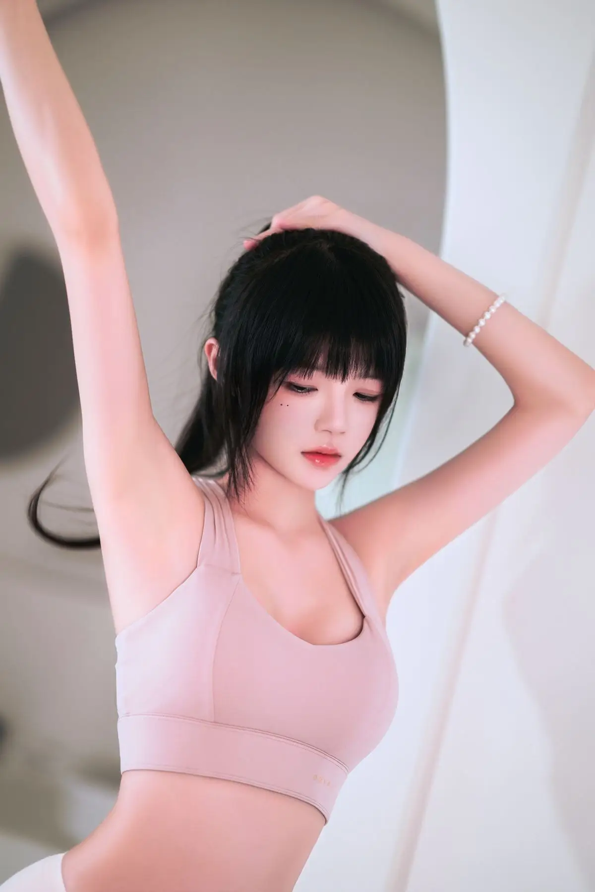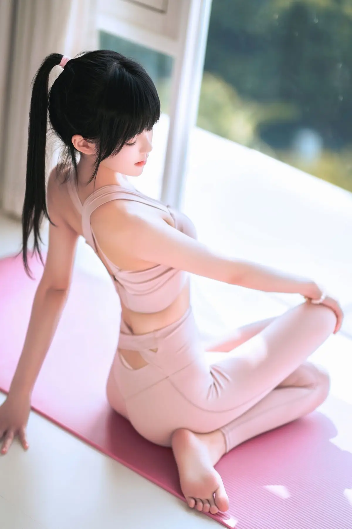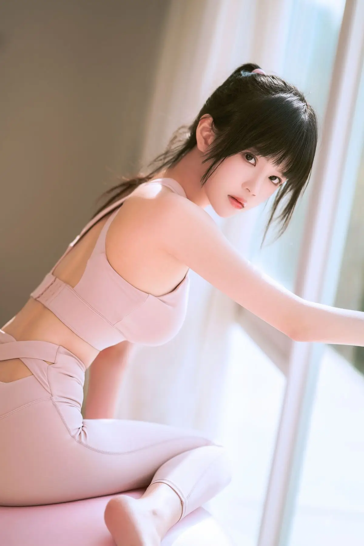 This captivating image features Coser@Cherry Meow (桜桃喵) in a delicate pastel pink yoga outfit. She gracefully poses on a matching pink exercise ball, radiating an ethereal beauty and healthy glow. Soft natural light from the window highlights her fair skin and silky dark hair. With a direct and expressive gaze, Coser@Cherry Meow conveys a sense of serene confidence. The form-fitting yoga wear accentuates her balanced physique, hinting at an active and vibrant lifestyle. This portrayal is not just about fashion; it's an inspiring glimpse into balance, natural elegance, and the allure of a fit persona.