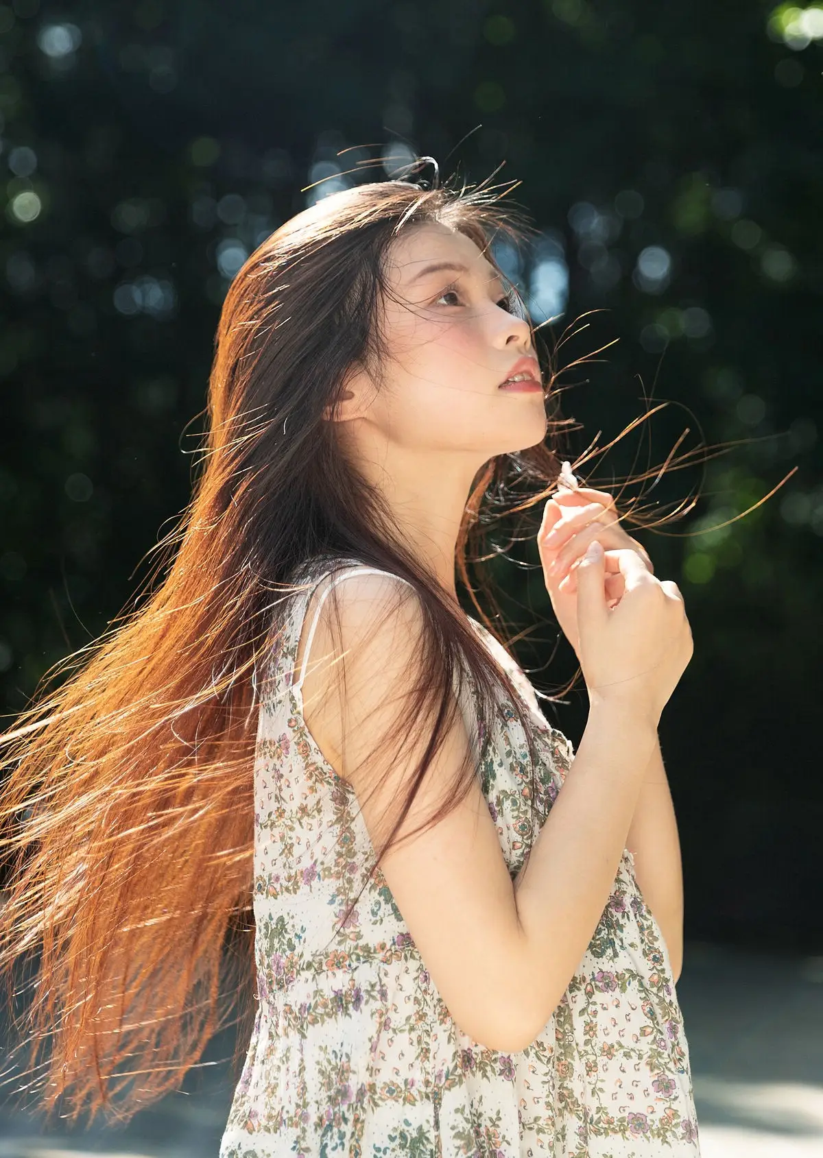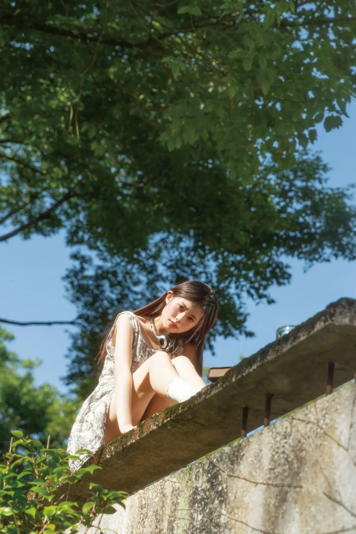 This captivating image captures Kikooo's vibrant spirit in the YiTuYu Vol.8664 collection. The young model radiates a fresh and natural beauty embodying the lively energy of summer. Dressed in a simple white t-shirt she playfully shields her eyes from the sun creating an endearing and charming pose. The urban backdrop featuring lush green trees and distant buildings beautifully contrasts with her serene presence highlighting a harmonious blend of human grace and city life. Every gesture and glance from Kikooo exudes an alluring charm inviting viewers to immerse themselves in this emotionally rich artistic world. This photograph truly embodies YiTuYu's Art Language perfectly showcasing youthful freshness and vitality.#Kikooo #YiTuYu #SummerVibes #NaturalBeauty #UrbanPortrait