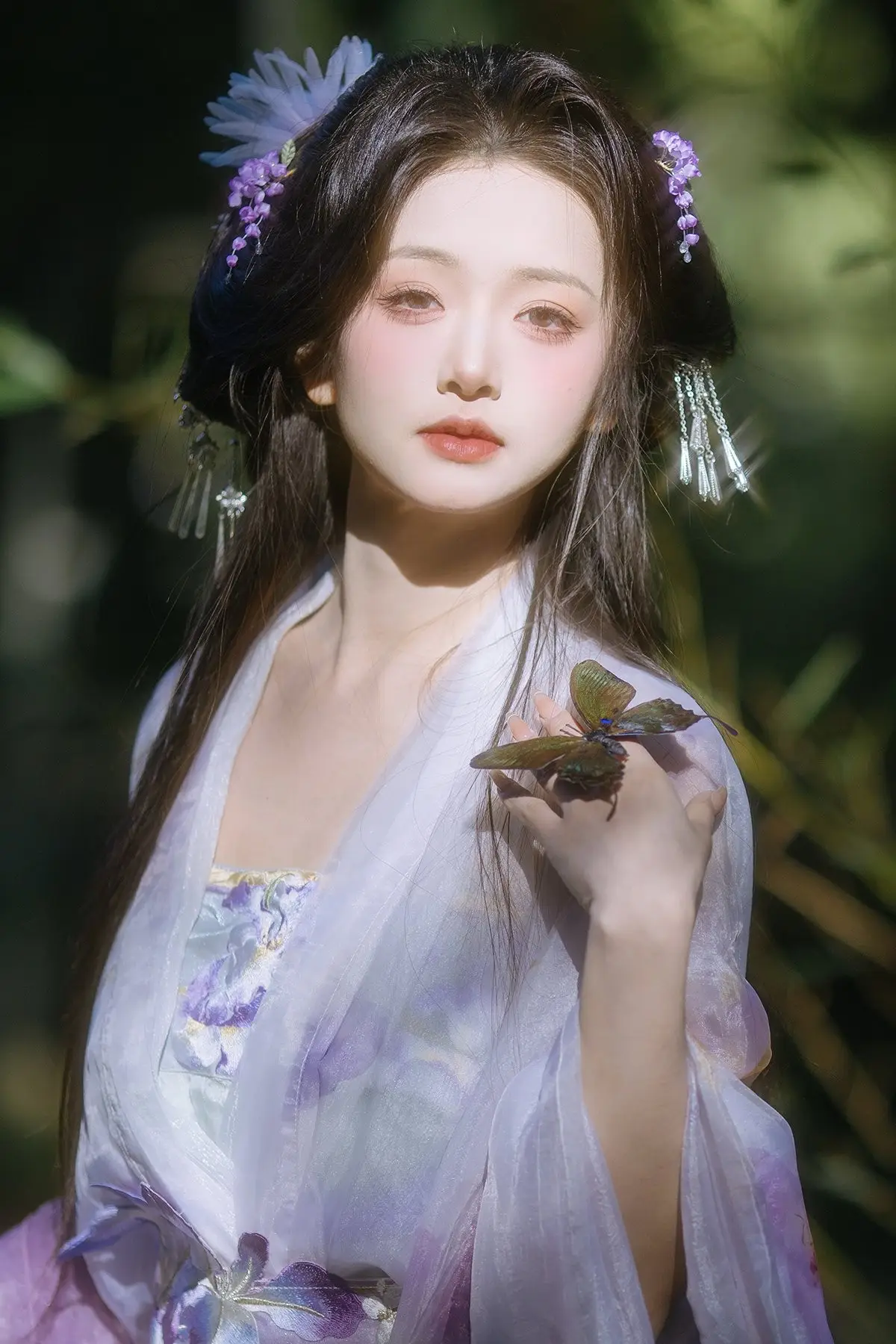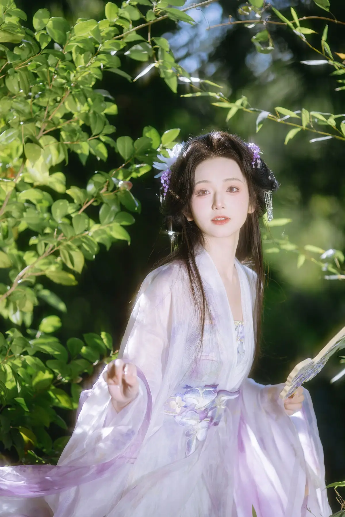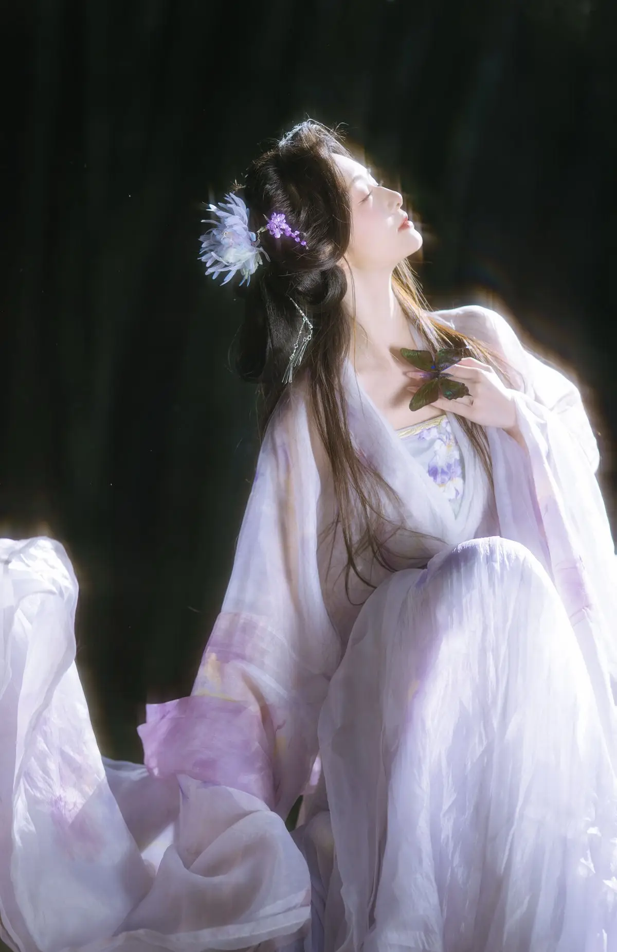 In the YiTuYu Vol.8633 Chi Yan Zai Zhe Li collection, this image unveils a captivating and dreamy world. The main character appears with a pure and graceful beauty akin to a fairy. She is adorned in a light white and purple ancient costume, flowing elegantly and accentuating her delicate figure. Her long hair is intricately styled, adorned with a pristine white feather, creating an artistic touch. Soft light from above illuminates her refined facial features and an aura that is both contemplative and serene. With her gaze directed upwards, she seems to be listening to the call of the universe or immersed in the tranquility of an enchanted forest. This is truly the image of a fairy wandering through the deep woods, embodying pure beauty and an irresistible mystery.#ChiYan #ZaiZheLi #YiTuYu #AncientFairy #AsianBeauty #MysticalNature