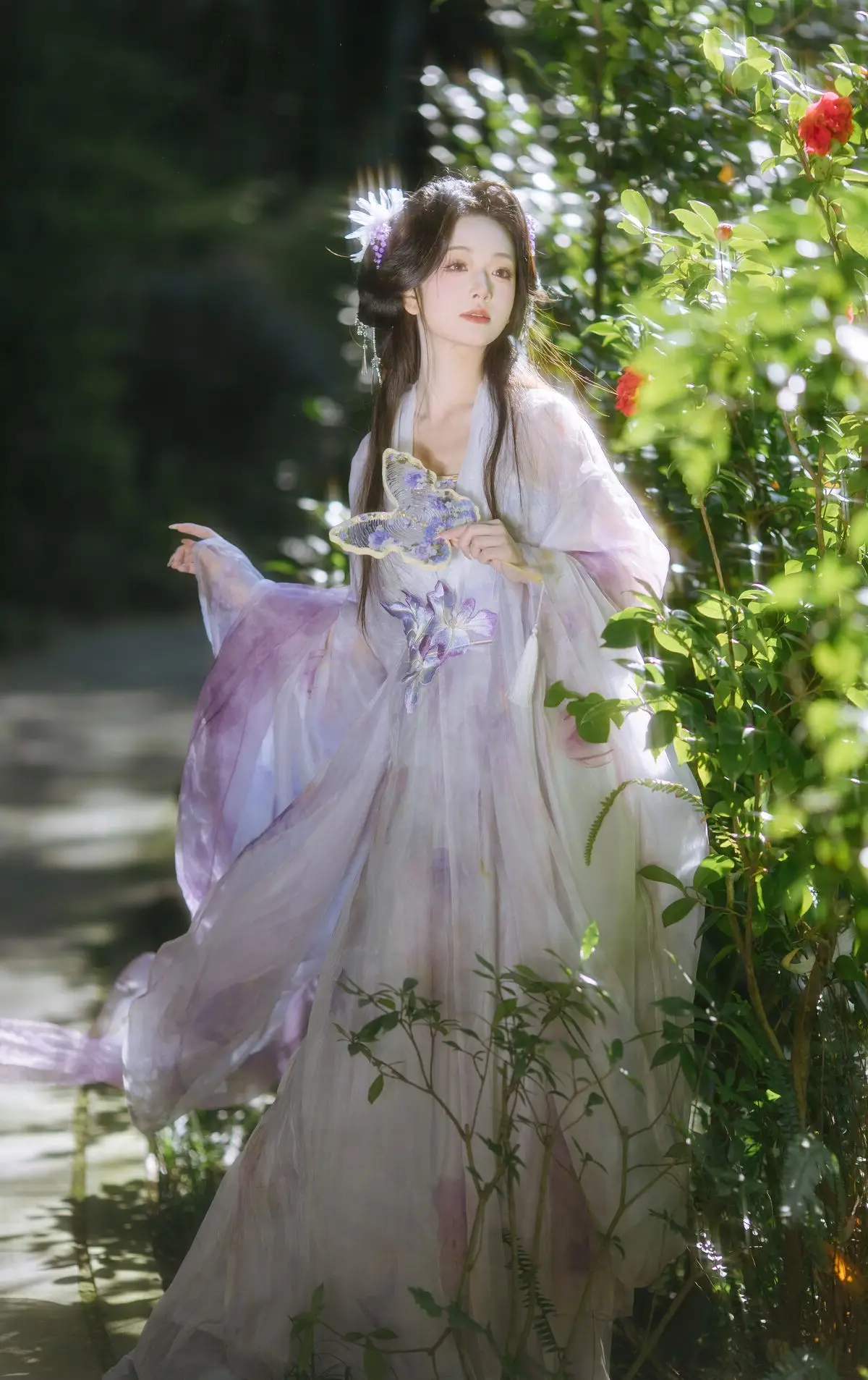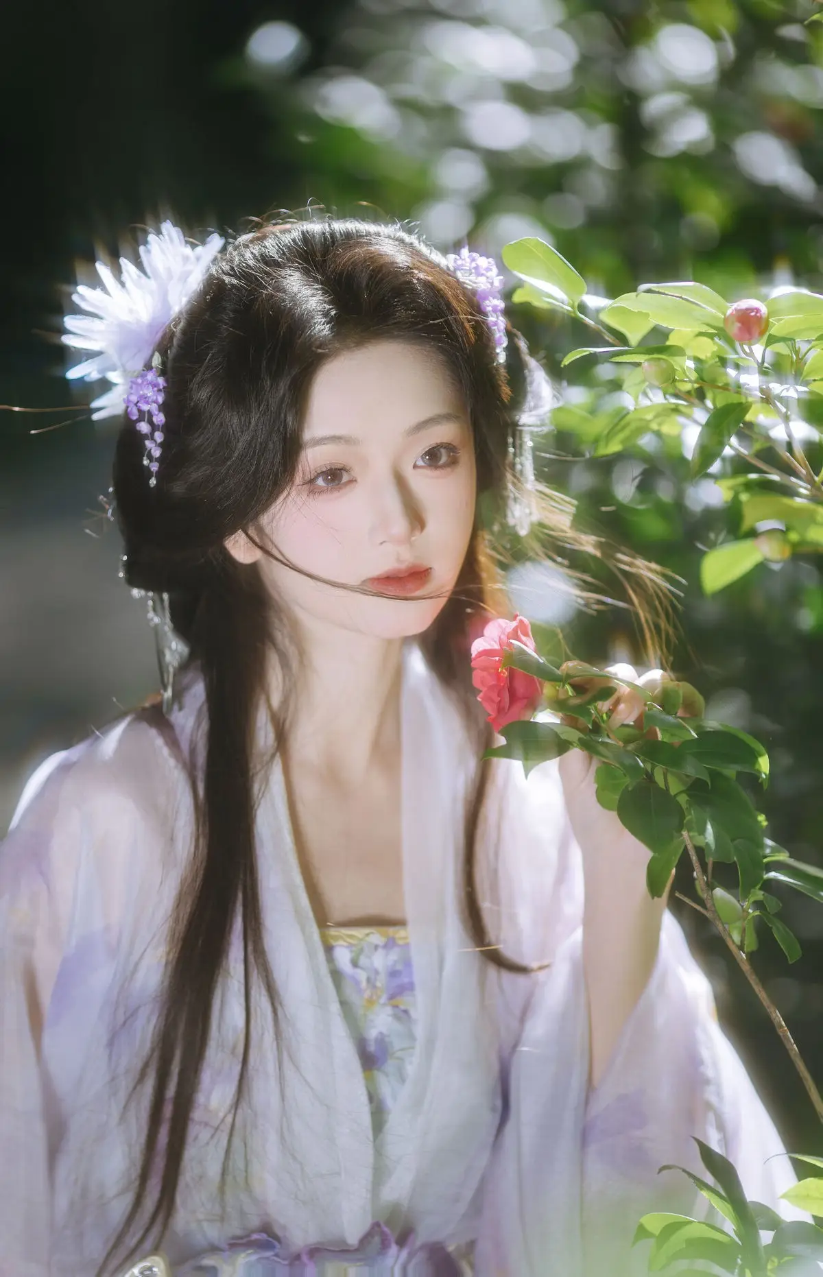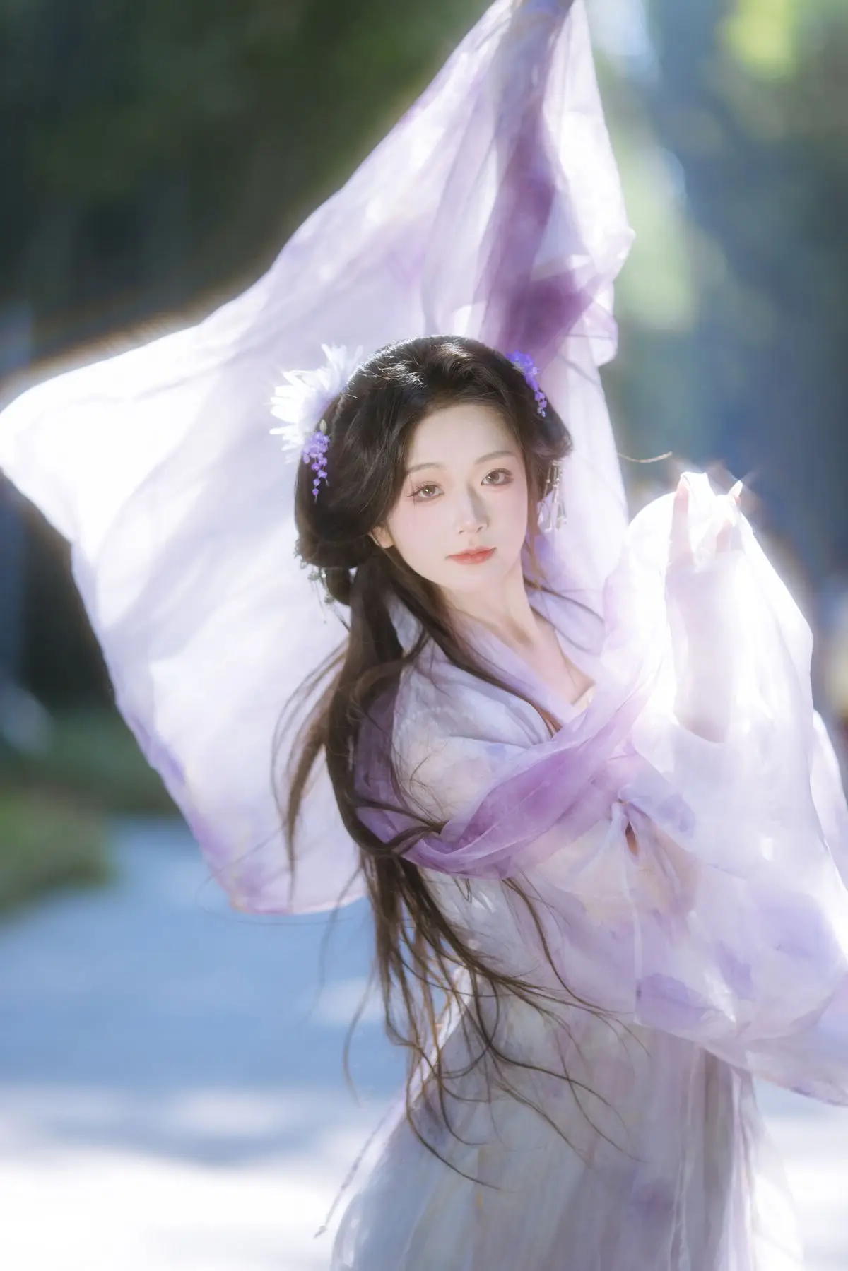 In the YiTuYu Vol.8633 Chi Yan Zai Zhe Li collection, this image unveils a captivating and dreamy world. The main character appears with a pure and graceful beauty akin to a fairy. She is adorned in a light white and purple ancient costume, flowing elegantly and accentuating her delicate figure. Her long hair is intricately styled, adorned with a pristine white feather, creating an artistic touch. Soft light from above illuminates her refined facial features and an aura that is both contemplative and serene. With her gaze directed upwards, she seems to be listening to the call of the universe or immersed in the tranquility of an enchanted forest. This is truly the image of a fairy wandering through the deep woods, embodying pure beauty and an irresistible mystery.#ChiYan #ZaiZheLi #YiTuYu #AncientFairy #AsianBeauty #MysticalNature
