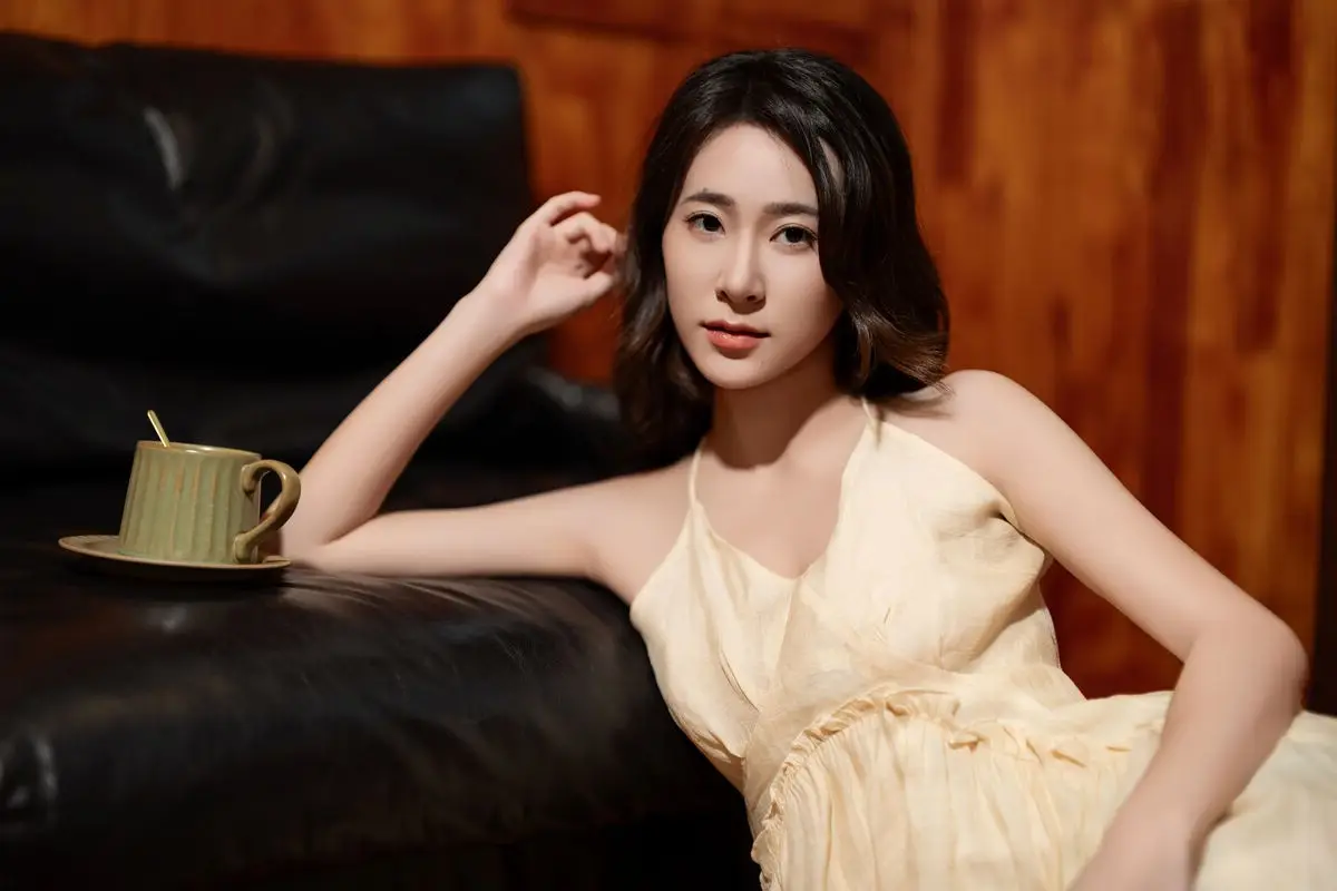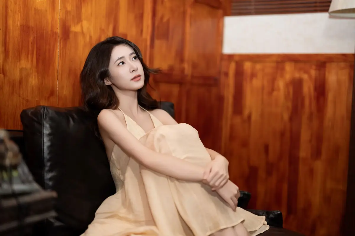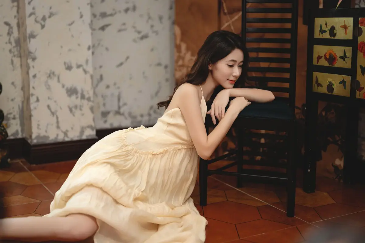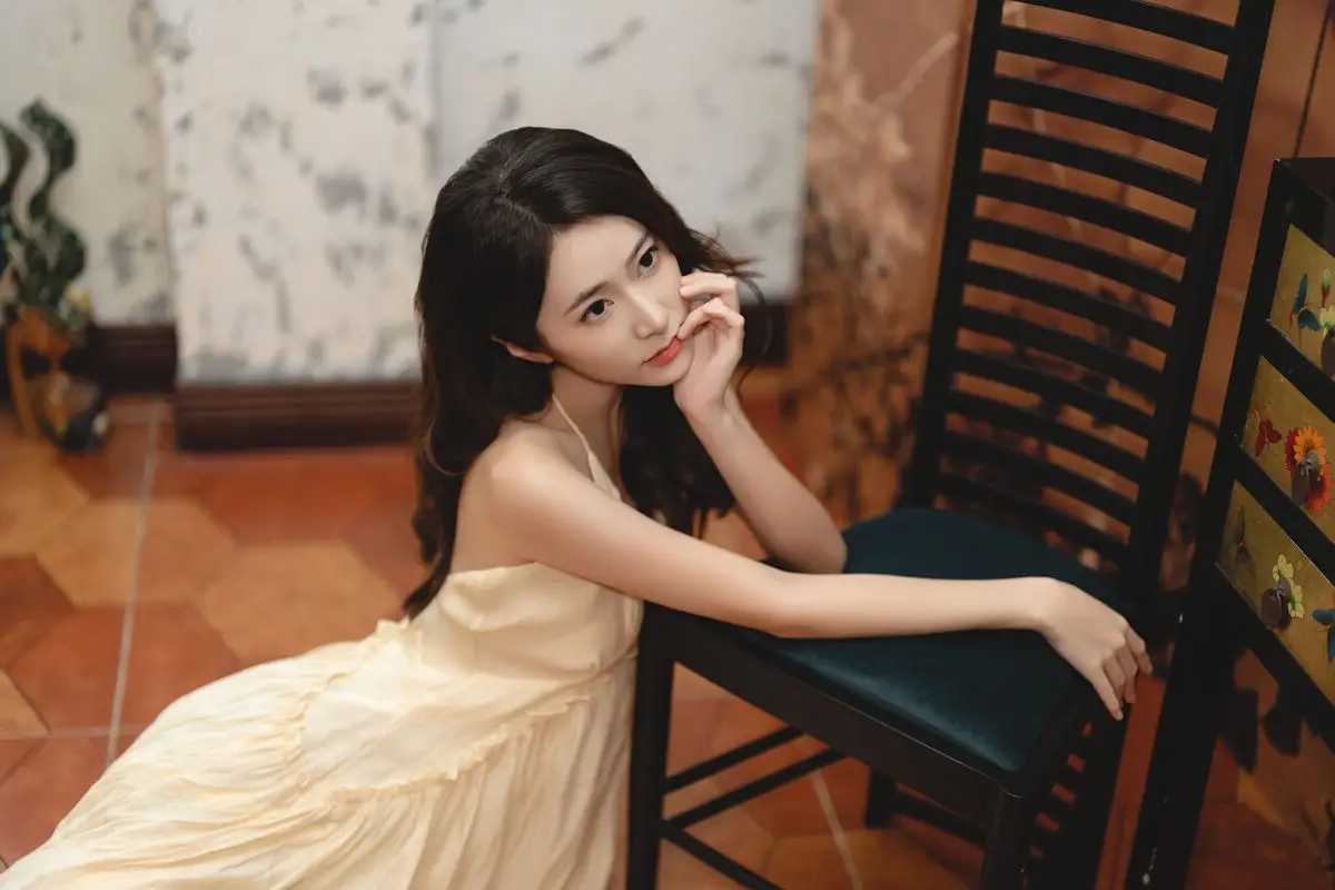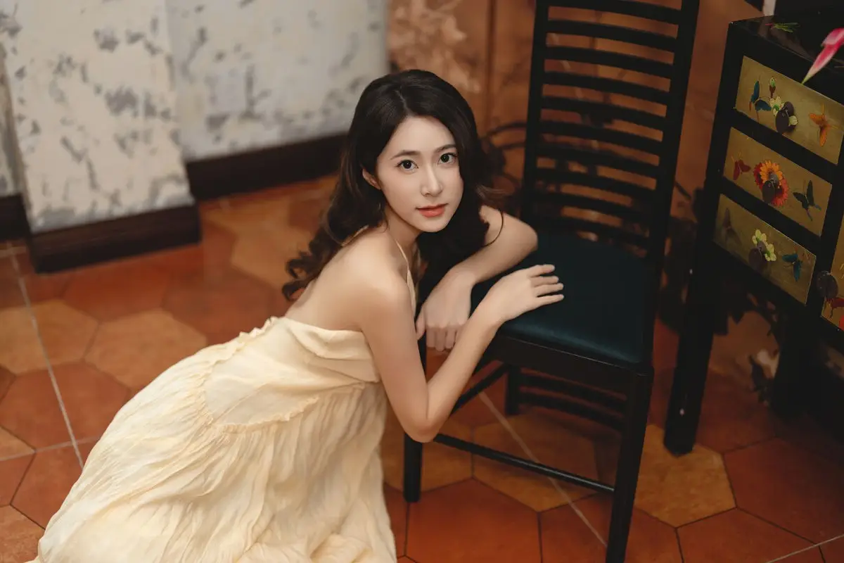 This captivating image from the YiTuYu Vol.8676 collection showcases model Fu Po in a moment of artistic grace and allure. She exudes an elegant beauty, draped in a soft, light yellow strapless dress that subtly highlights her shoulders. Fu Po's profound gaze directly engages the viewer, creating a powerful yet enigmatic connection. Her posture, leaning gently against a classic wooden chair, adds a touch of vintage charm and sophistication to the composition. The interplay of soft lighting, warm tones, and her delicate expression culminates in an emotionally rich photograph, inviting admirers to delve into Fu Po's pure beauty and undeniable charisma. This piece truly stands out within the Art Language series.#FuPo #YiTuYu #ArtisticPortrait #ElegantBeauty #AsianModel