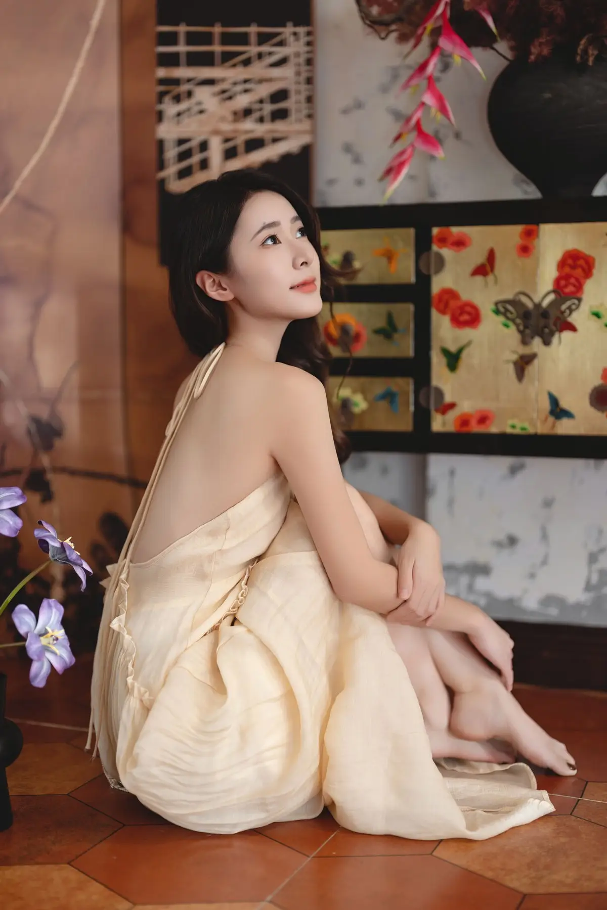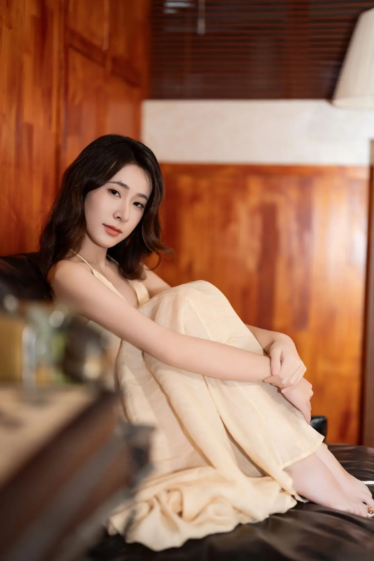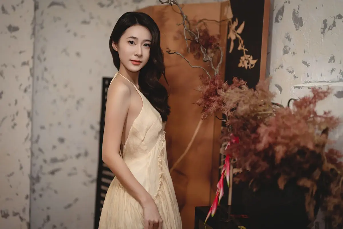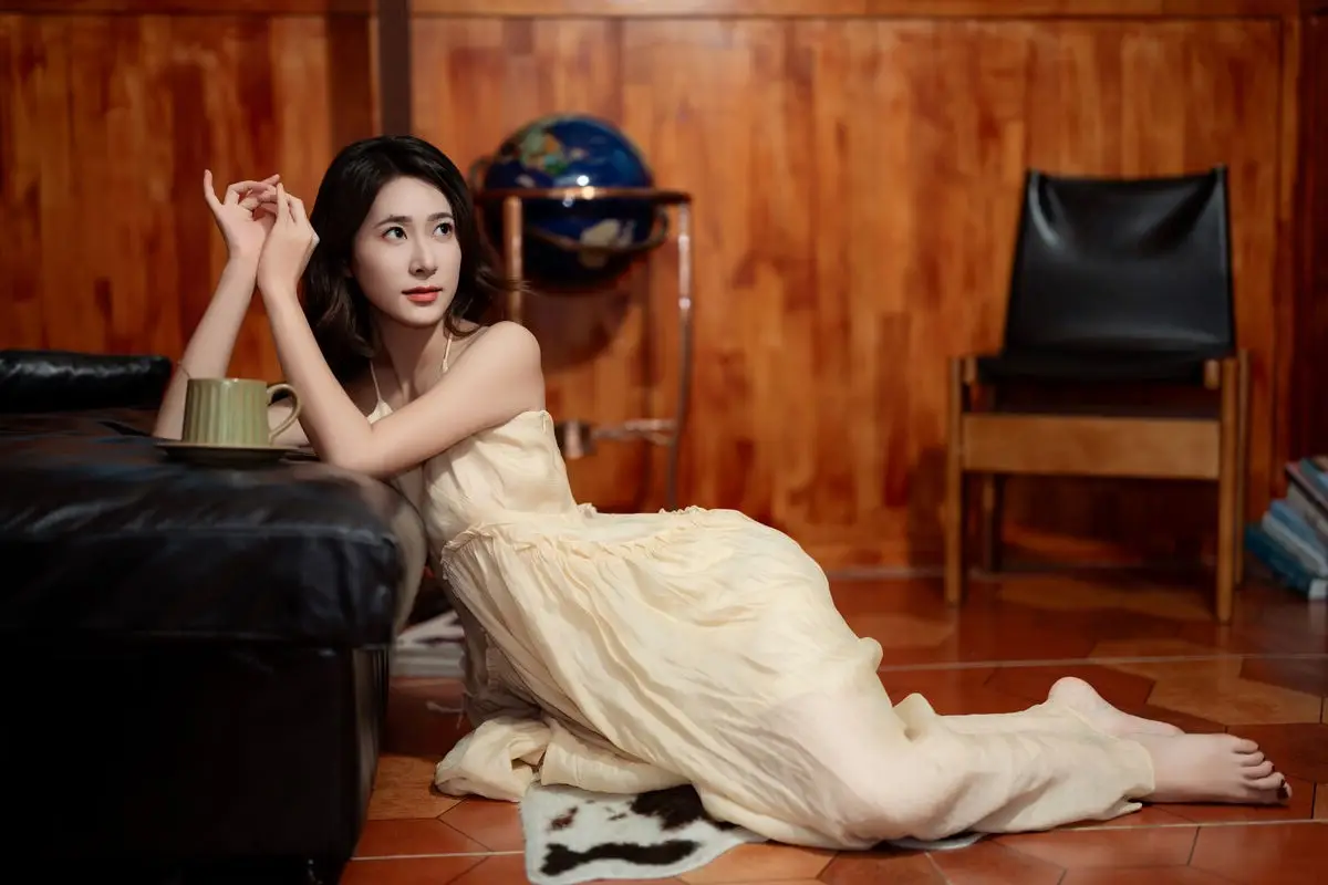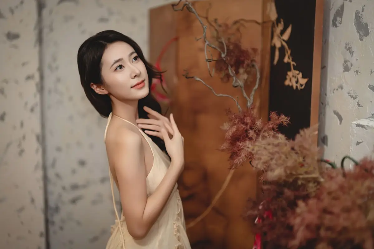 This captivating image from the YiTuYu Vol.8676 collection showcases model Fu Po in a moment of artistic grace and allure. She exudes an elegant beauty, draped in a soft, light yellow strapless dress that subtly highlights her shoulders. Fu Po's profound gaze directly engages the viewer, creating a powerful yet enigmatic connection. Her posture, leaning gently against a classic wooden chair, adds a touch of vintage charm and sophistication to the composition. The interplay of soft lighting, warm tones, and her delicate expression culminates in an emotionally rich photograph, inviting admirers to delve into Fu Po's pure beauty and undeniable charisma. This piece truly stands out within the Art Language series.#FuPo #YiTuYu #ArtisticPortrait #ElegantBeauty #AsianModel