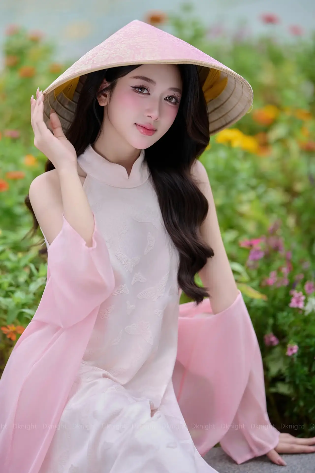 In this captivating image a graceful Vietnamese beauty shines brightly in a flowing pink Ao Dai paired with the iconic traditional conical hat a symbol of Vietnamese culture The woman possesses an ethereal charm with fair skin large captivating eyes and a gentle smile that enchants all who behold her The vibrant floral garden in the background further enhances her pristine and romantic allure Soft sunlight bathes the scene creating a poetic and tranquil atmosphere This image not only showcases the beauty of Vietnamese women but also evokes a sense of pride in traditional attire and the picturesque natural landscapes of Vietnam it is a lovely and emotional moment capturing the essence of oriental beauty#Vietnamese #Beauty #AoDai #ConicalHat #Culture #Traditional