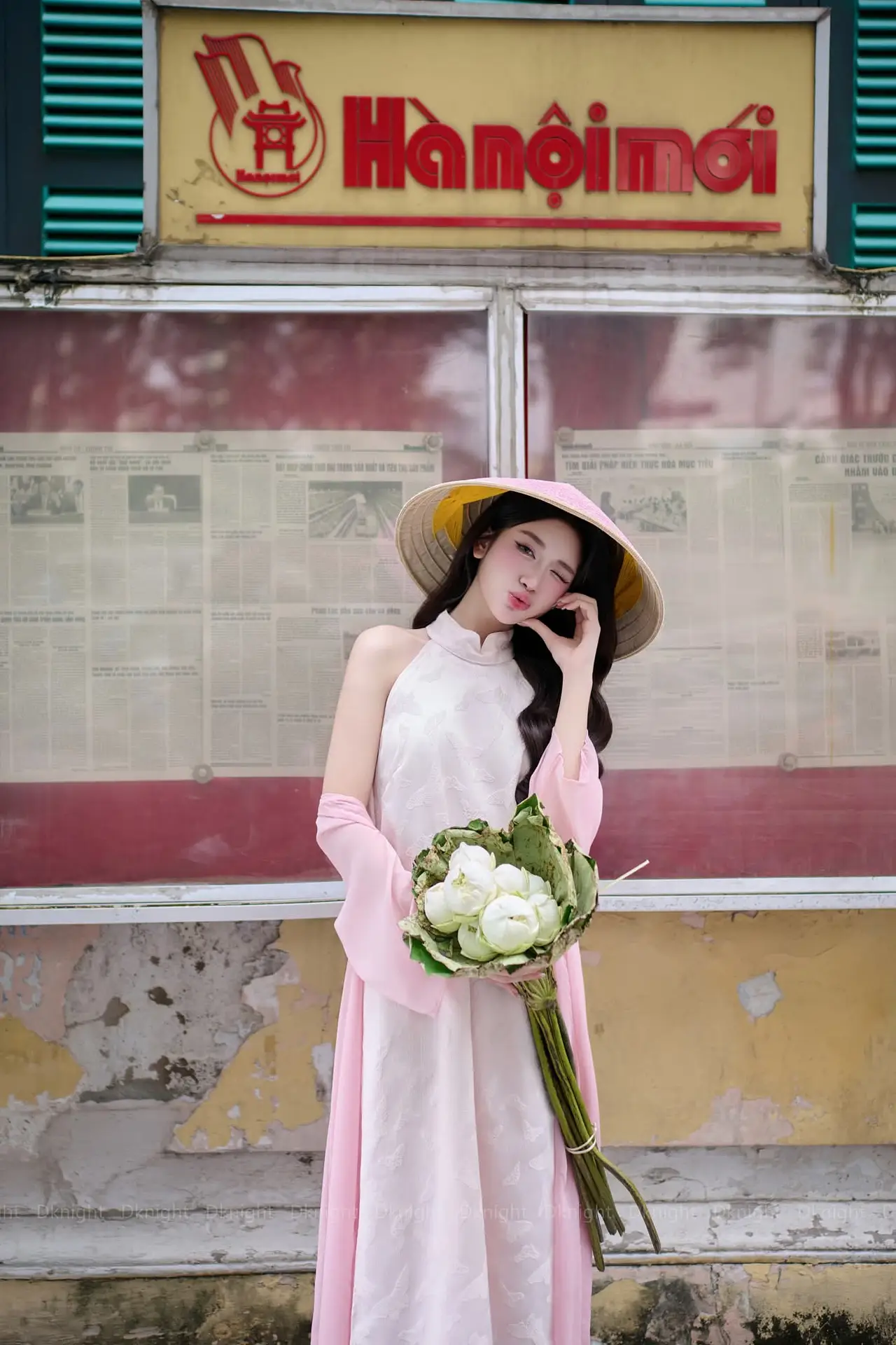 This stunning photograph captures a young Vietnamese woman exuding gentle beauty and elegance. She wears a soft pastel pink traditional outfit that highlights her refined grace. While not a modern Ao Dai this attire deeply evokes Vietnam's long-standing cultural values and the spirit of traditional Vietnamese dress. Holding a characteristic conical hat she radiates a simple yet pure beauty symbolizing the Vietnamese soul. This image harmoniously blends human charm with Vietnam's cultural identity offering a sense of peace and pride in its rich traditional heritage.#VietnameseCulture #TraditionalVietnam #AoDaiSpirit #ConicalHat #VietnameseBeauty