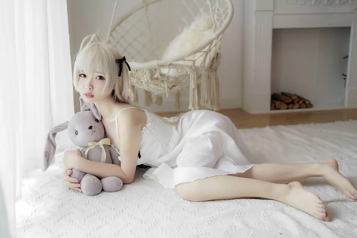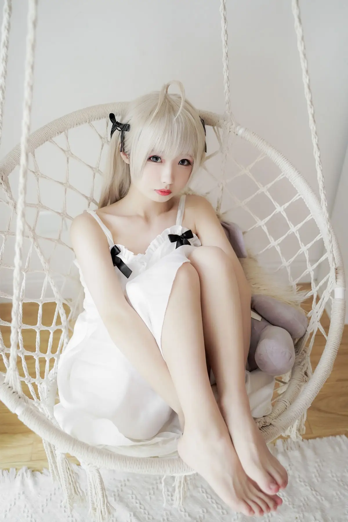In this special cosplay photoshoot, Coser Shi Wan Zhen Zhi Fu Te masterfully recreates the iconic character Qiong Mei in her pristine white dress. The gentle beauty, clear eyes, and signature platinum hair of the character are captivatingly portrayed by Shi Wan Zhen Zhi Fu Te. The white dress adorned with delicate black bows creates a subtle contrast, highlighting an elegant and innocent charm. Her pose on the wicker chair evokes a relaxed dreamy atmosphere, as if transporting viewers into Qiong Mei's unique world. This is an emotionally rich photo collection where the grace and ethereal beauty of Coser Shi Wan Zhen Zhi Fu Te perfectly blend with the character's spirit, surely delighting cosplay enthusiasts.