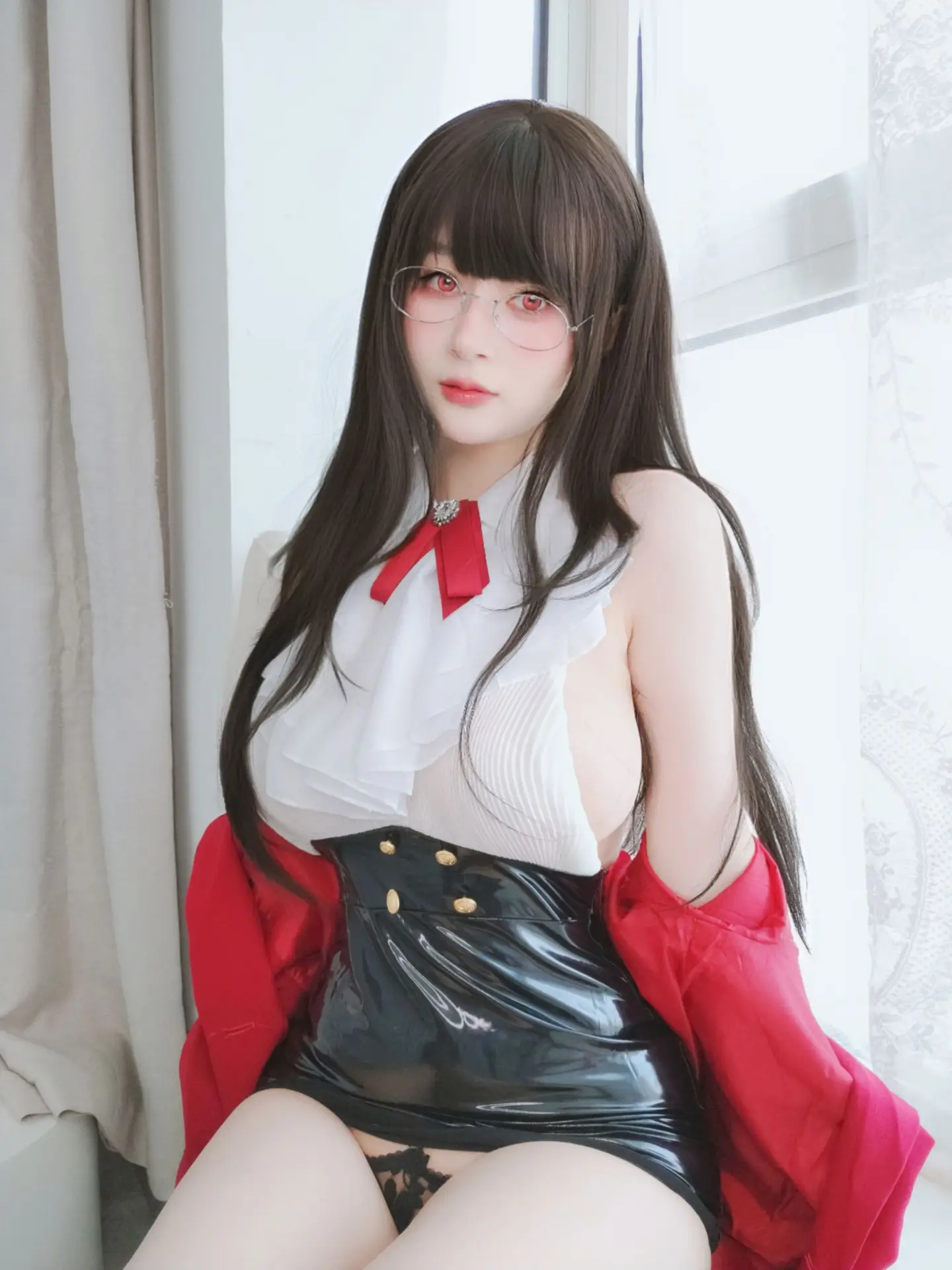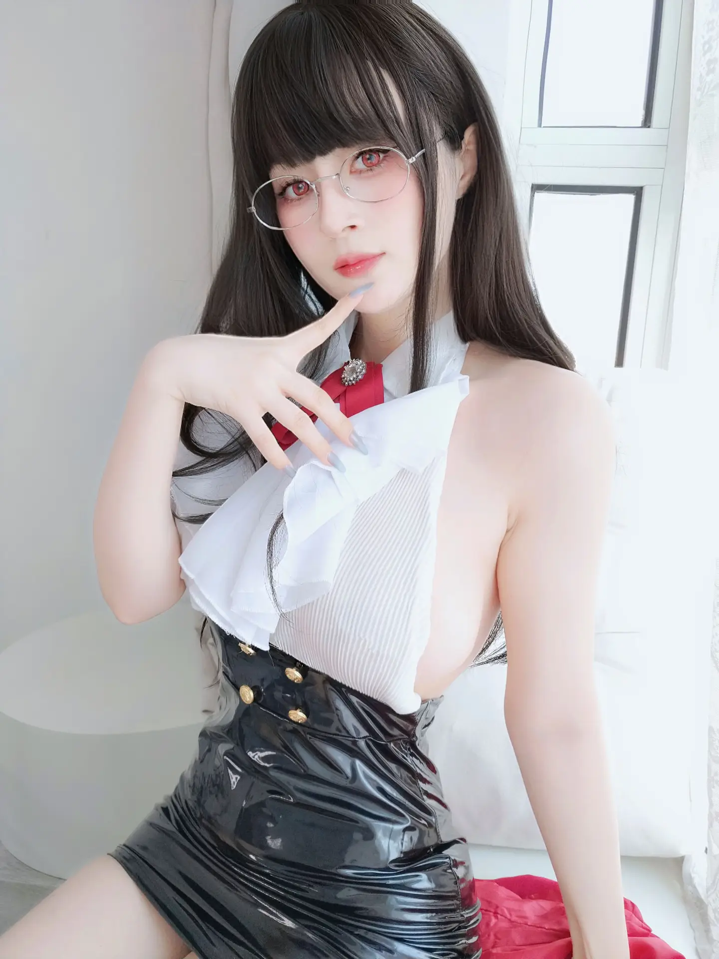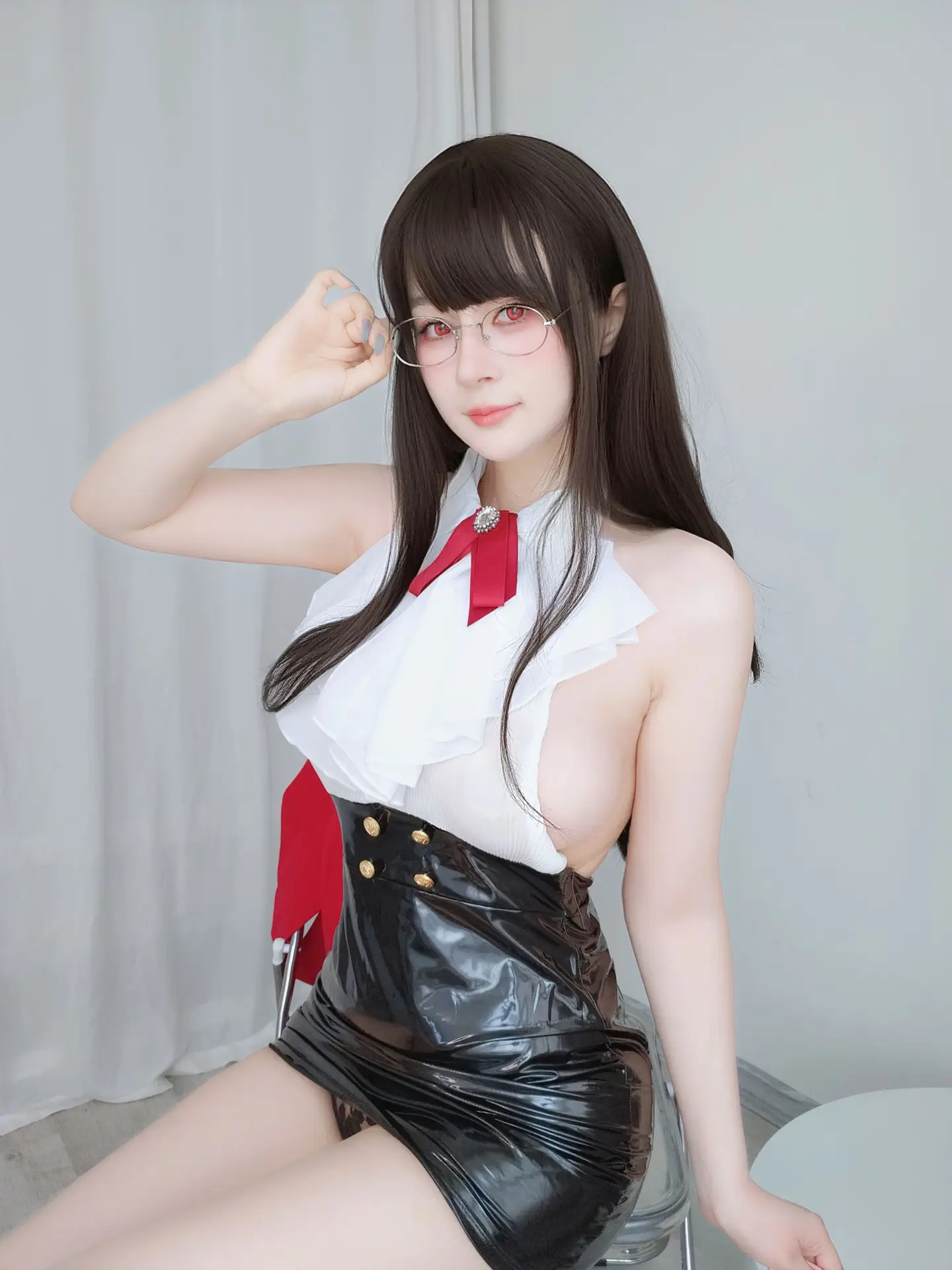 This captivating image features a stunning cosplayer, embodying a unique blend of intellect and allure. The young woman, with her flowing dark hair and stylish glasses, exudes confidence. Her choice of attire is a bold yet elegant combination: a sophisticated white halter-neck top subtly reveals her shoulders, perfectly paired with a glossy black leather-look mini-skirt adorned with striking gold buttons. This ensemble creates a distinctive and charismatic style. Her sharp eyes and confident expression draw viewers in, inviting them to delve deeper into the character's narrative. It's a compelling visual show that highlights the dedication and passion often found in Japanese cosplay, presenting a truly mesmerizing display.