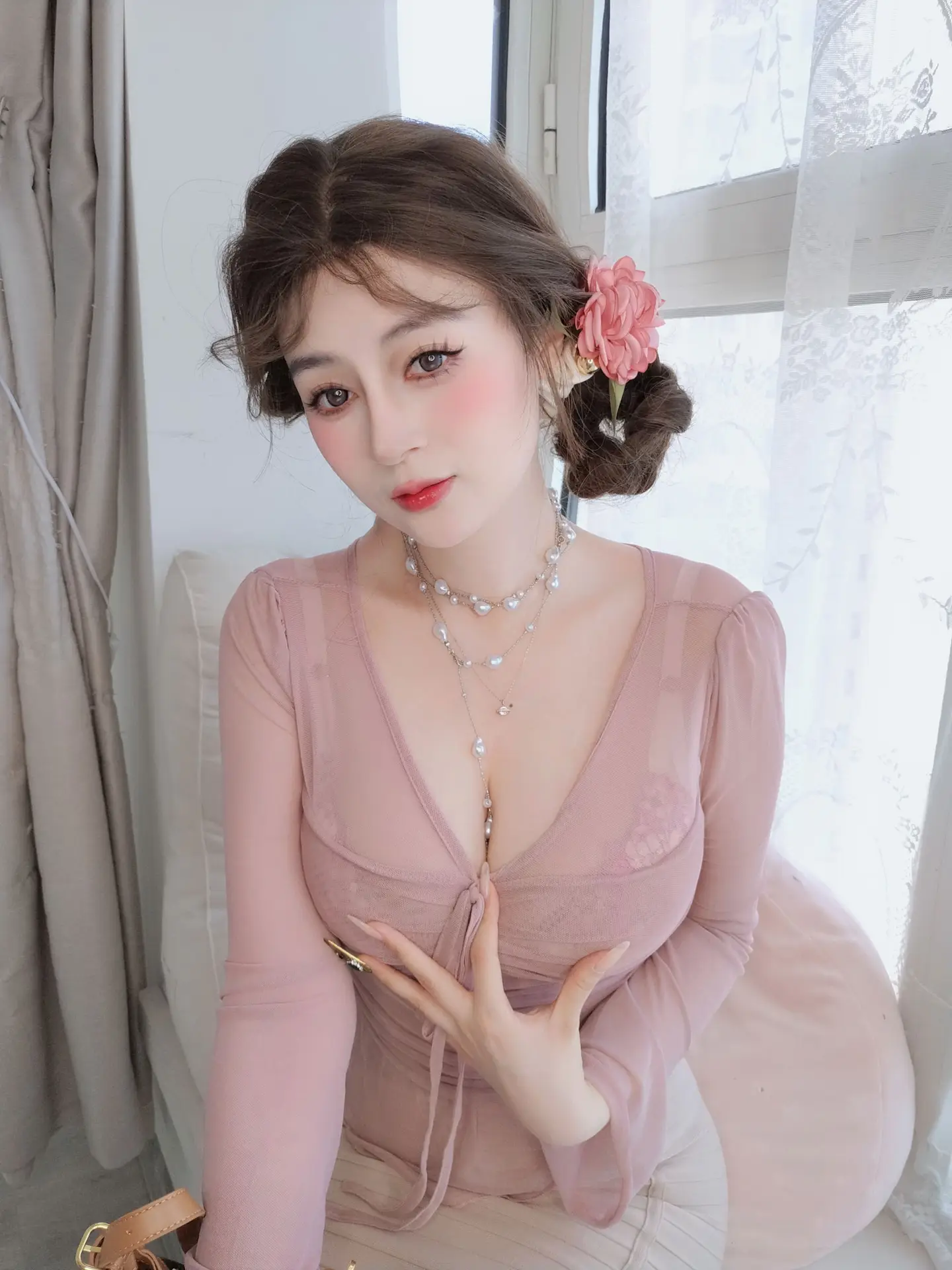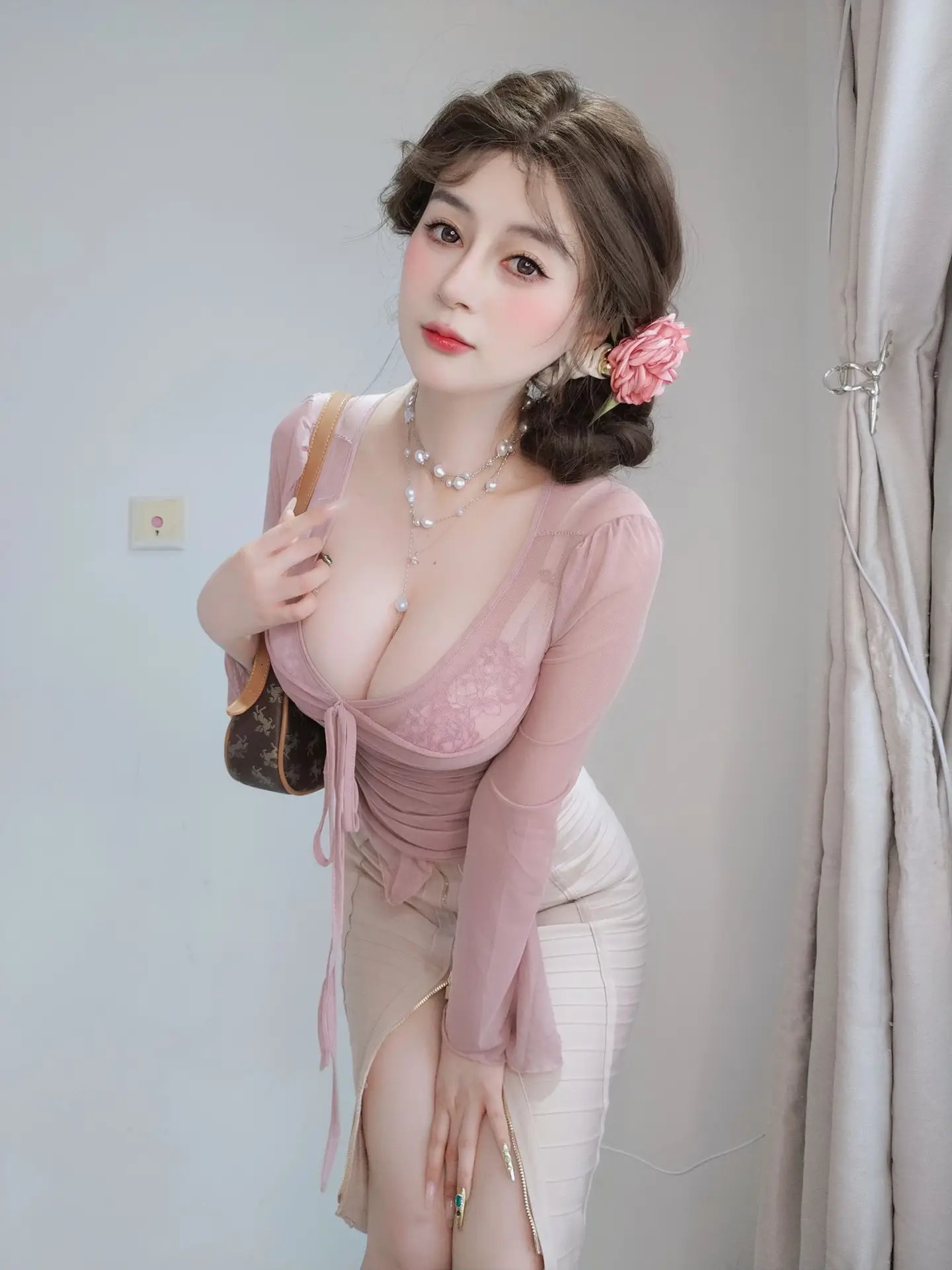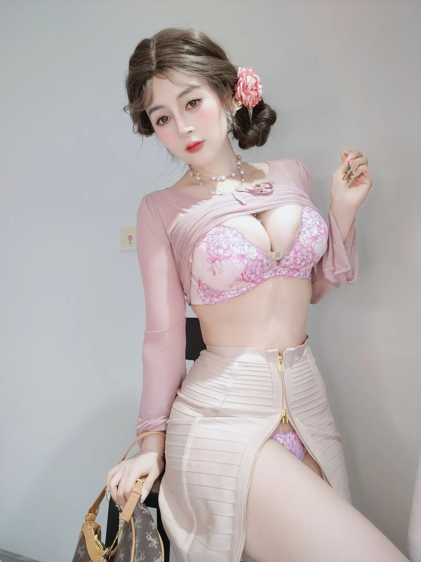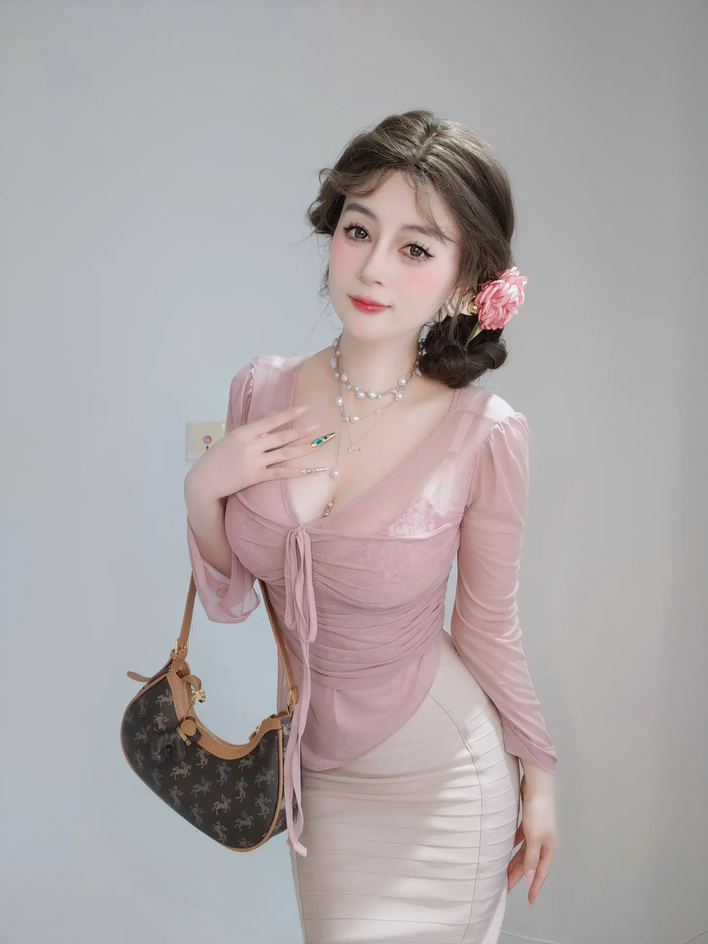 This stunning image captures a feminine coser exuding irresistible charm and gentle grace. She wears a soft, sheer pink top that beautifully accentuates her balanced figure and delicate curves. The pastel pink hue, combined with the lightweight fabric, creates an elegant and ethereal style. Her hair is neatly styled, adorned with a small pink flower, further enhancing her graceful appearance. With a confident and captivating aura, holding a designer handbag, the girl creates an incredibly attractive overall look that draws every eye. This is truly a sight to behold, showcasing a perfect blend of natural beauty and refined fashion sense.
