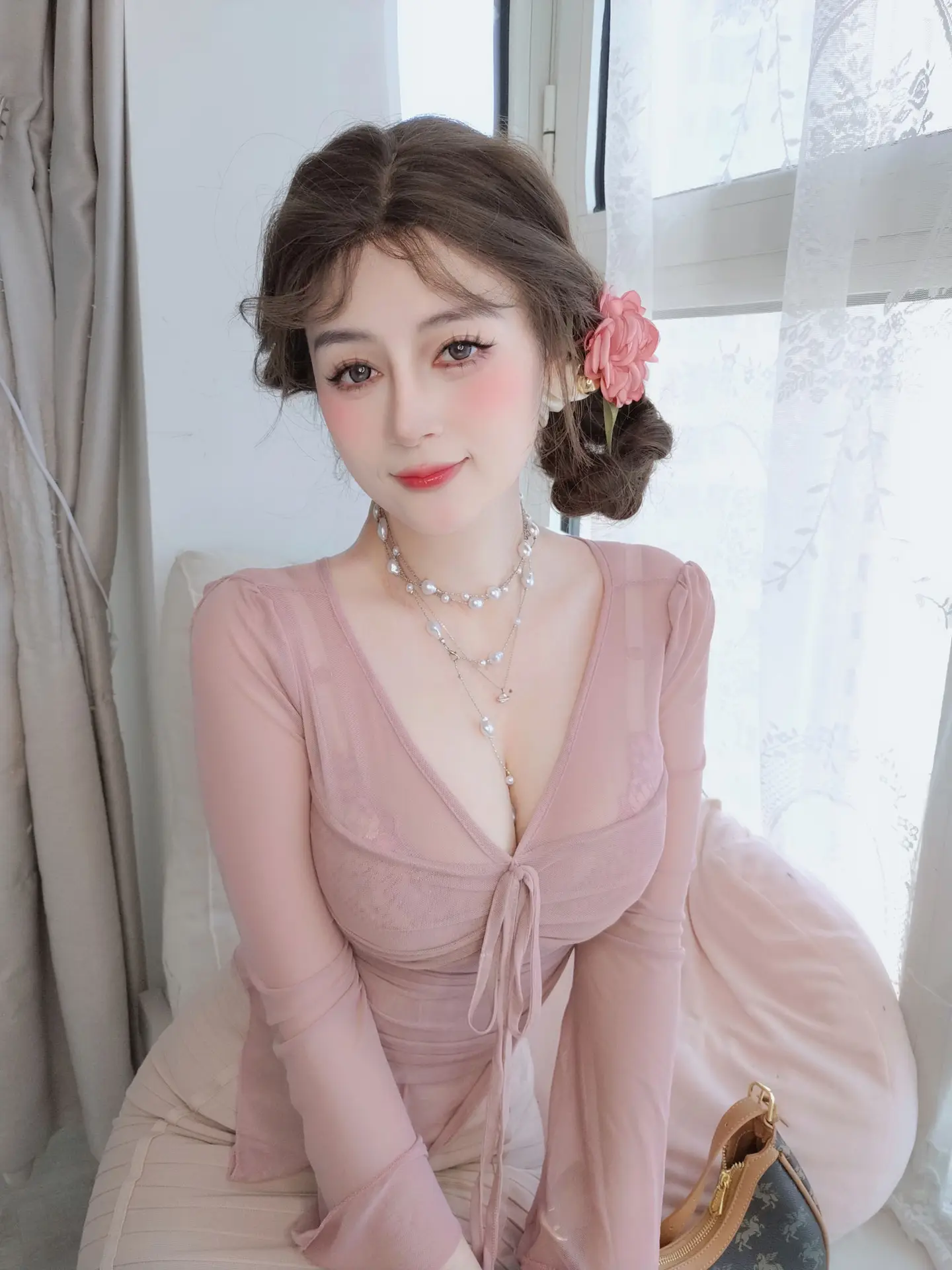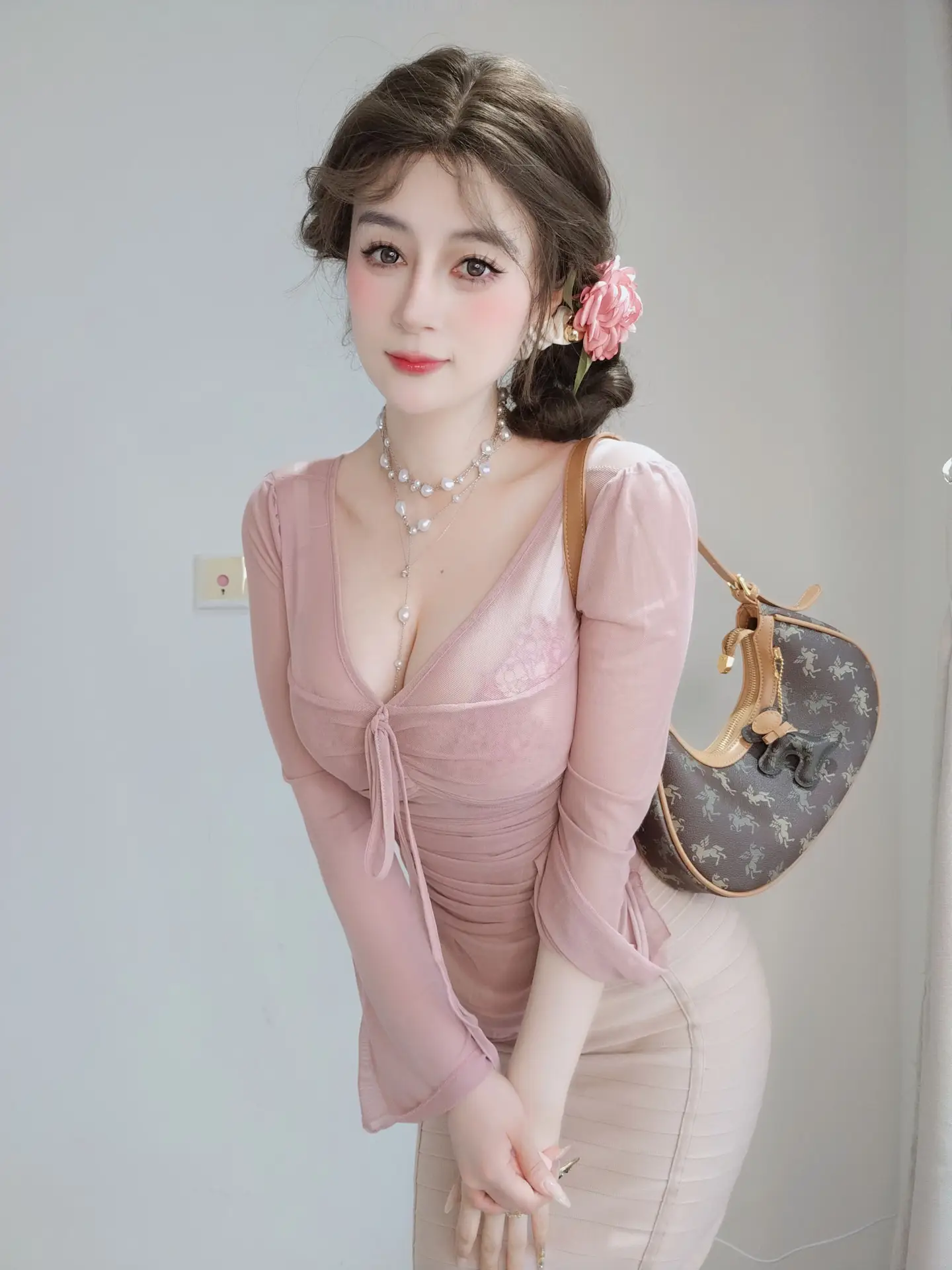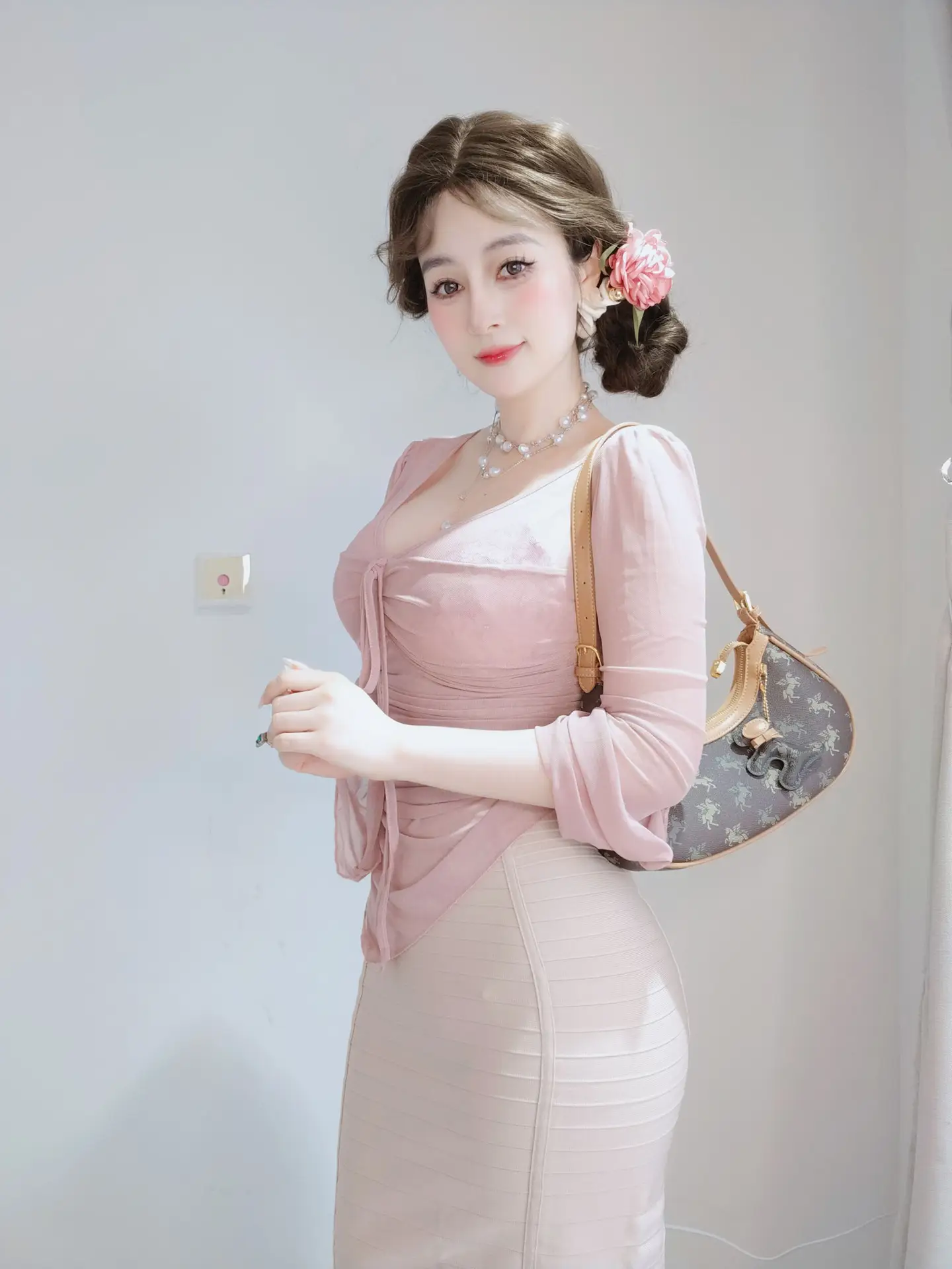 This stunning image captures a feminine coser exuding irresistible charm and gentle grace. She wears a soft, sheer pink top that beautifully accentuates her balanced figure and delicate curves. The pastel pink hue, combined with the lightweight fabric, creates an elegant and ethereal style. Her hair is neatly styled, adorned with a small pink flower, further enhancing her graceful appearance. With a confident and captivating aura, holding a designer handbag, the girl creates an incredibly attractive overall look that draws every eye. This is truly a sight to behold, showcasing a perfect blend of natural beauty and refined fashion sense.
