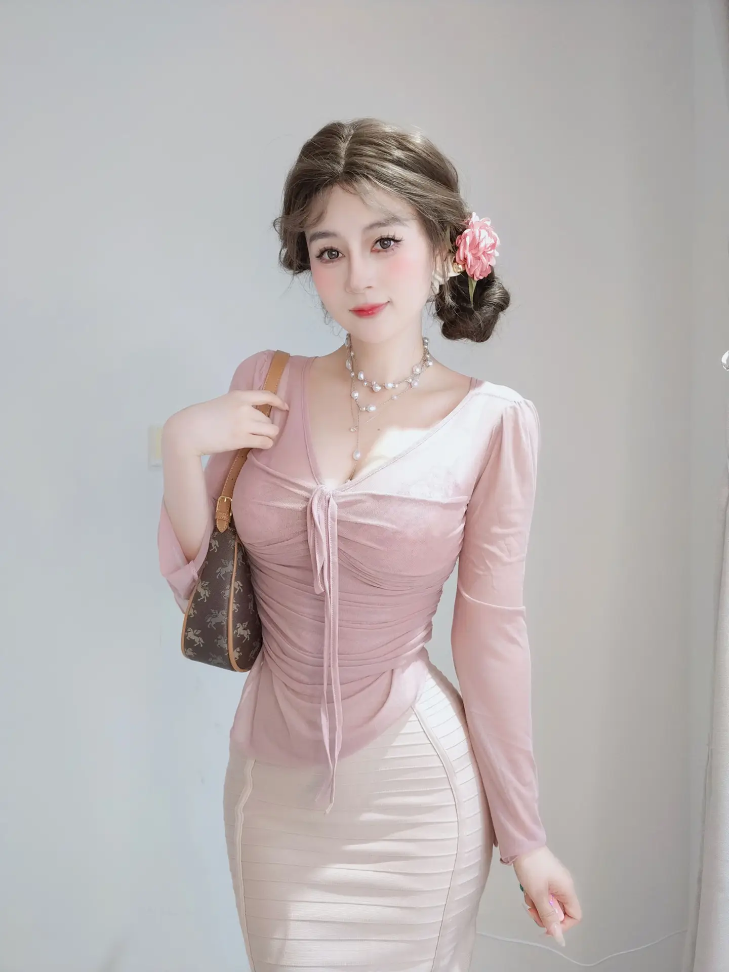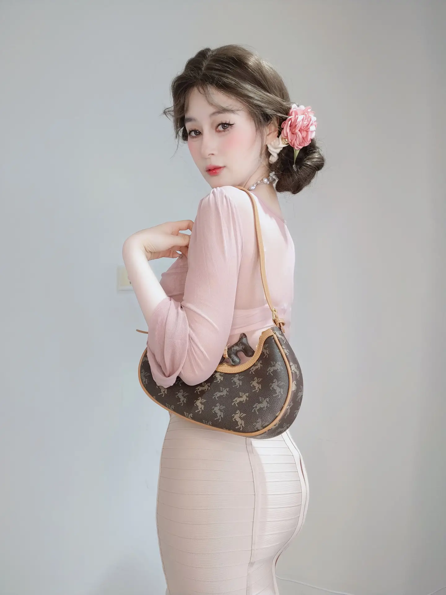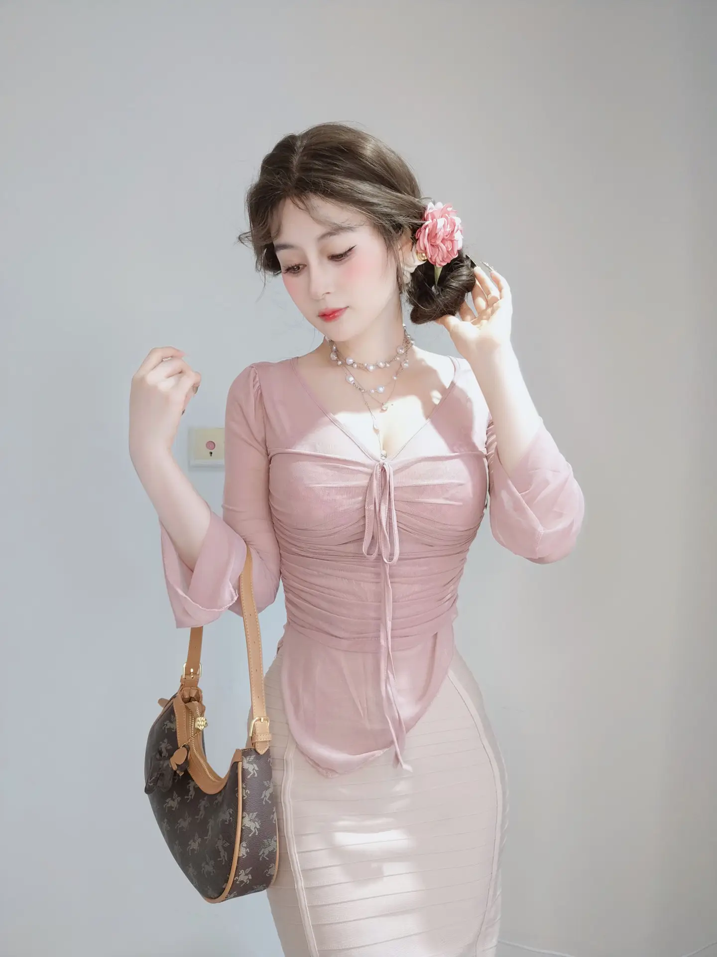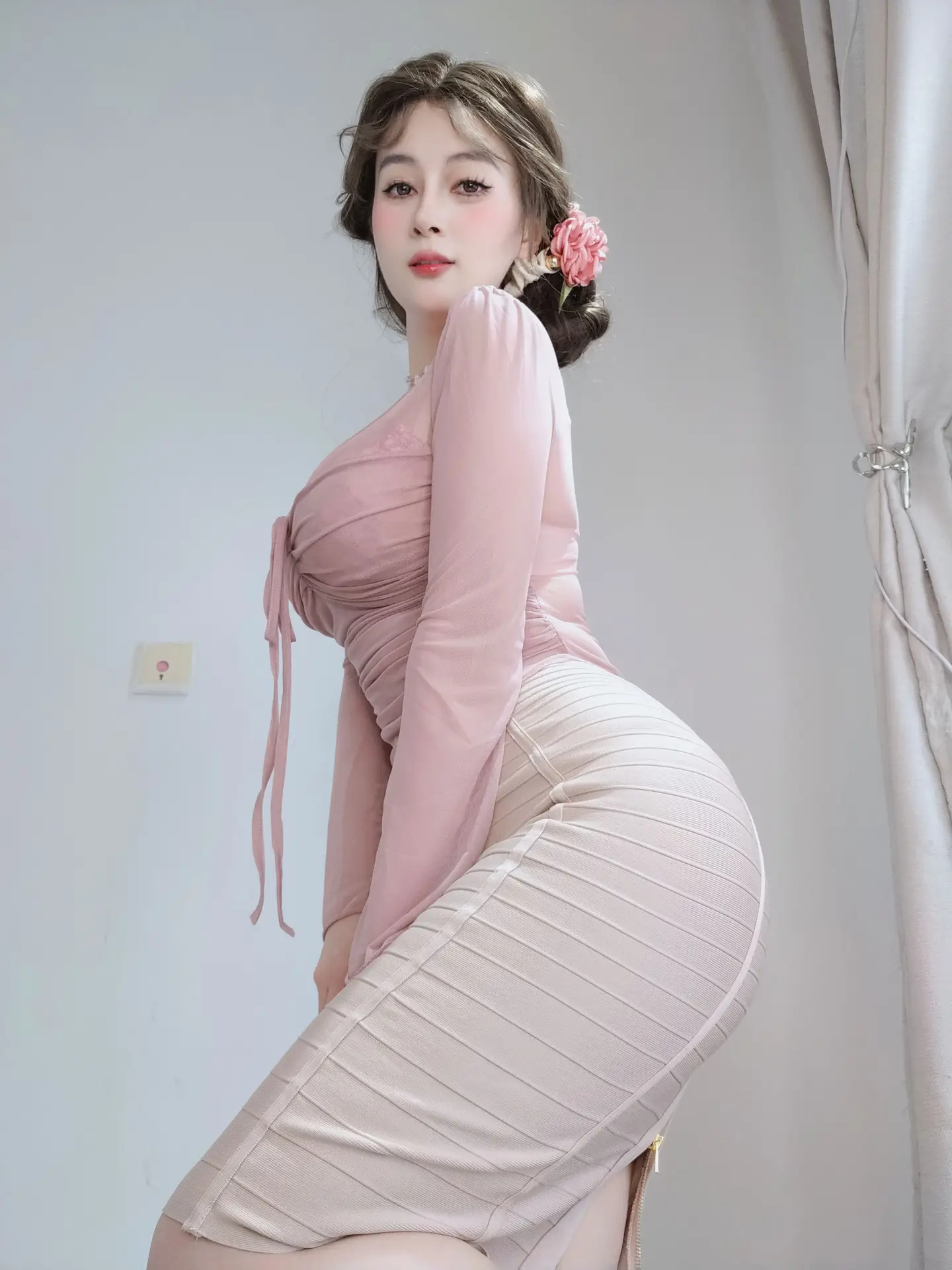 This stunning image captures a feminine coser exuding irresistible charm and gentle grace. She wears a soft, sheer pink top that beautifully accentuates her balanced figure and delicate curves. The pastel pink hue, combined with the lightweight fabric, creates an elegant and ethereal style. Her hair is neatly styled, adorned with a small pink flower, further enhancing her graceful appearance. With a confident and captivating aura, holding a designer handbag, the girl creates an incredibly attractive overall look that draws every eye. This is truly a sight to behold, showcasing a perfect blend of natural beauty and refined fashion sense.