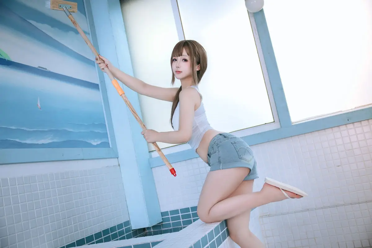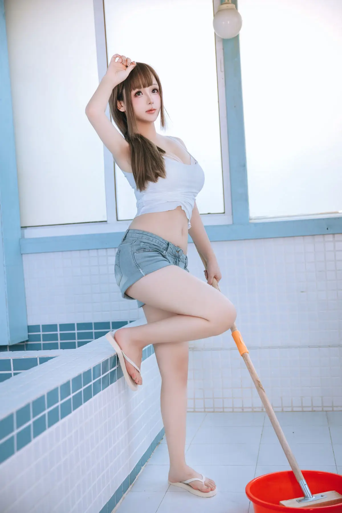 The Coser Rinajiao - Male Bathroom Cleaner Part03 collection presents a surprisingly charming and alluring portrayal. As a female cleaner in a male bathroom, Rinajiao captivates with her sweet yet undeniably attractive appearance. She dons a simple white tank top paired with dynamic denim shorts, showcasing her slender figure and smooth, fair skin. Holding a cleaning brush, Rinajiao poses with a professional touch while maintaining a playful and endearing charm. The bathroom setting, with its white and blue tiles, provides a bright backdrop that highlights her pure and sensual appeal. This photo series promises to enthrall viewers, inviting them to discover a fresh and captivating side of Rinajiao in this unique role.