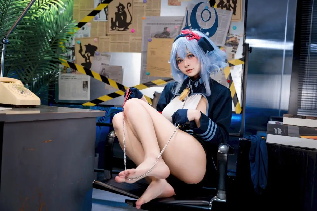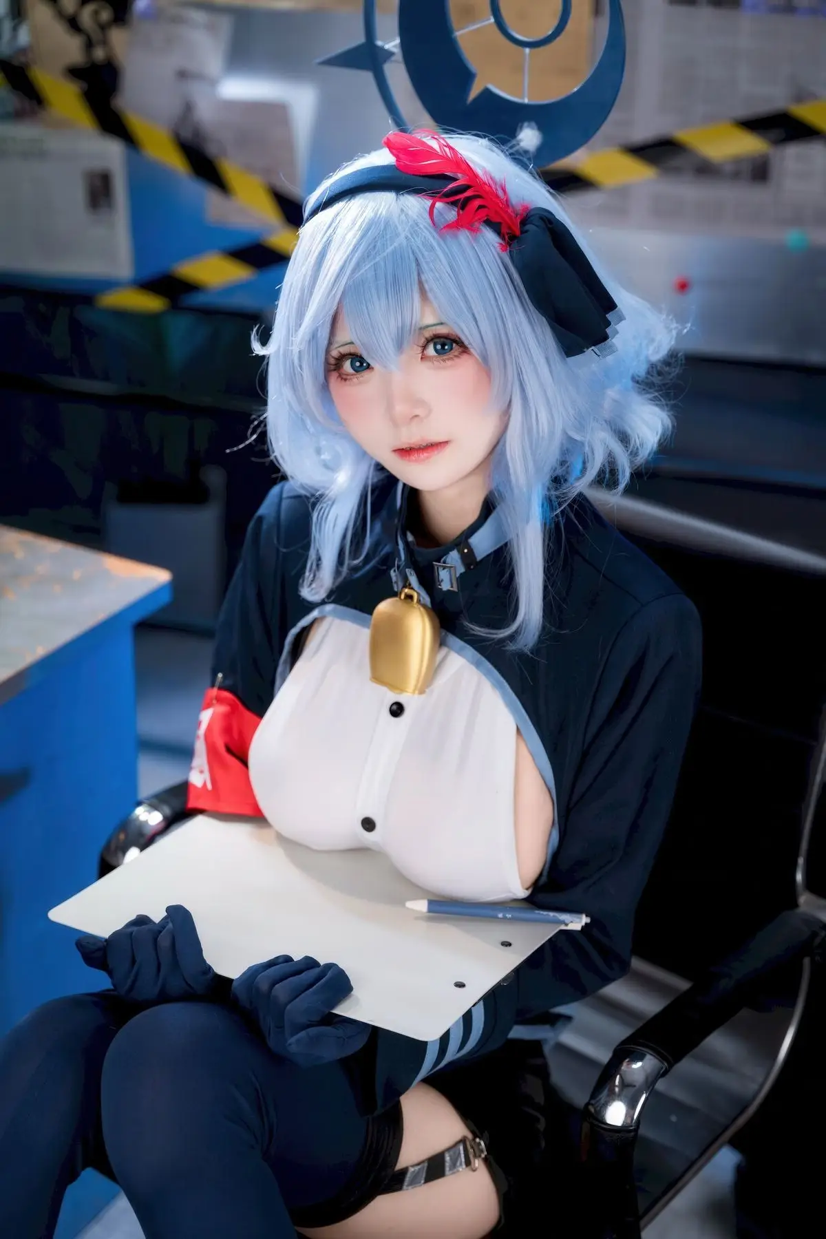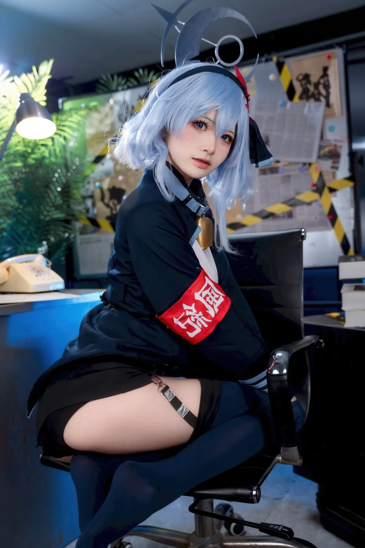 This stunning image showcases an exceptional portrayal of Amau Ako from the popular game Blue Archive, brought to life by cosplayer Jiu Qi Miao. Jiu Qi Miao perfectly captures the sharp and captivating aura of the character, from her flowing pastel blue hair to the meticulously detailed dark blue academy uniform. Every small detail, such as the red bow in her hair, the gleaming gold badge, and the white gloves, is authentically recreated, demonstrating the cosplayer's dedication and passion. With a focused gaze and an elegant sitting posture, Jiu Qi Miao not only wears the costume but also breathes life into Amau Ako, presenting a vibrant and incredibly appealing version. This is undoubtedly a professional cosplay masterpiece that will keep viewers captivated and further enhance their appreciation for the Blue Archive universe.#Cosplay #AmauAko #BlueArchiveCosplay #JiuQiMiao #AnimeCosplay
