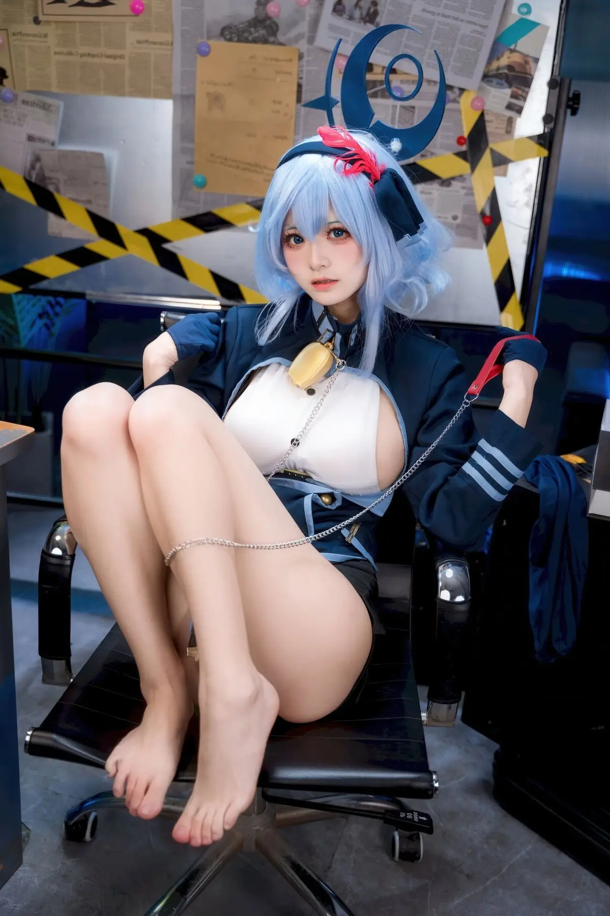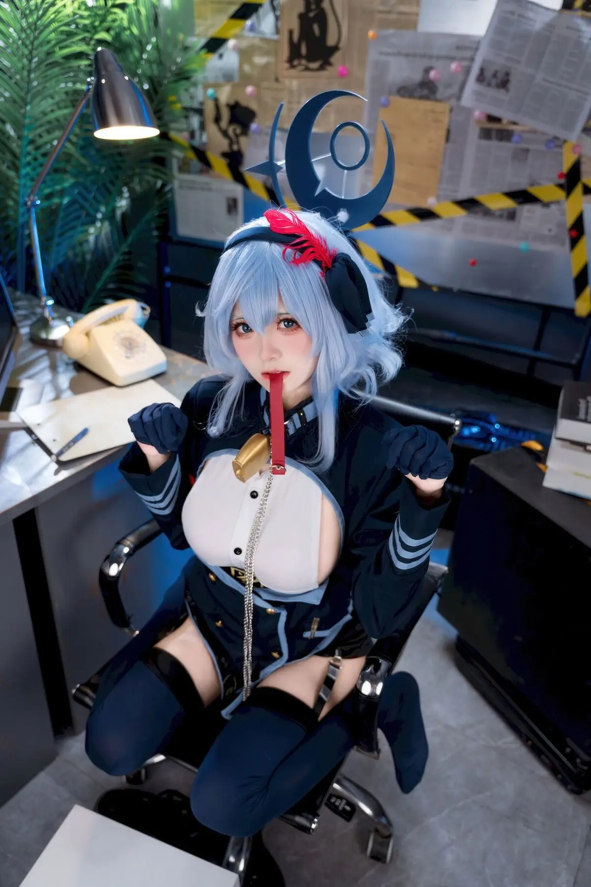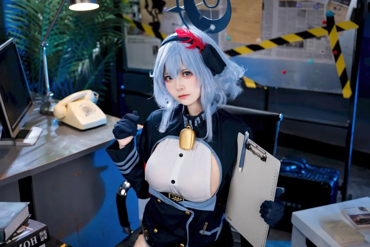 This stunning image showcases an exceptional portrayal of Amau Ako from the popular game Blue Archive, brought to life by cosplayer Jiu Qi Miao. Jiu Qi Miao perfectly captures the sharp and captivating aura of the character, from her flowing pastel blue hair to the meticulously detailed dark blue academy uniform. Every small detail, such as the red bow in her hair, the gleaming gold badge, and the white gloves, is authentically recreated, demonstrating the cosplayer's dedication and passion. With a focused gaze and an elegant sitting posture, Jiu Qi Miao not only wears the costume but also breathes life into Amau Ako, presenting a vibrant and incredibly appealing version. This is undoubtedly a professional cosplay masterpiece that will keep viewers captivated and further enhance their appreciation for the Blue Archive universe.#Cosplay #AmauAko #BlueArchiveCosplay #JiuQiMiao #AnimeCosplay