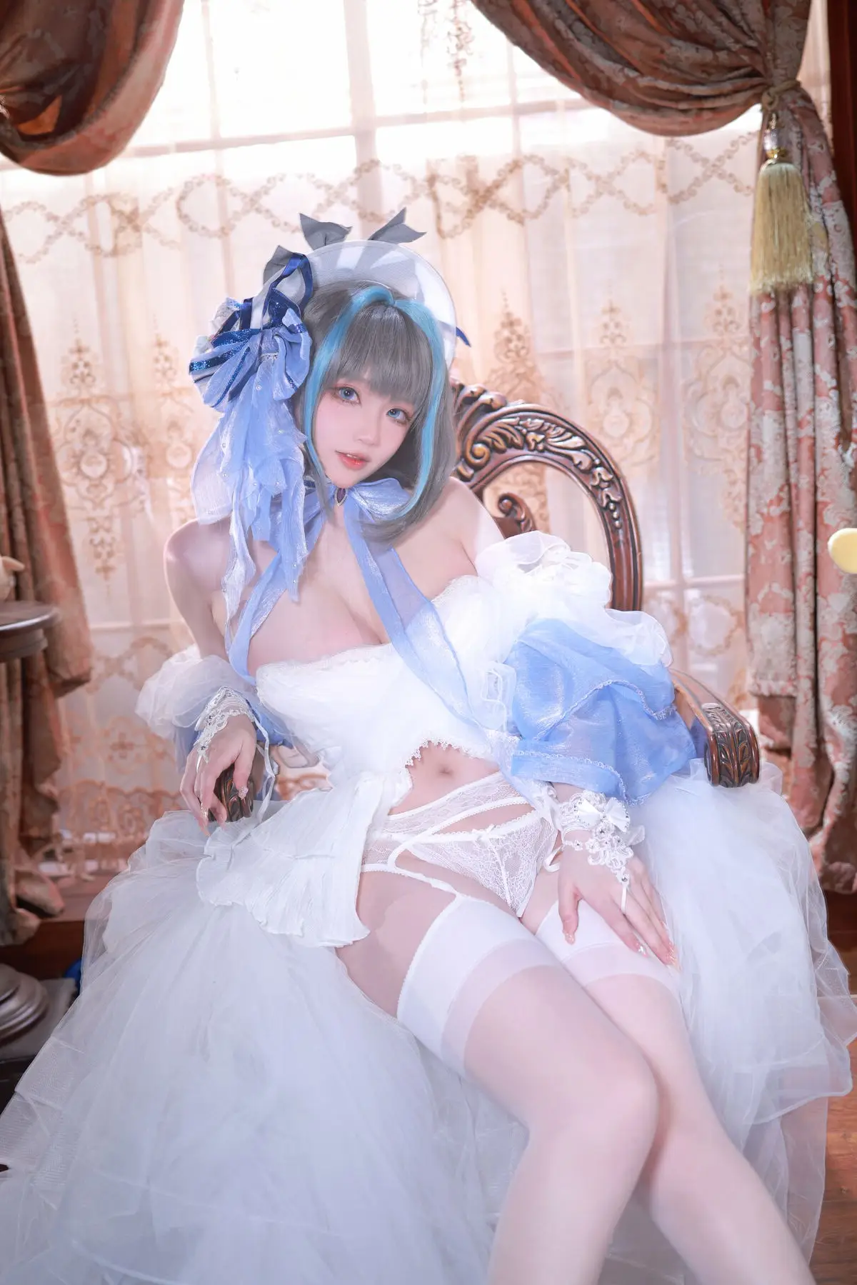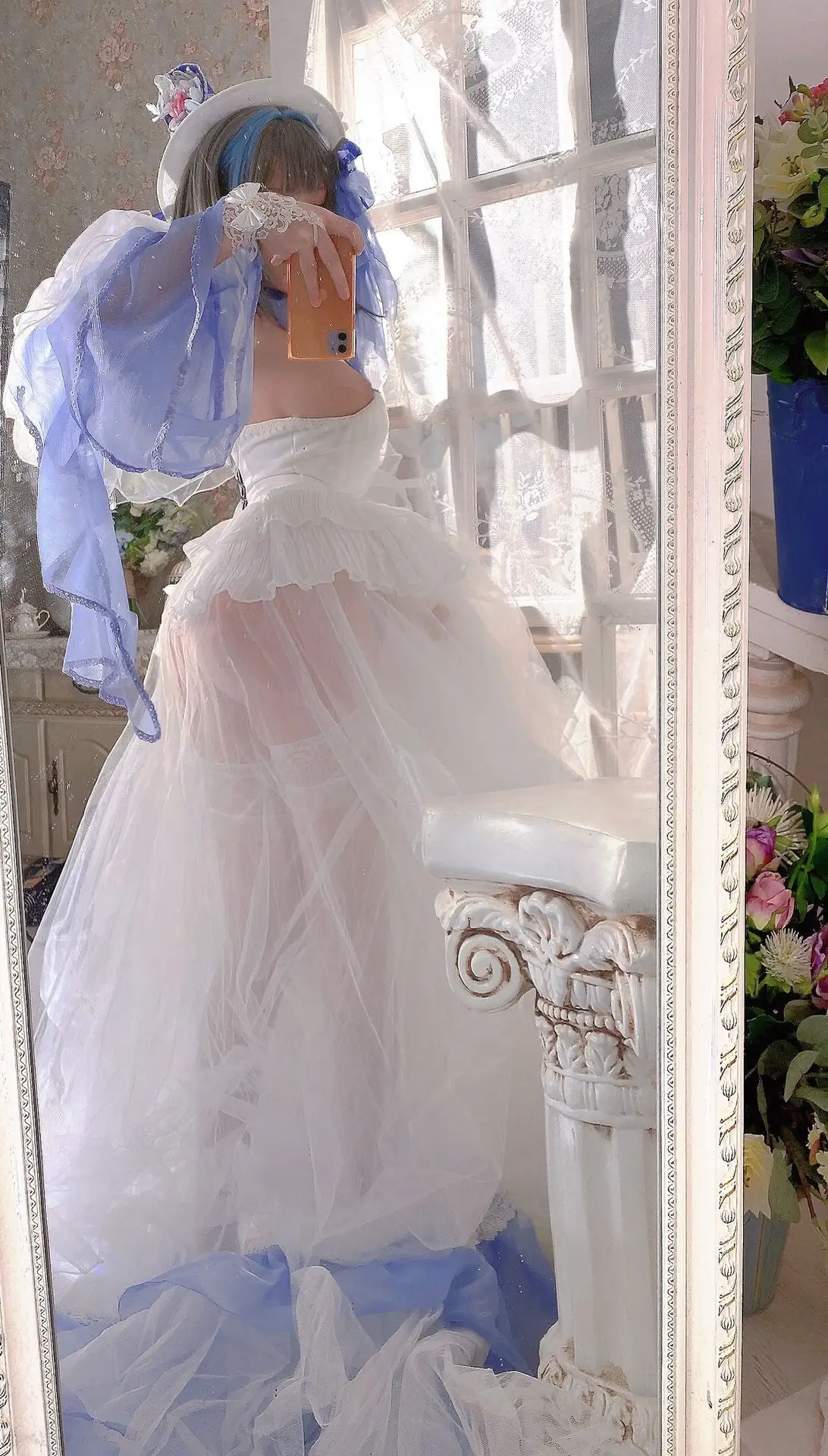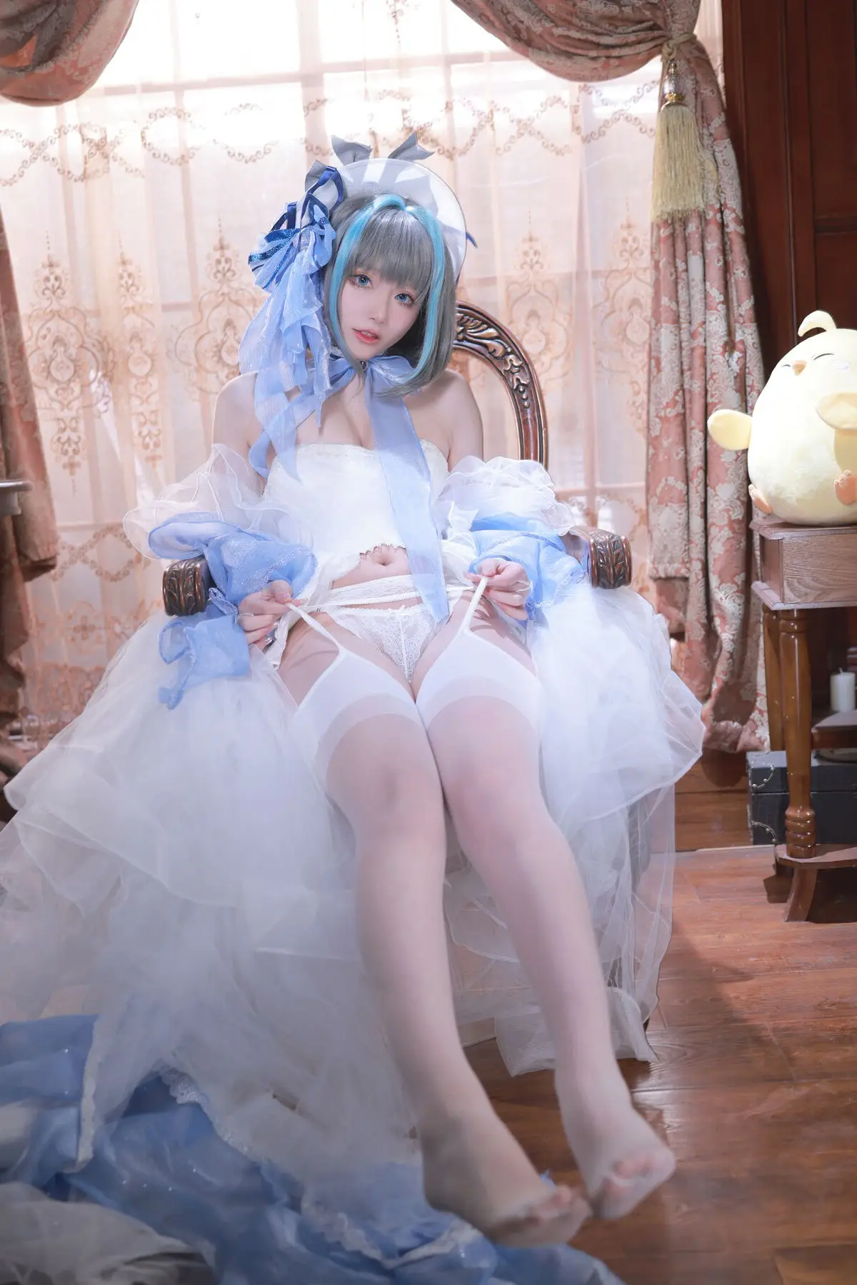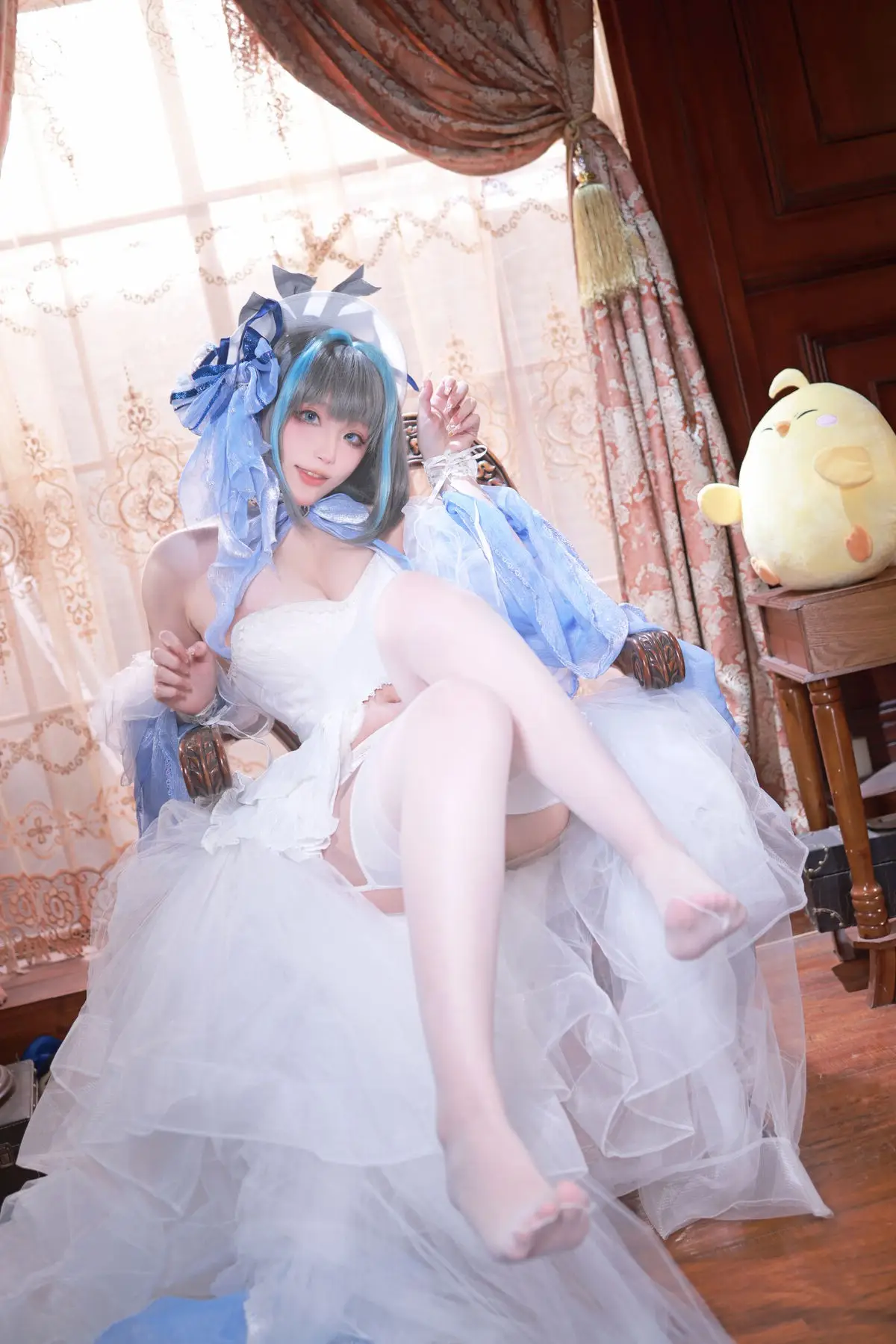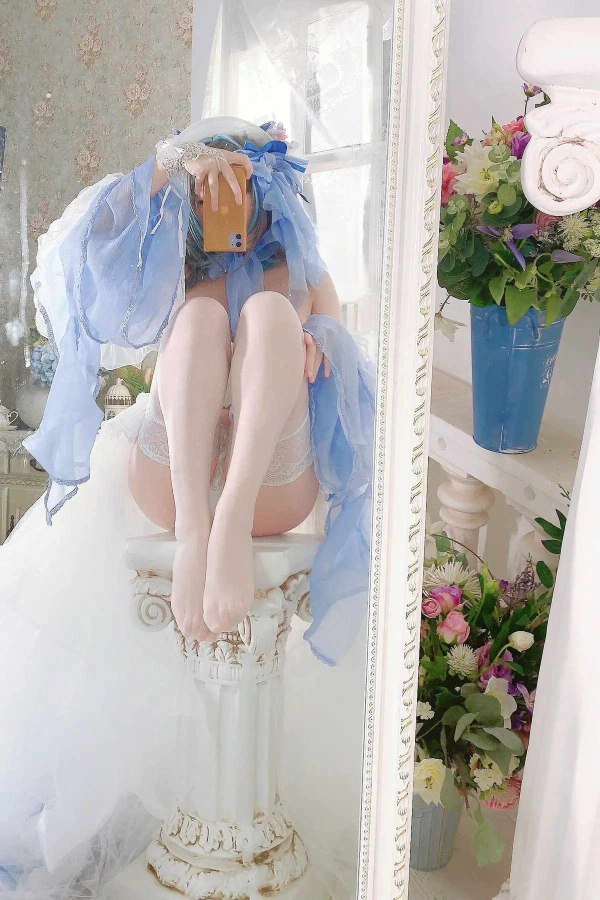 Immerse yourself in the captivating beauty of coser Qi Si Kuai Wii as she flawlessly embodies the exquisite Cheshire Gown. This photograph exudes grace and elegance with a voluminous white dress adorned by dreamy blue accents. From her lustrous blue hair, meticulously styled, to the pristine white stockings accentuating her legs, the model perfectly captures the character's essence. She poses gracefully on a classic chair her captivating gaze drawing every eye. The soft lighting and luxurious setting create a fairytale atmosphere that highlights the coser's delicate features. This is more than just a cosplay photoshoot it's an artistic masterpiece conveying profound charm and ethereal beauty offering an unforgettable visual experience.#Coser #QiSiKuaiWii #CheshireGown #CosplayFantasy #ElegantBeauty #FairytaleCostume