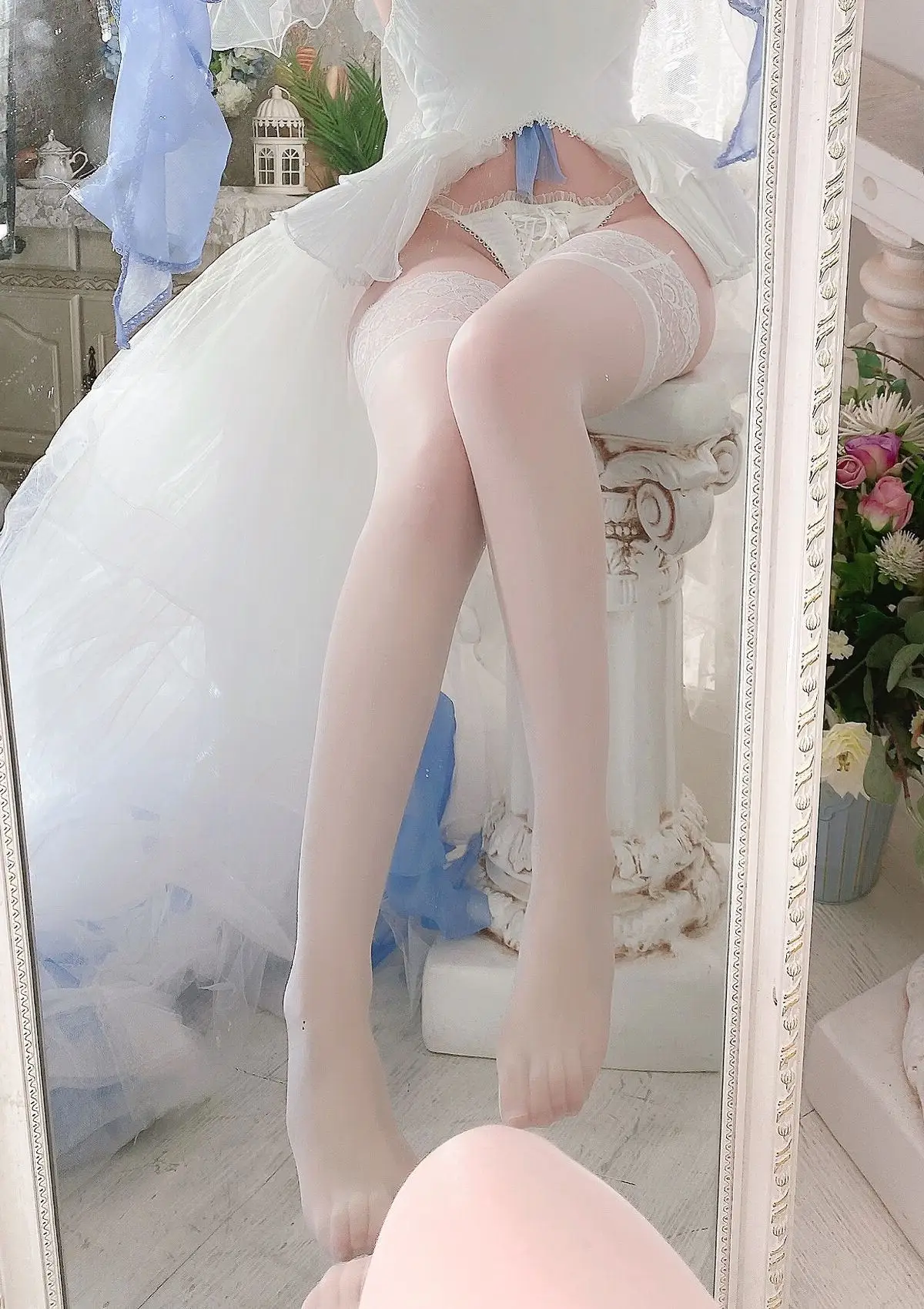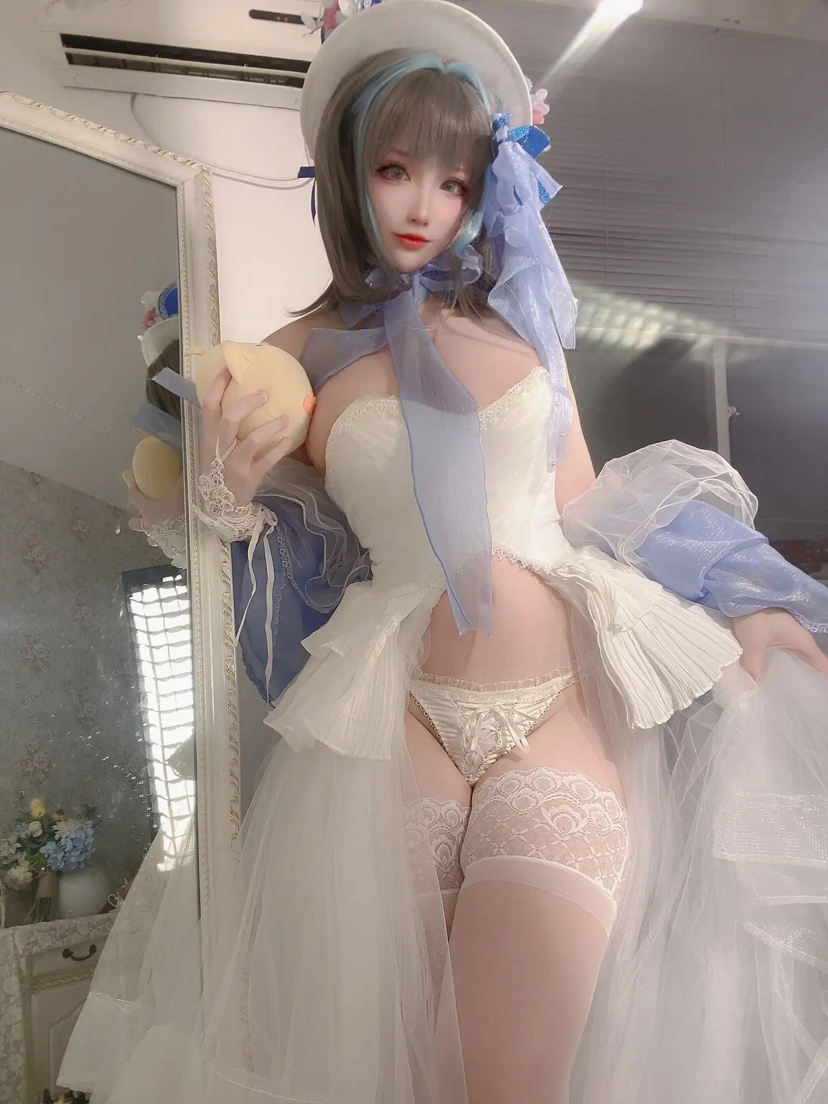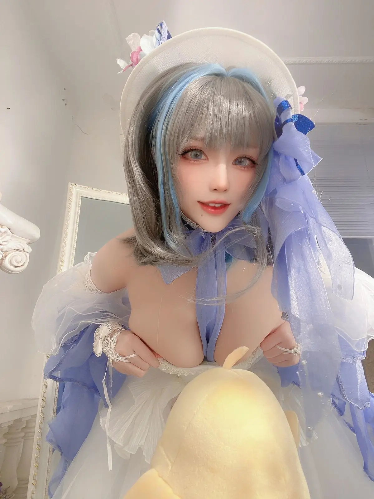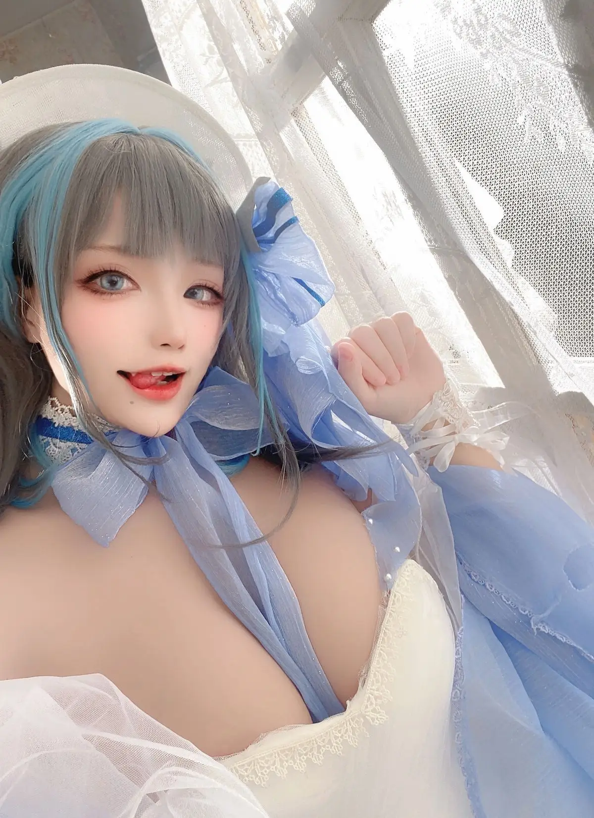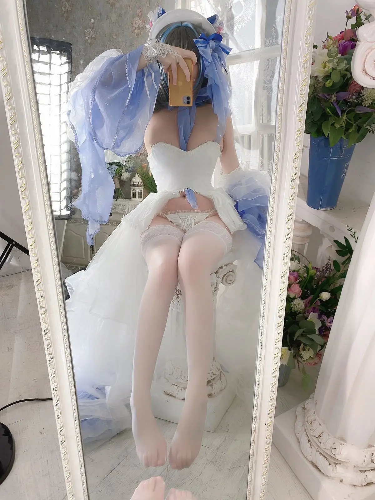 Immerse yourself in the captivating beauty of coser Qi Si Kuai Wii as she flawlessly embodies the exquisite Cheshire Gown. This photograph exudes grace and elegance with a voluminous white dress adorned by dreamy blue accents. From her lustrous blue hair, meticulously styled, to the pristine white stockings accentuating her legs, the model perfectly captures the character's essence. She poses gracefully on a classic chair her captivating gaze drawing every eye. The soft lighting and luxurious setting create a fairytale atmosphere that highlights the coser's delicate features. This is more than just a cosplay photoshoot it's an artistic masterpiece conveying profound charm and ethereal beauty offering an unforgettable visual experience.#Coser #QiSiKuaiWii #CheshireGown #CosplayFantasy #ElegantBeauty #FairytaleCostume