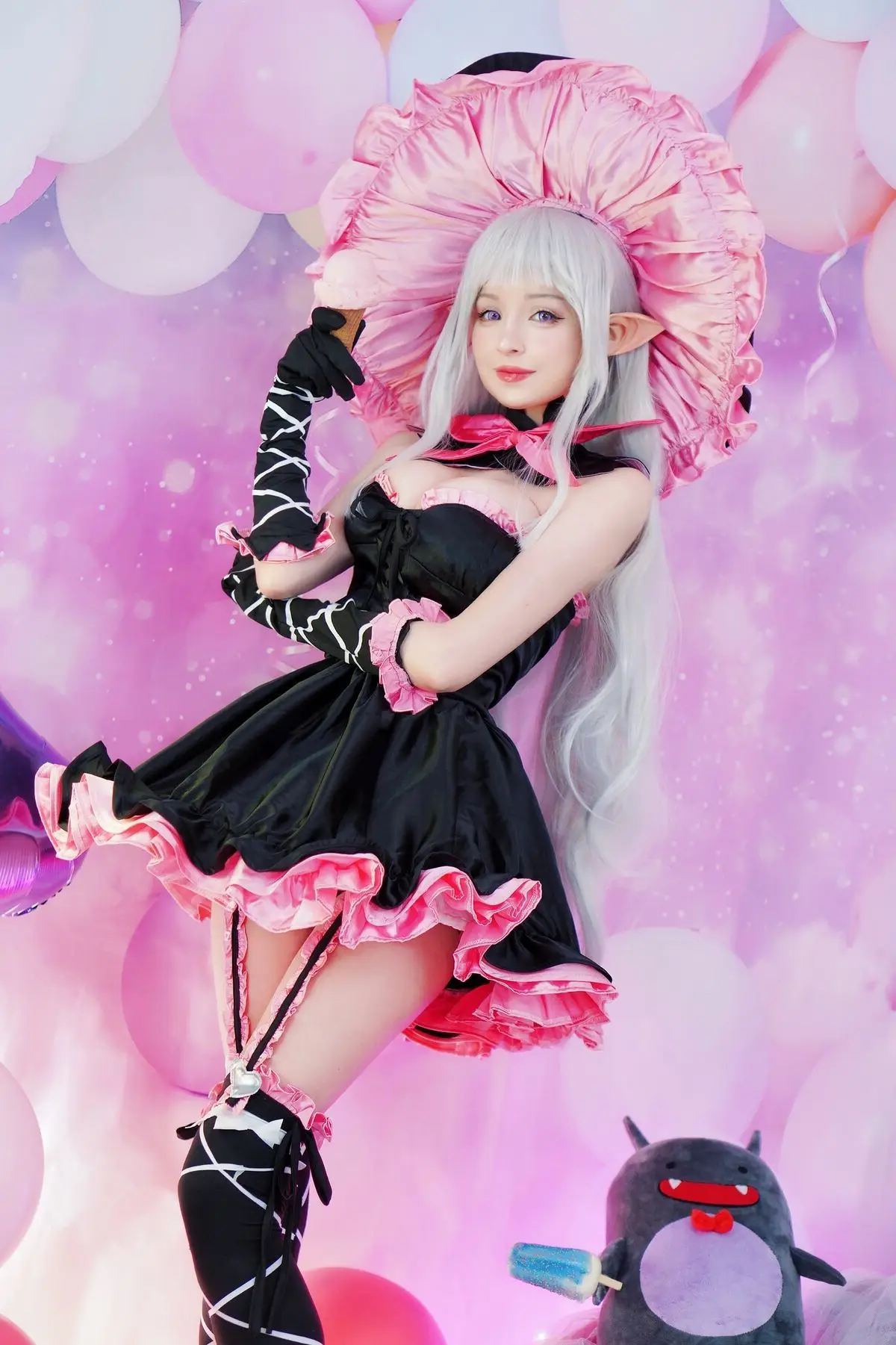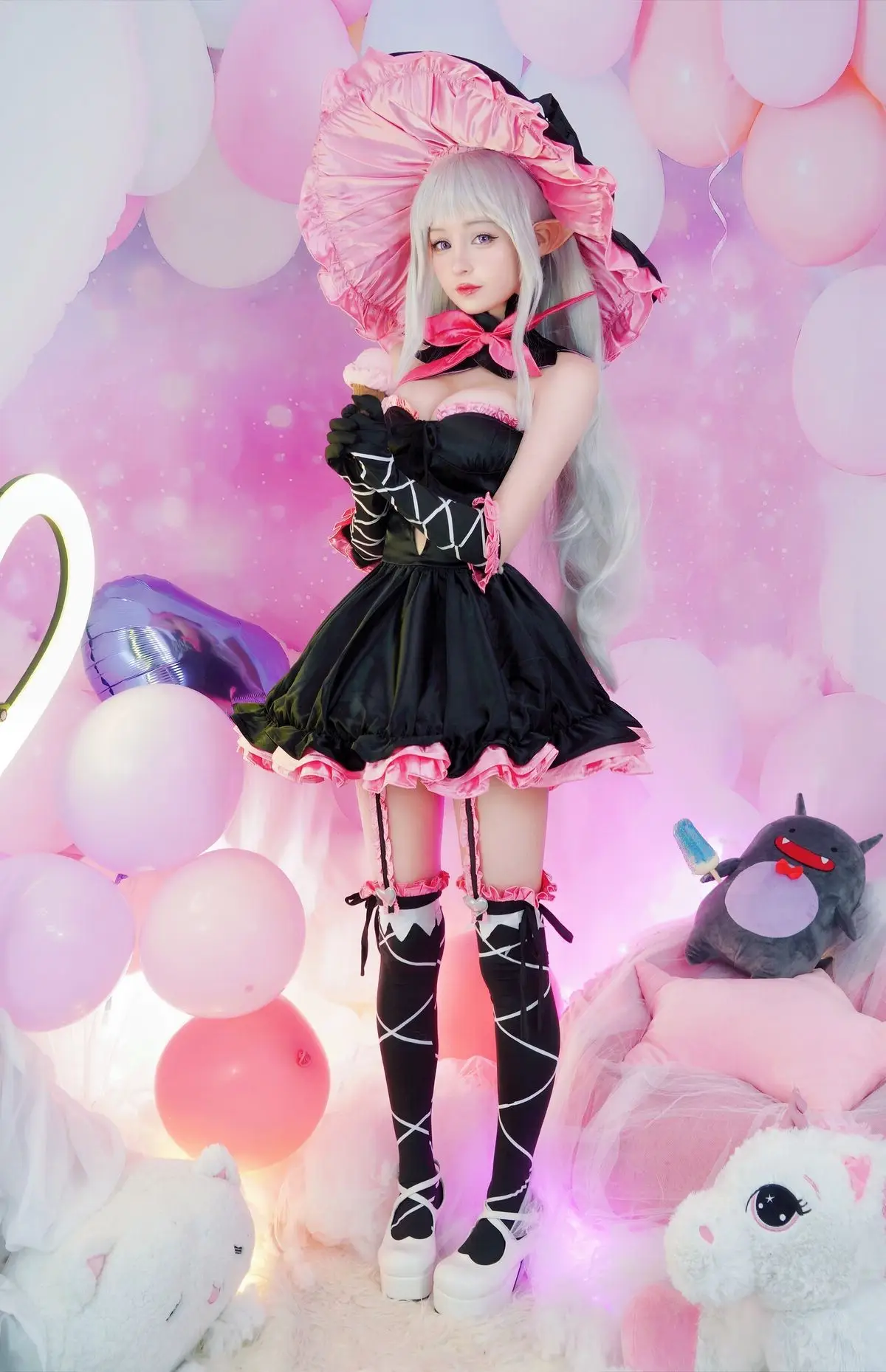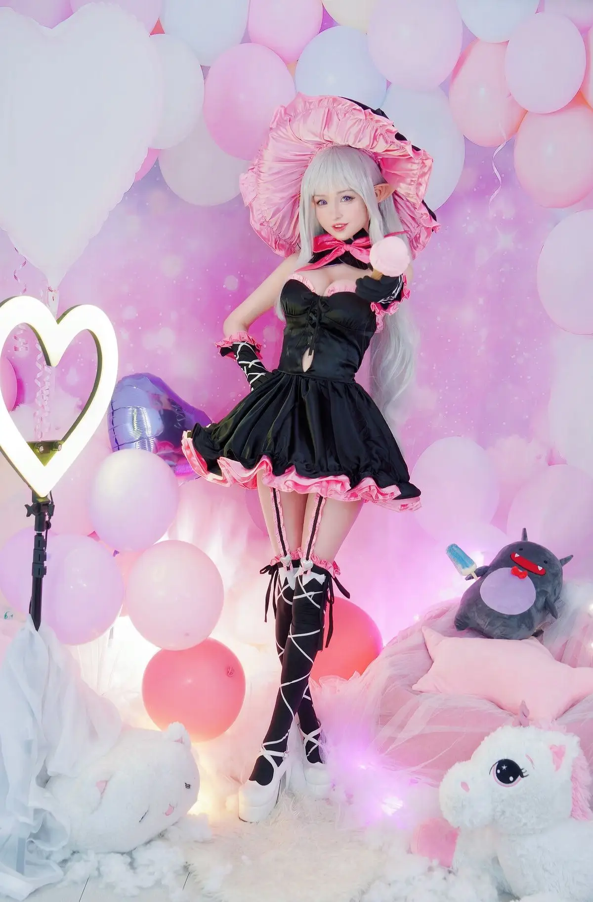 Step into a fantastical realm with Coser Hidori Rose's captivating portrayal of Melty du Granite This image showcases the intricate craftsmanship from the oversized pastel pink floral headpiece to the flowing black dress adorned with delicate pink lace Hidori Rose's platinum hair and large expressive eyes enhance the character's mystical and alluring charm The costume is meticulously designed down to every detail from the long gloves to the thigh high stockings creating a cohesive and appealing ensemble The soft pink and white balloon background perfectly complements the dreamy aesthetic highlighting Melty du Granite's distinct aura This is a high level cosplay performance reflecting Hidori Rose's dedication and passion offering a superb visual experience for fans#Coser #HidoriRose #MeltyduGranite #CosplayGirl #GamingCosplay #FantasyFashion