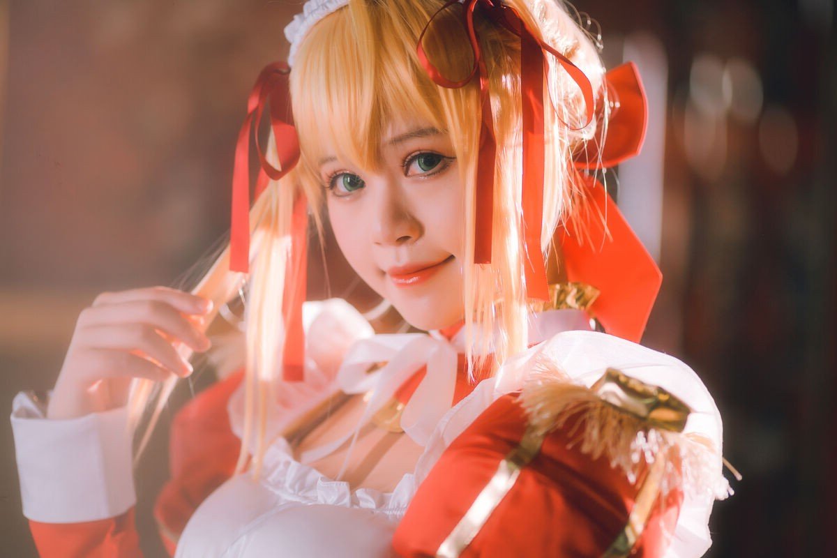 This image captures a stunning moment of Coser Kanoko Chitanda embodying the impressive character of Nero Maid. She shines brightly in a vibrant orange-red maid costume harmoniously combined with a pristine white apron and intricate ruffled details. Her golden hair is adorned with a matching headband and bows, creating an appearance that is both noble and graceful. The gentle standing pose and soft gaze exude elegance and charm, as if the character has stepped out of the virtual world. The meticulous attention to every detail of the cosplay showcases Coser Kanoko Chitanda's passion and skill, presenting a vivid and captivating image of Nero Maid that enthralls every viewer.
