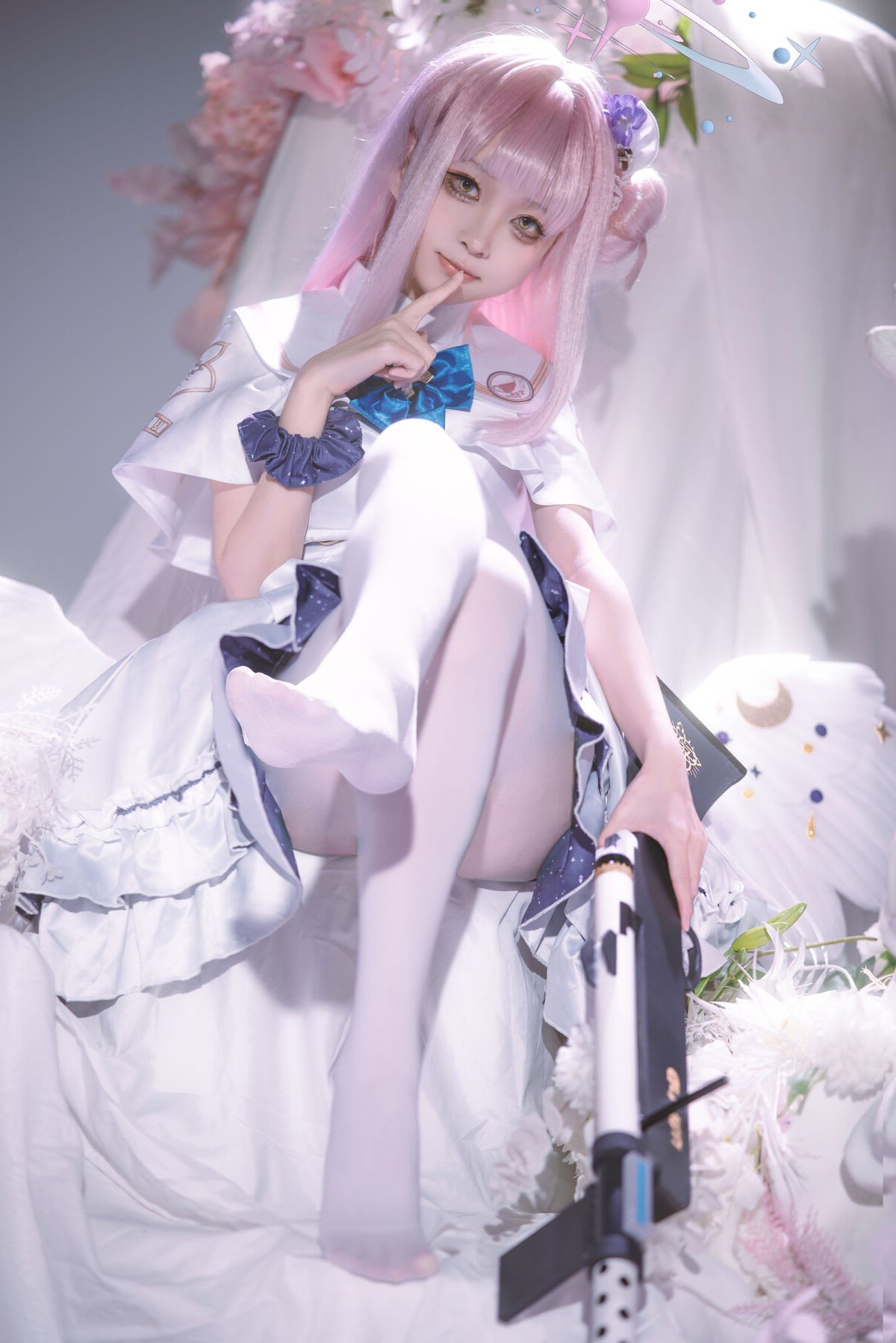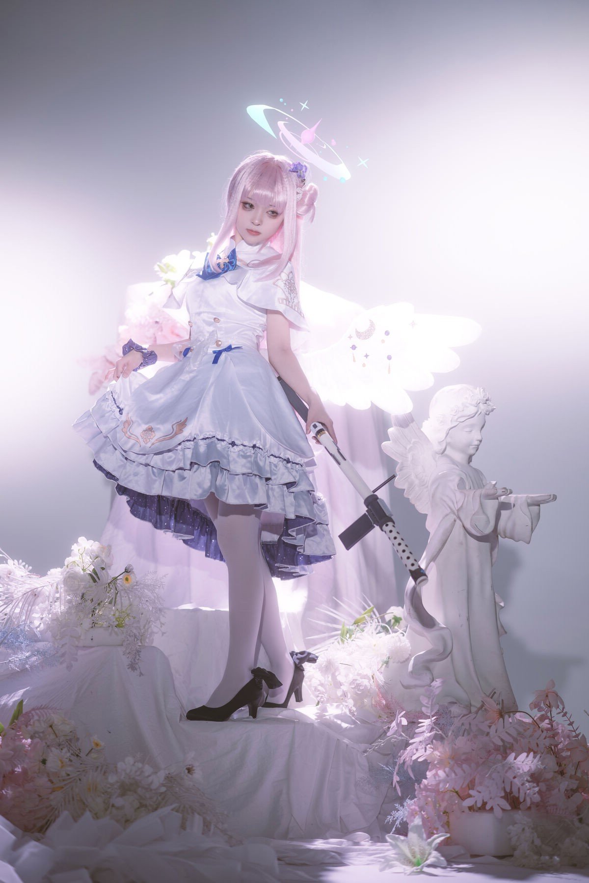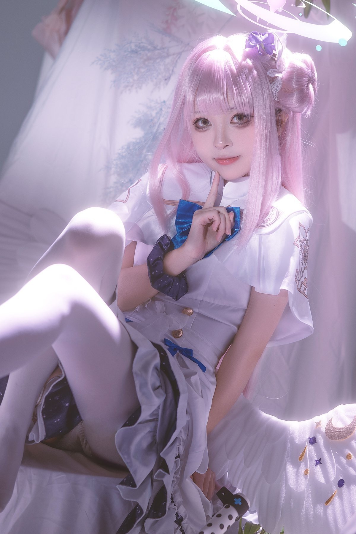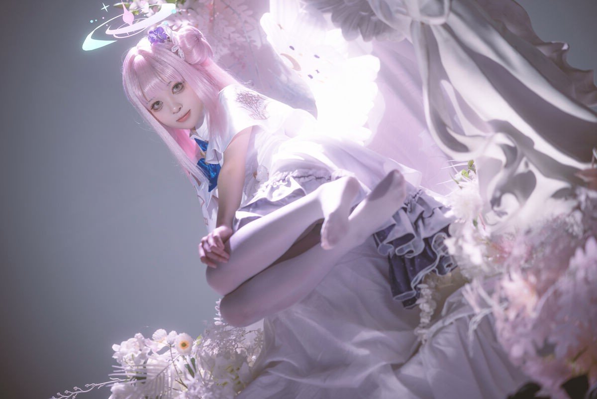 In this captivating image Coser@矢量鱼 masterfully embodies Mika Misono from the popular game Blue Archive. With her flowing pastel pink hair styled into elegant twin buns and a delicate halo she vividly brings to life the character’s ethereal and gentle beauty. The pristine white costume adorned with subtle blue accents creates a harmonious and enchanting overall look. Her clear eyes and soft smile further highlight Mika's angelic aura. This cosplay not only showcases meticulous attention to detail in the outfit and makeup but also successfully conveys the character's spirit offering a mesmerizing and emotional visual experience for viewers. It truly stands as a high-caliber cosplay artistry piece reflecting the model's passion and talent.