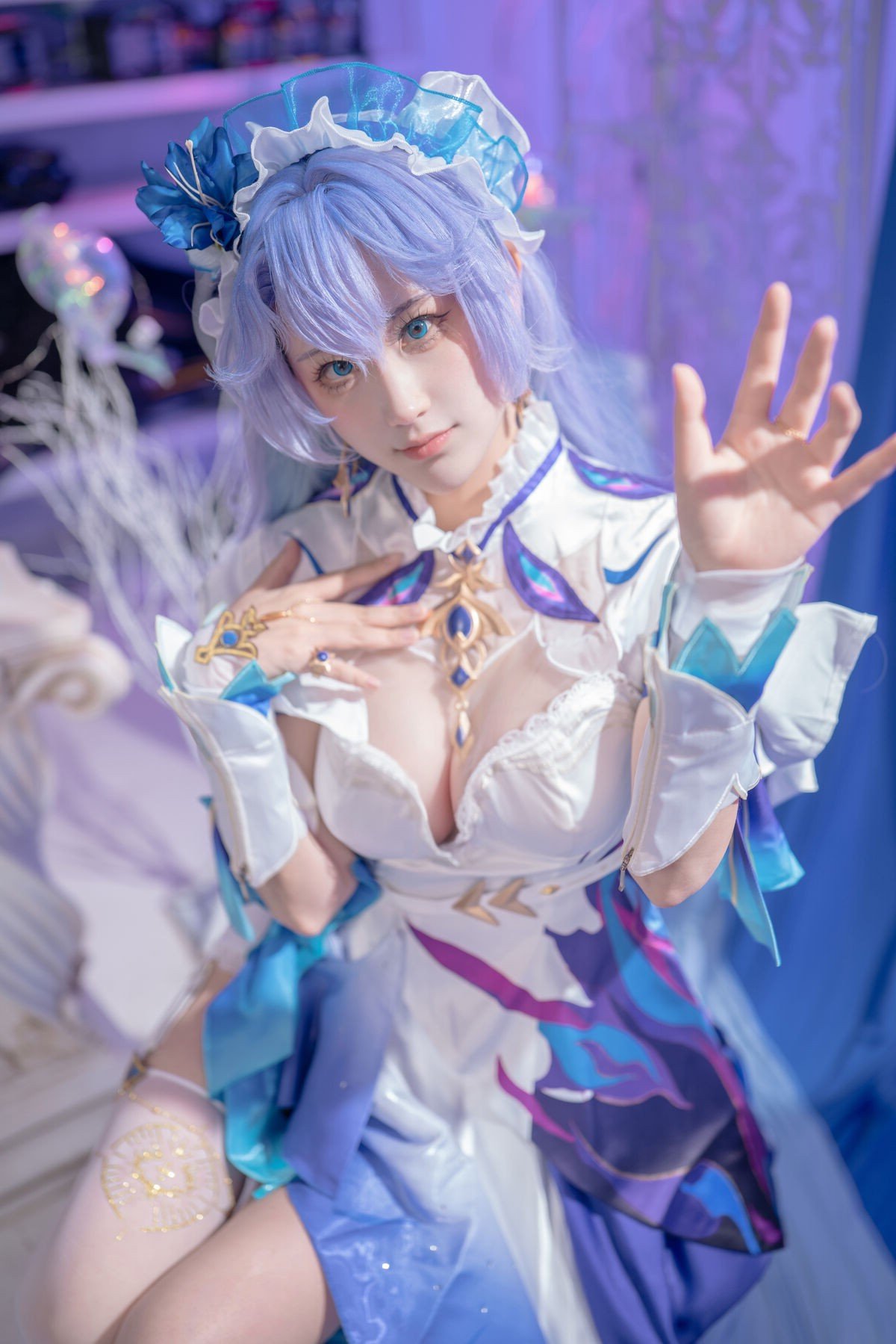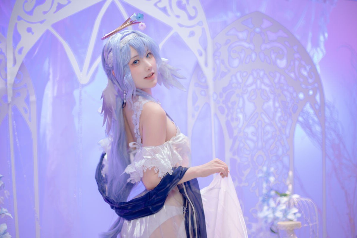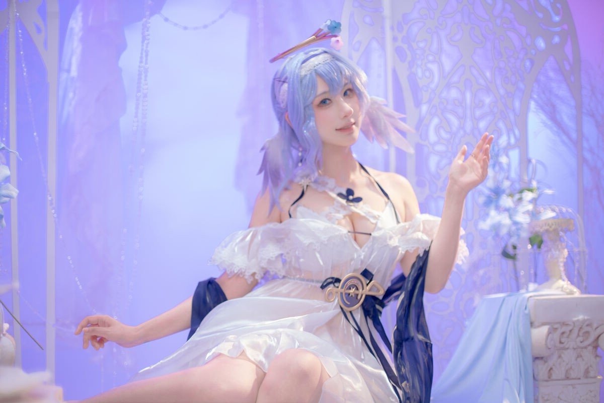 This stunning image captures Coser AzuNyan transforming into a gentle and ethereal fairy She dons a pure white dress with intricate ruffles highlighting her delicate and pristine beauty Her soft blue-purple hair flowing gracefully along with a subtle halo-like accessory enhances her mystical aura as if she were an angel wandering in a dreamy realm AzuNyans gentle smile exudes grace and captivates viewers into a fairytale world This exquisite portrayal is part of her special June 2025 collection showcasing her meticulous dedication to each intricate costume and character design