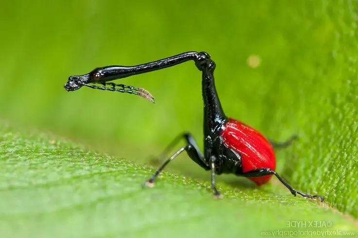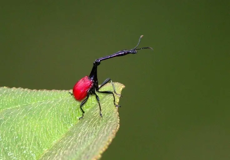 This close-up image features the striking giraffe weevil Trachelophorus giraffa characterized by its vibrant red wing covers and sleek black body. Its most captivating attribute is the uniquely elongated neck making it resemble a miniature giraffe within the insect kingdom. This peculiar neck is not merely a distinguishing feature but plays a crucial role in the species sexual evolution and its intricate nest-building function. This remarkable insect primarily inhabits Madagascar where its diverse ecosystem has fostered such extraordinary creatures. Males utilize their long necks for competitive mating rituals and skillfully rolling leaves to create protective cocoons for their eggs showcasing sophisticated survival tactics. This adaptation not only fascinates scientists but also contributes significantly to the richness of biodiversity.