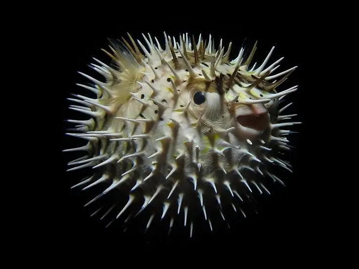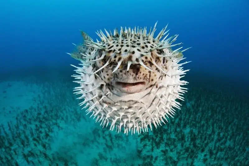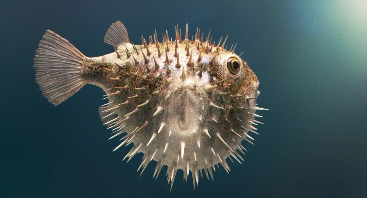 Close-up of Porcupinefish: Master of Defense with Sharp Spines, a Predator's Unforgettable Bite in the Deep Sea