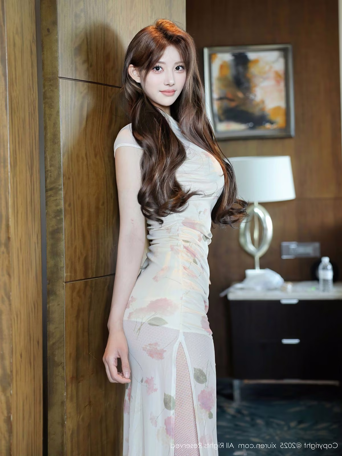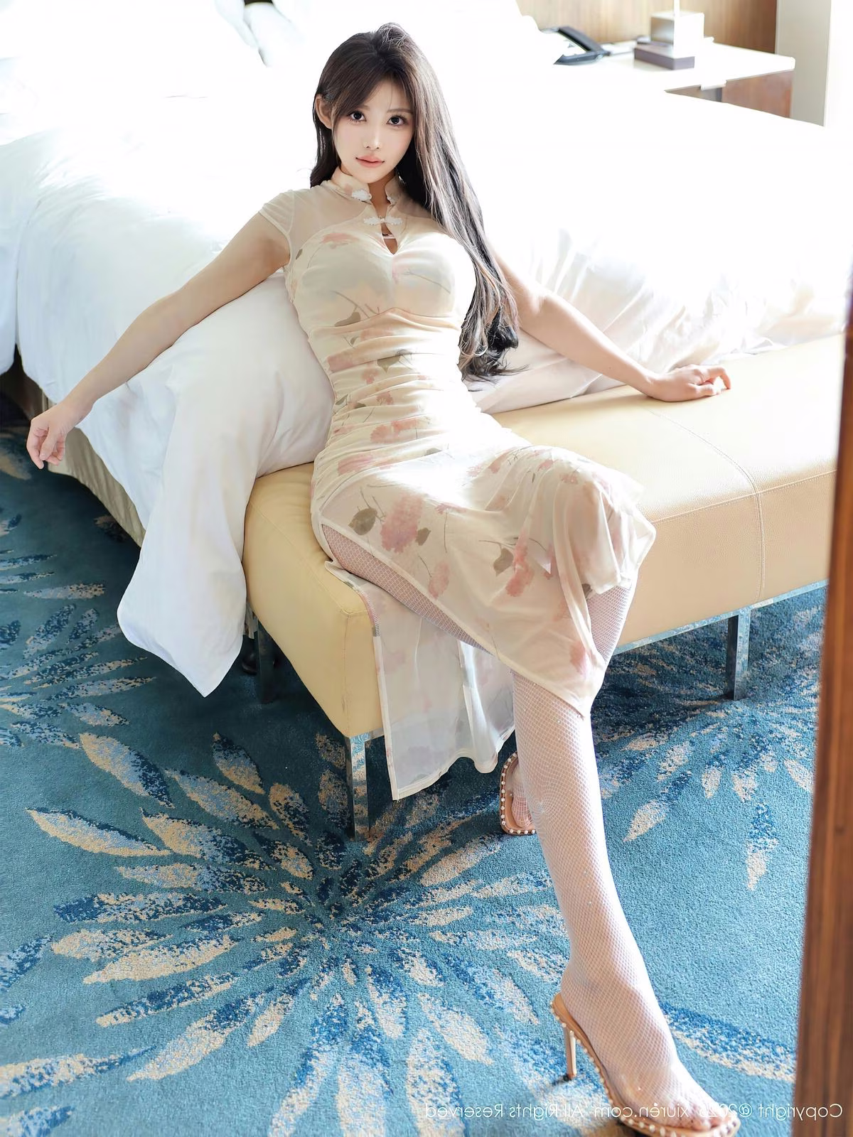 In the XiuRen No10355 photoshoot, Su Yi Nuo shines with irresistible elegance and allure. She wears a delicate cream-colored form-fitting dress, exquisitely designed to highlight her perfect figure and graceful curves. Her graceful pose on a luxurious chaise lounge, combined with captivating eyes and a gentle smile, exudes confidence and enchanting charm. The cozy bedroom setting, featuring high-end furnishings and soft lighting, further accentuates her sophisticated beauty and serene demeanor. The entire frame is a harmonious blend of modern flair and traditional Asian aesthetics, creating an emotional and refined tableau that sparks curiosity to explore more of this collection.