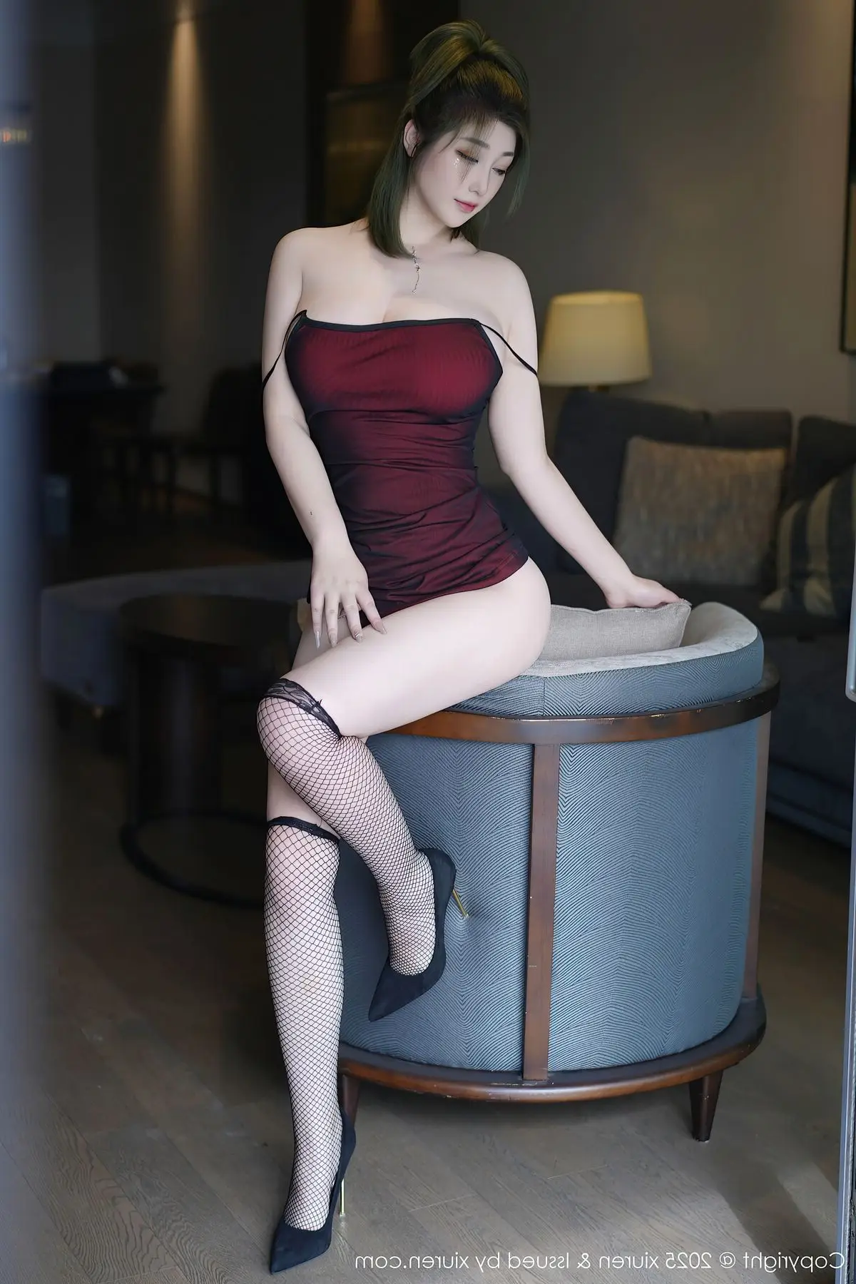 Explore the captivating photo collection of Da Ji Toxic in XiuRen No.10476 where alluring beauty is showcased through every frame The muse Da Ji Toxic appears in a sophisticated bodysuit design embracing her curves highlighted by a mysterious deep red hue An undeniable focal point is the delicate black sheer stockings gracefully adorning her long slender legs creating a subtly seductive appeal Each image is an artistic portrait capturing her captivating aura and expressive gaze The entire collection exudes a luxurious aesthetic style from her posing to the cozy indoor setting offering an impressive and unforgettable visual experience