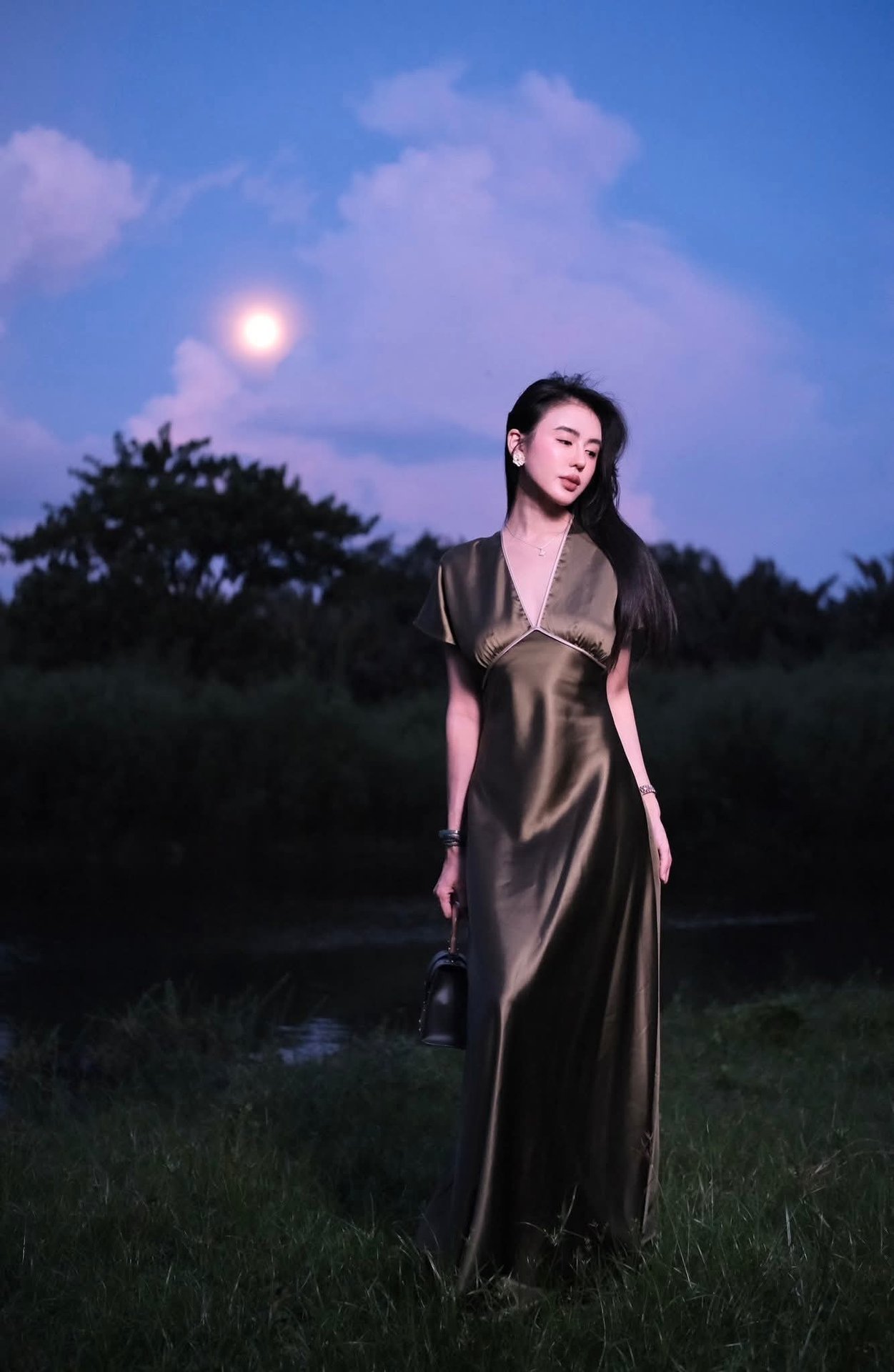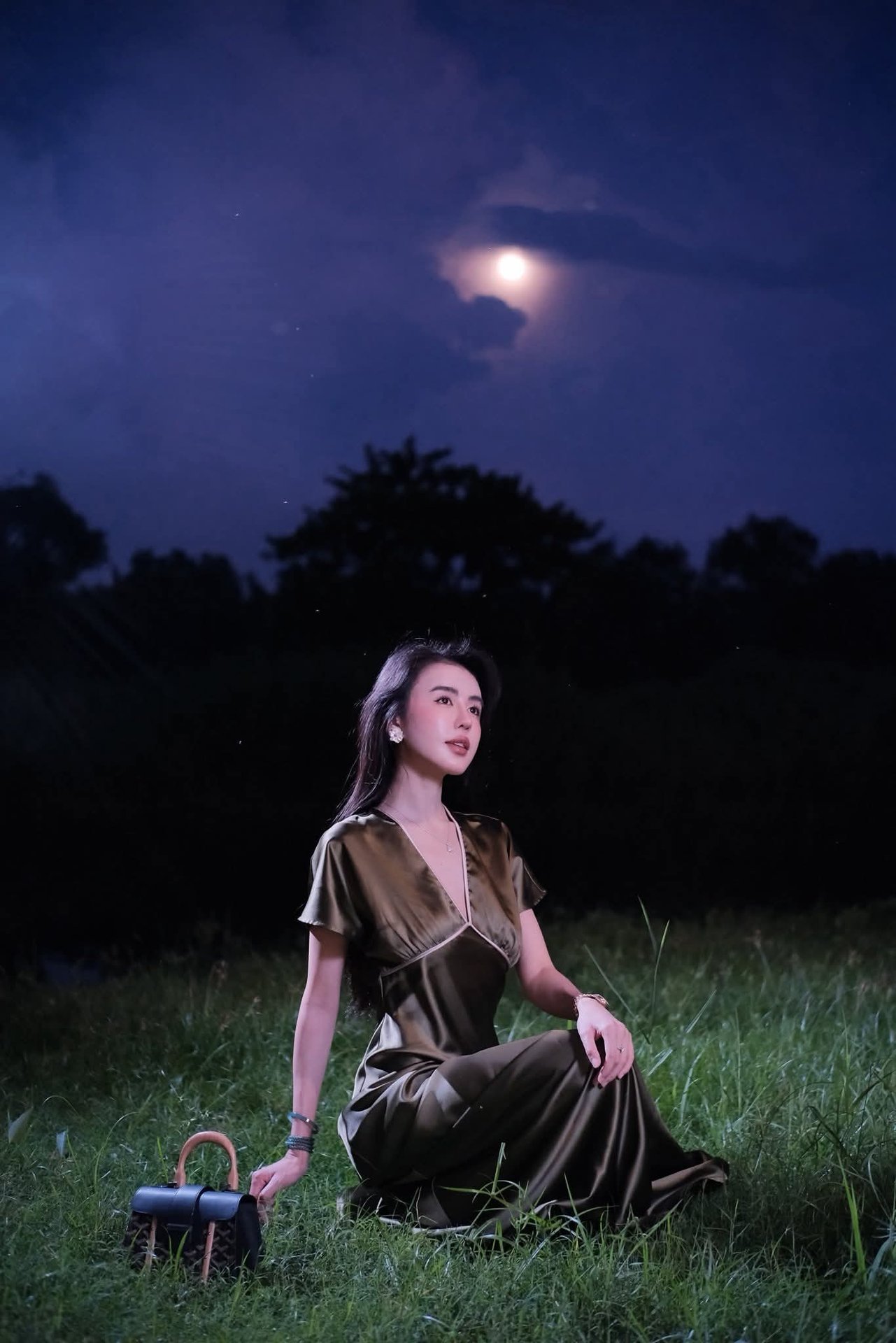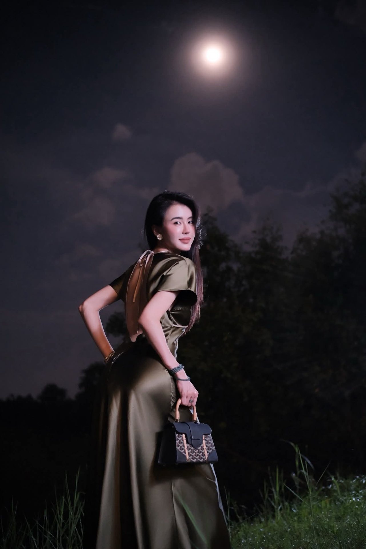 This captivating image perfectly captures a magical moment where elegant beauty harmonizes with the ethereal night. Under the bright full moon a woman appears enchanting in a flowing silk dress. The dresss muted tone further accentuates her sophisticated and refined style. The gentle moonlight illuminates her creating a soft glow that makes her seem like a muse stepping out of a fairytale. The untouched natural backdrop and the deep night sky highlight her graceful silhouette. This is more than just a fashion photograph it is a work of art where emotion and beauty are elevated under the moons mystical light. The flowing silk gown and long hair add a touch of softness and romance. The entire scene exudes a delicate allure inviting viewers to immerse themselves in this dreamlike world.