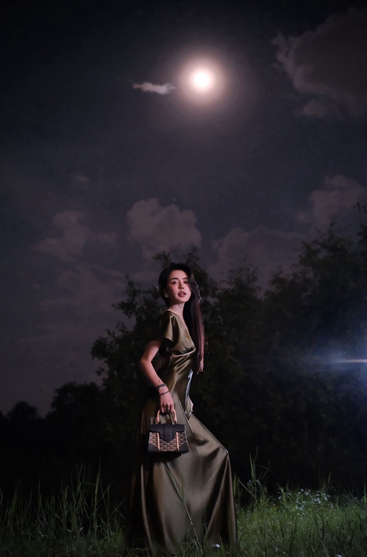 Enigmatic Beauty Under Full Moonlight: Woman in Elegant Silk Gown, A Dreamlike Night Moment.