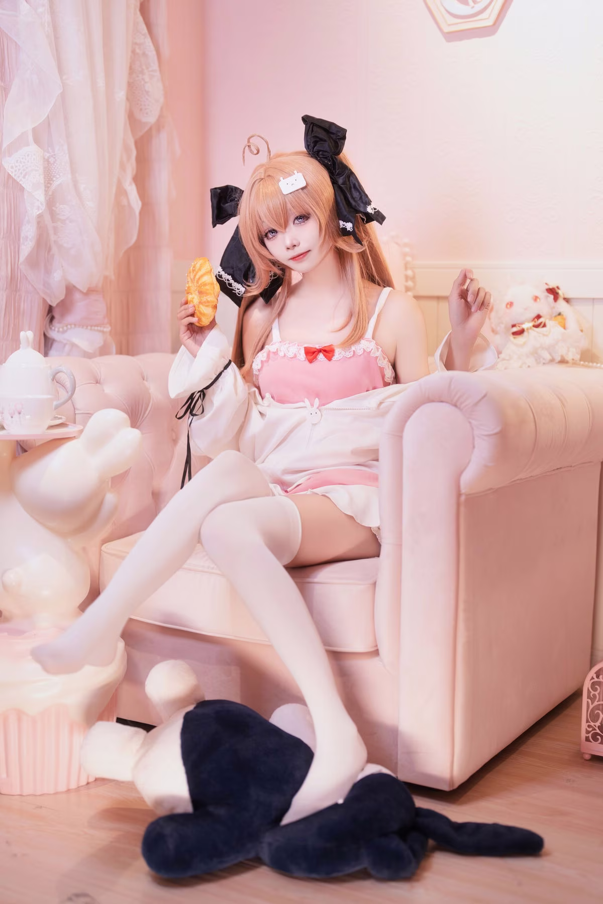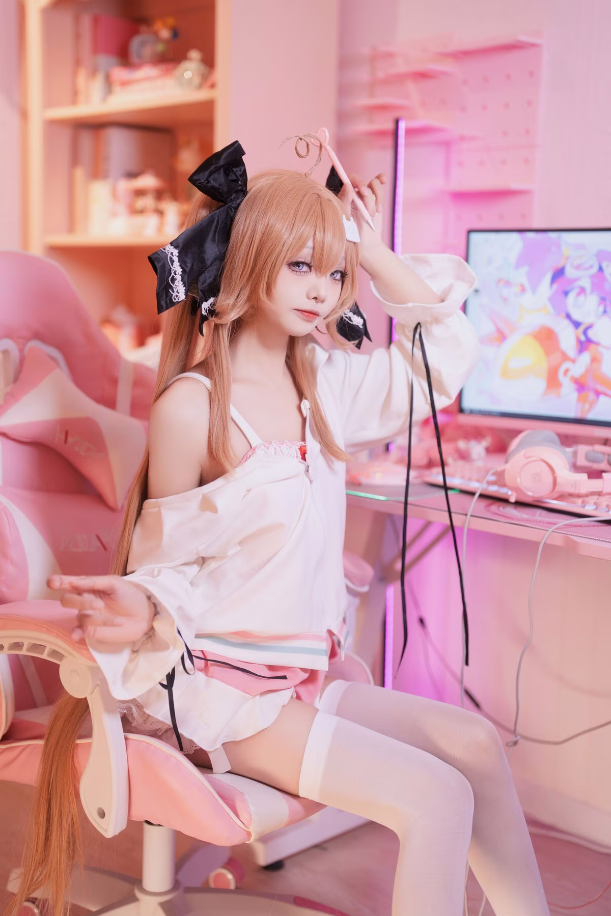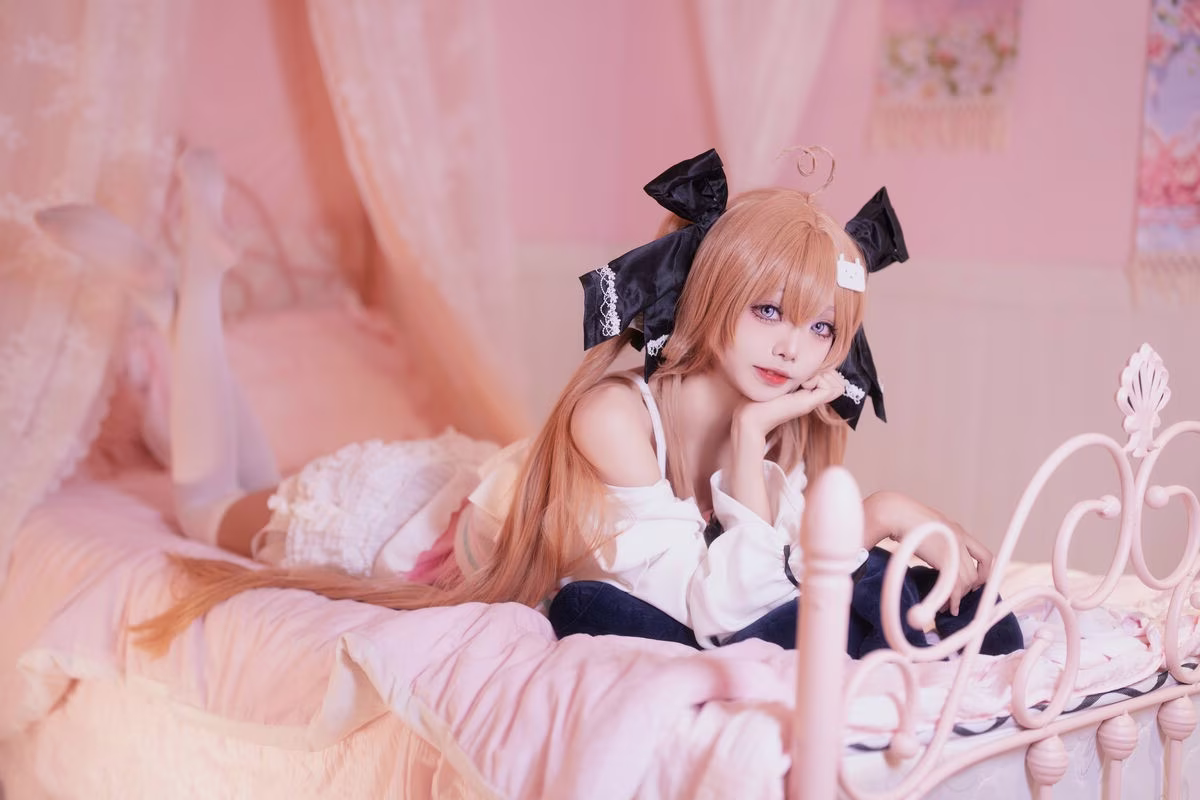 In this enchanting photo Coser Ai Xi Aiwest delivers a captivating transformation into the character 雷戈洛. She exudes a sweet and dreamy beauty with her golden hair styled adorably in two prominent black bows complemented by playful cat ear clips. Her pristine white outfit featuring delicate off-shoulder ruffles enhances her graceful and charming presence. Ai Xi Aiwest's gentle smile and clear eyes draw every gaze creating a warm and romantic ambiance. The bedroom setting with pink curtains and soft lighting further elevates the dreamy aesthetic turning the scene into a sweet reverie. This exquisite portrayal leaves viewers enchanted by her subtle yet undeniable allure.