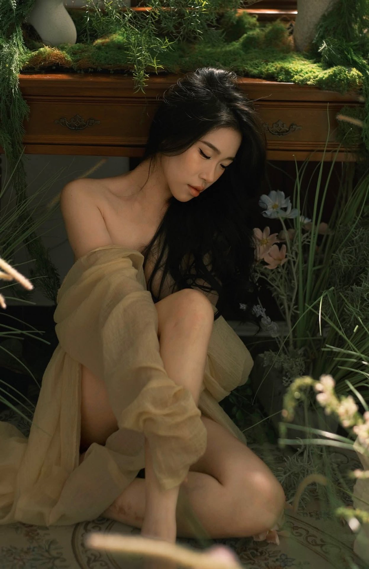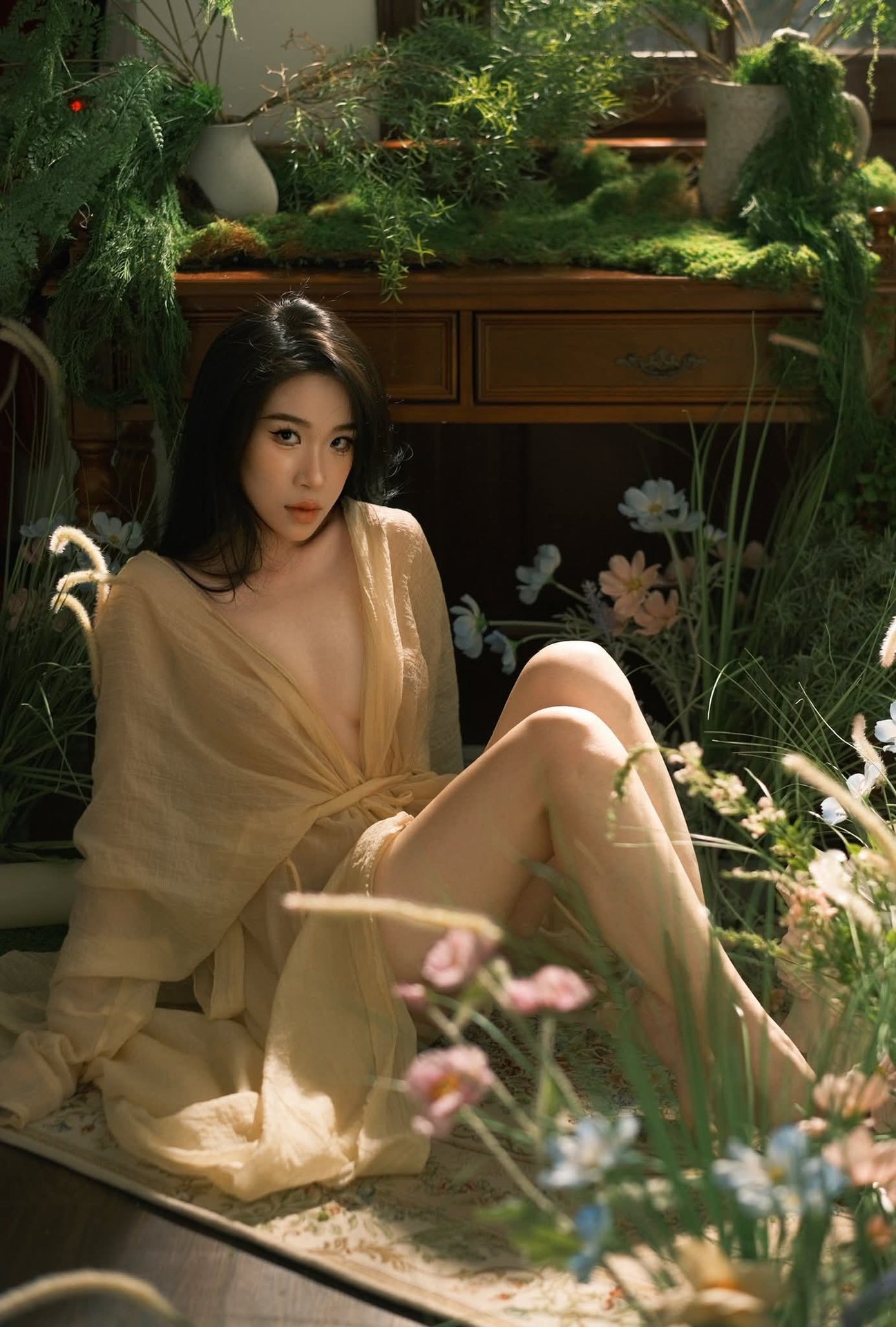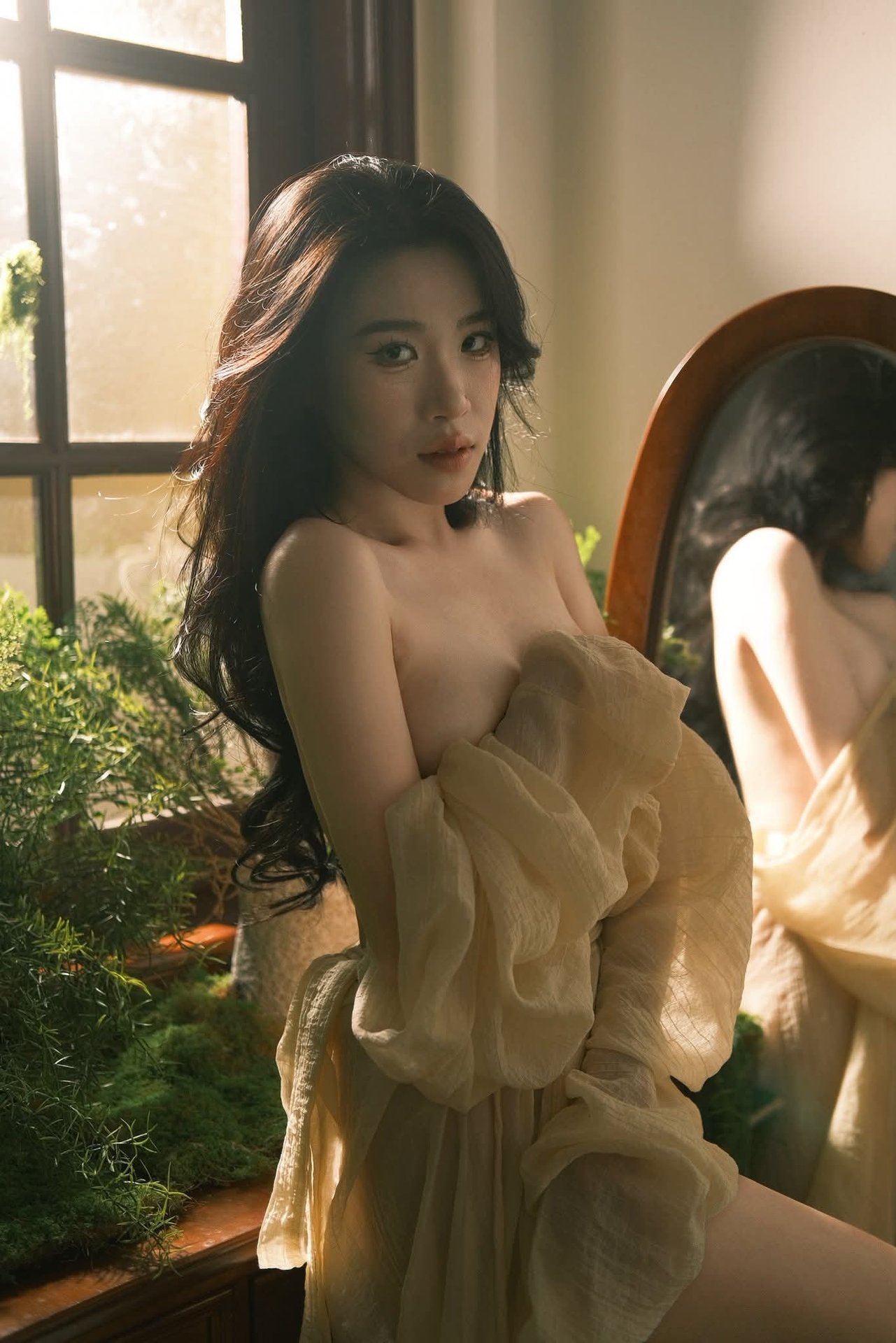 This captivating image showcases model Mu Yan Yan Yan Jiang in a stunning and alluring style from the XiuRen No.10299 collection. She exudes an air of elegant confidence, dressed in a sleek black sleeveless dress adorned with unique chain detailing. Her long, slender legs are accentuated by sheer black stockings and sharp pointed high heels, creating a cohesive and sophisticated ensemble. With her magnetic gaze and poised demeanor, Mu Yan Yan Yan Jiang not only embodies modern fashion but also projects an irresistible charm. The blurred city lights visible through the window in the background add a touch of urban glamour, elevating this into a high-fashion moment that powerfully asserts her strong and captivating personal style.