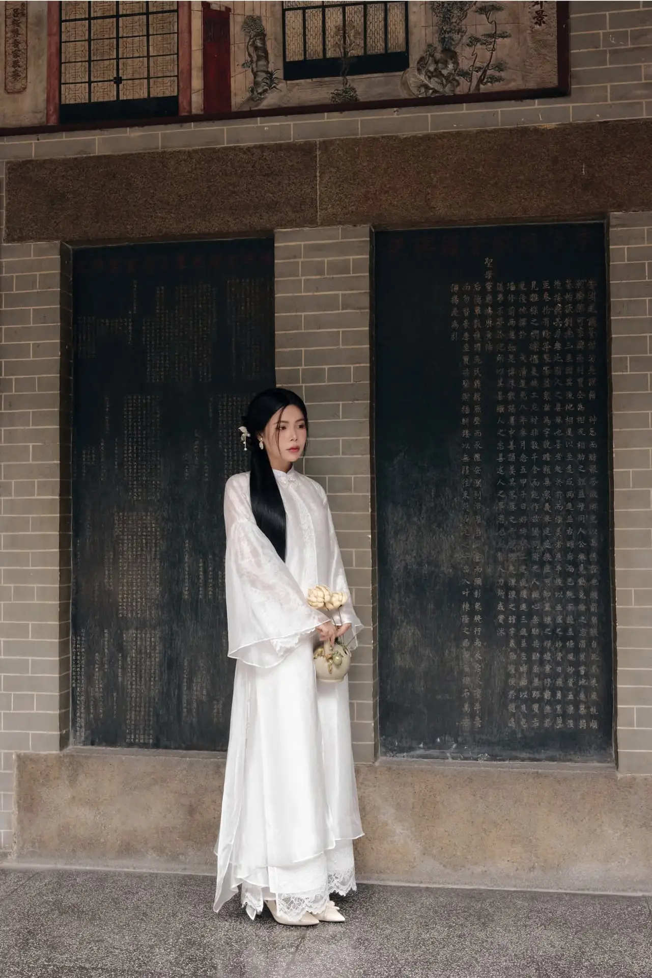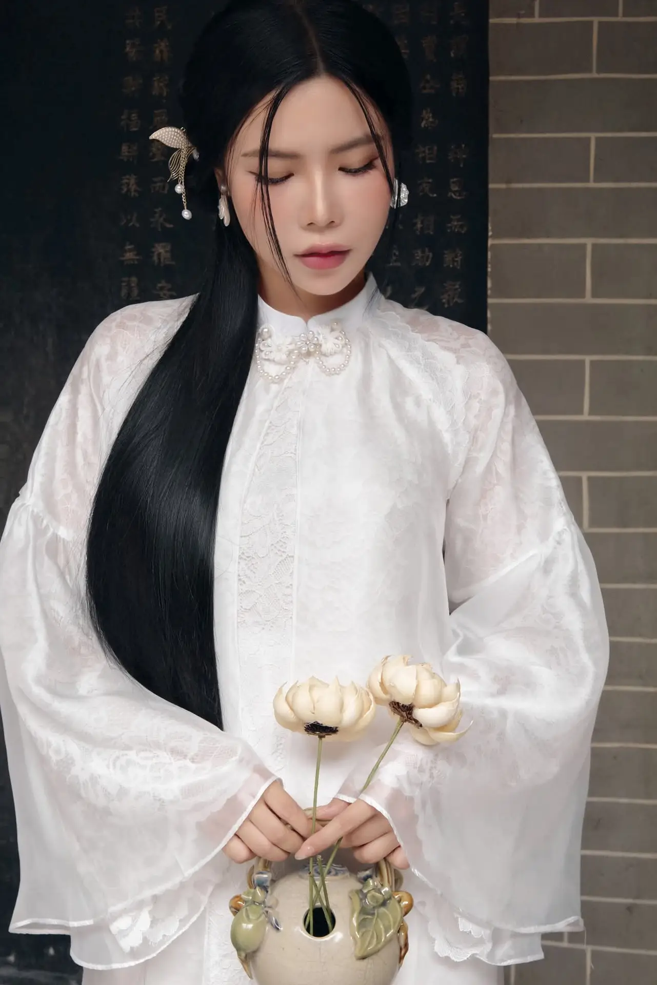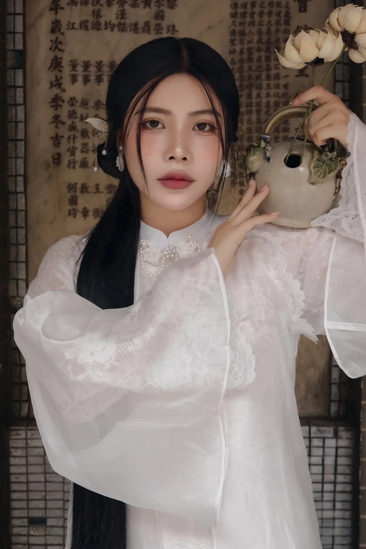 This stunning photograph captures a woman embodying elegant and gentle East Asian beauty, exuding a captivating classic allure. She is adorned in a pristine white outfit with soft lines and wide bell sleeves, reminiscent of traditional Eastern aesthetics. Her long, silky black hair is neatly styled and embellished with an exquisite hairpin, further highlighting her ethereal grace and nobility. Her deep eyes and contemplative demeanor create an irresistible charm. In her hands, she holds a small ceramic vase containing simple dried flowers, symbolizing enduring and understated beauty. The overall image is a perfect blend of feminine elegance, sophisticated attire, and a timeless setting, sure to enchant anyone who appreciates classic style and East Asian culture.#EastAsianBeauty #ClassicStyle #TraditionalAttire #ElegantAndGentle #AsianBeauty