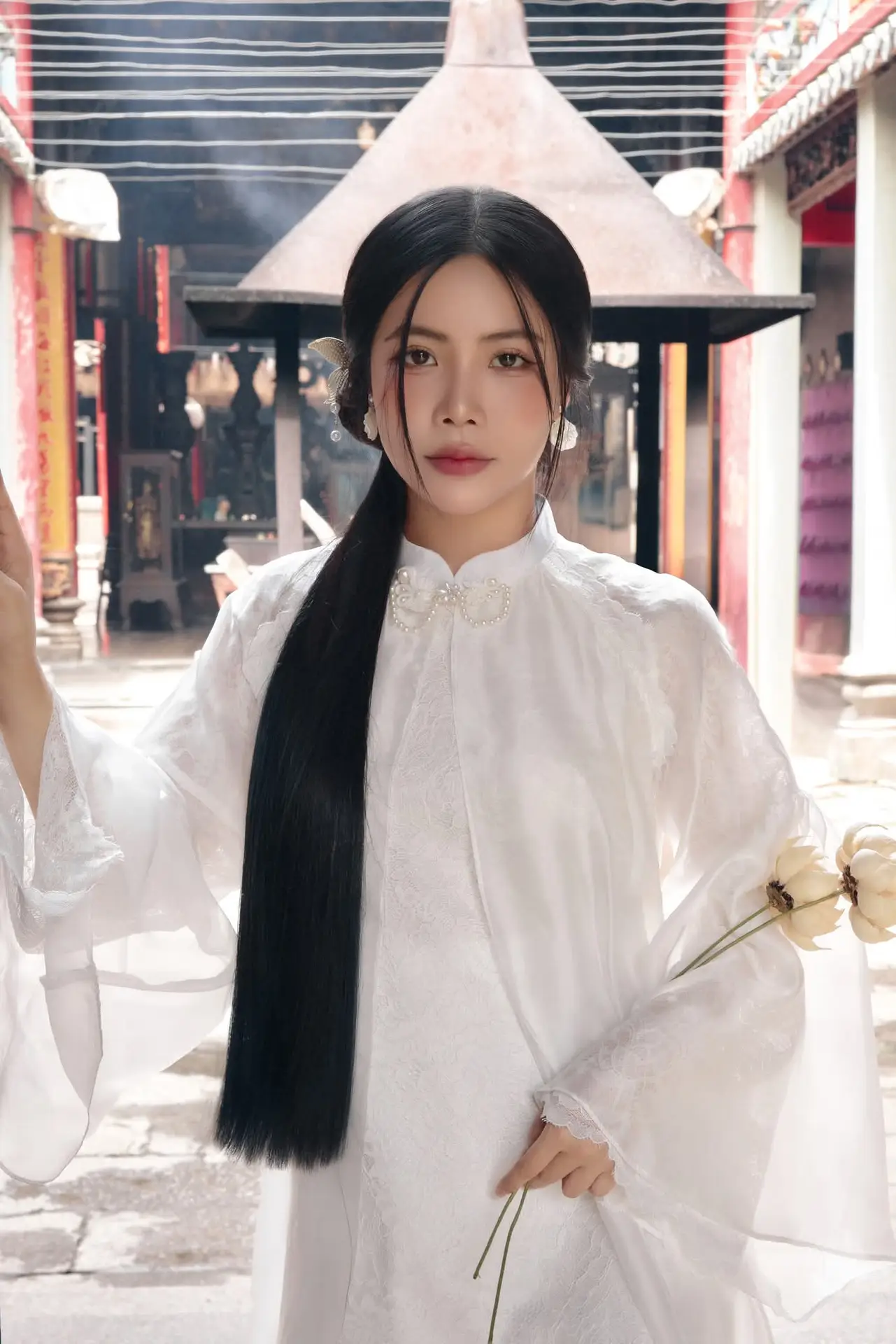 This stunning VGU No.186 image beautifully portrays a girl with serene and graceful East Asian beauty. Her dark hair is elegantly styled, adorned with pristine white flowers and soft black ribbons, creating a captivating and harmonious combination. The girl wears a pure white traditional dress, symbolizing purity and gentleness. Her gaze is thoughtful and profound, accompanied by a subtle smile, exuding an enchanting traditional charm. Her hands delicately hold a small white flower, further enhancing the elegance and sophistication of the overall photograph. This is an artistic masterpiece celebrating timeless beauty, feminine tenderness, and distinctive East Asian cultural aesthetics.#EastAsianBeauty #WhiteFlowers #SereneBeauty #TraditionalBeauty #FemalePortrait