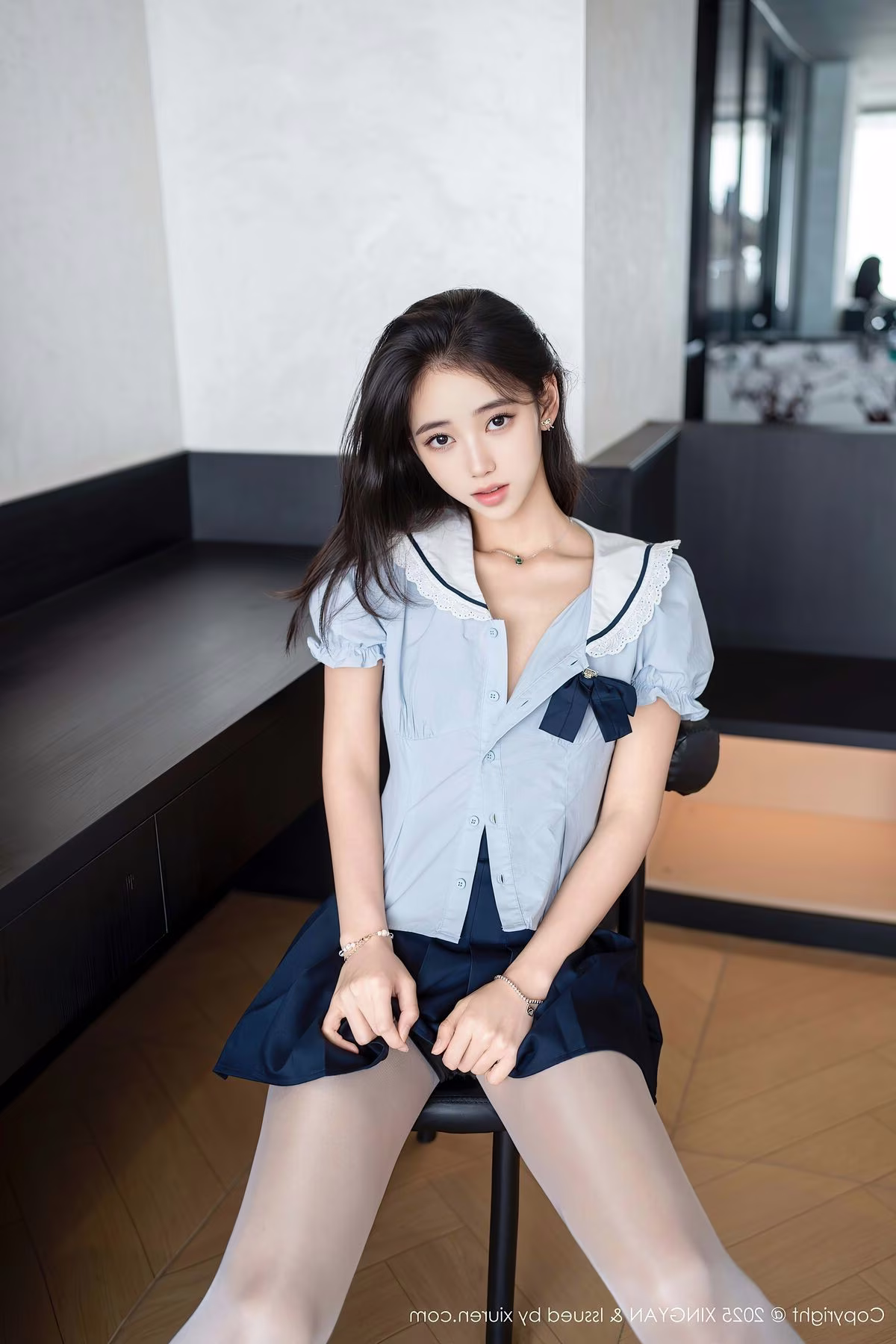In this special photoshoot from XiuRen No.10314, model Lu Xuan Xuan shines with an enchanting beauty. She flawlessly showcases her slender figure and endlessly long legs, accentuated by sheer black stockings and elegant high heels. The form-fitting black leather skirt not only highlights her alluring curves but also embodies her confidence and edgy style. Her dark blue shirt creates an interesting contrast between professionalism and sensuality. Lu Xuan Xuan appears to be capturing a moment of poise and captivating charm, drawing all eyes. This image is a testament to the sophisticated choice of attire and the model's professional demeanor, offering an impressive glimpse into modern beauty.Stories