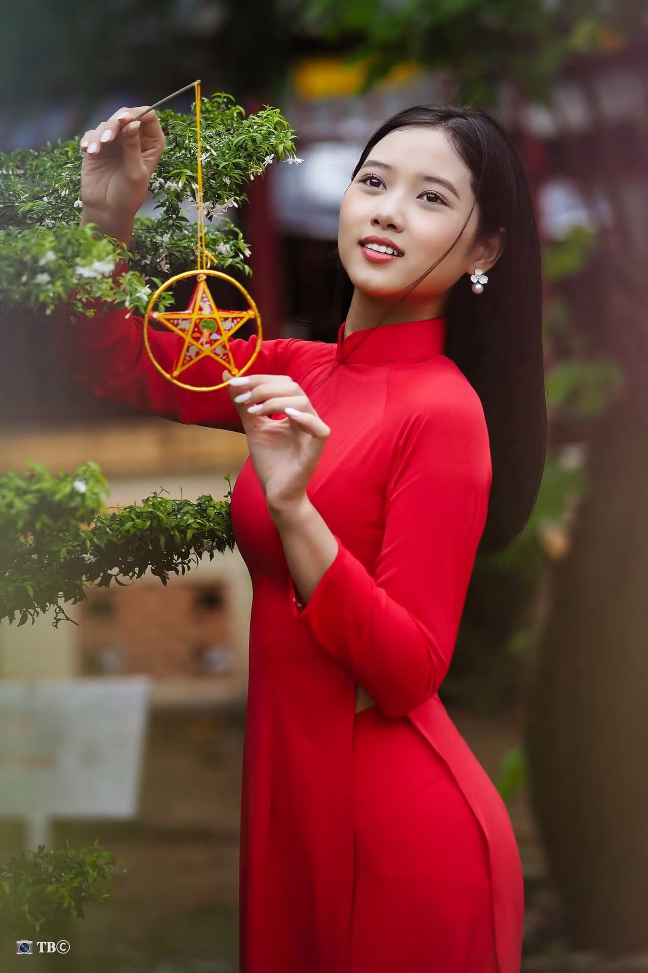 This stunning photograph captures the graceful beauty of a Vietnamese woman in a vibrant red Ao Dai The young lady with a gentle radiant smile tenderly holds a traditional rooster lantern a familiar symbol of childhood and Vietnamese cultural festivals The Ao Dai not only accentuates her elegant figure but also deeply embodies the traditional culture of the nation The combination of traditional attire and folk toy creates a meaningful image recalling precious cultural values and the enduring spirit of Vietnam