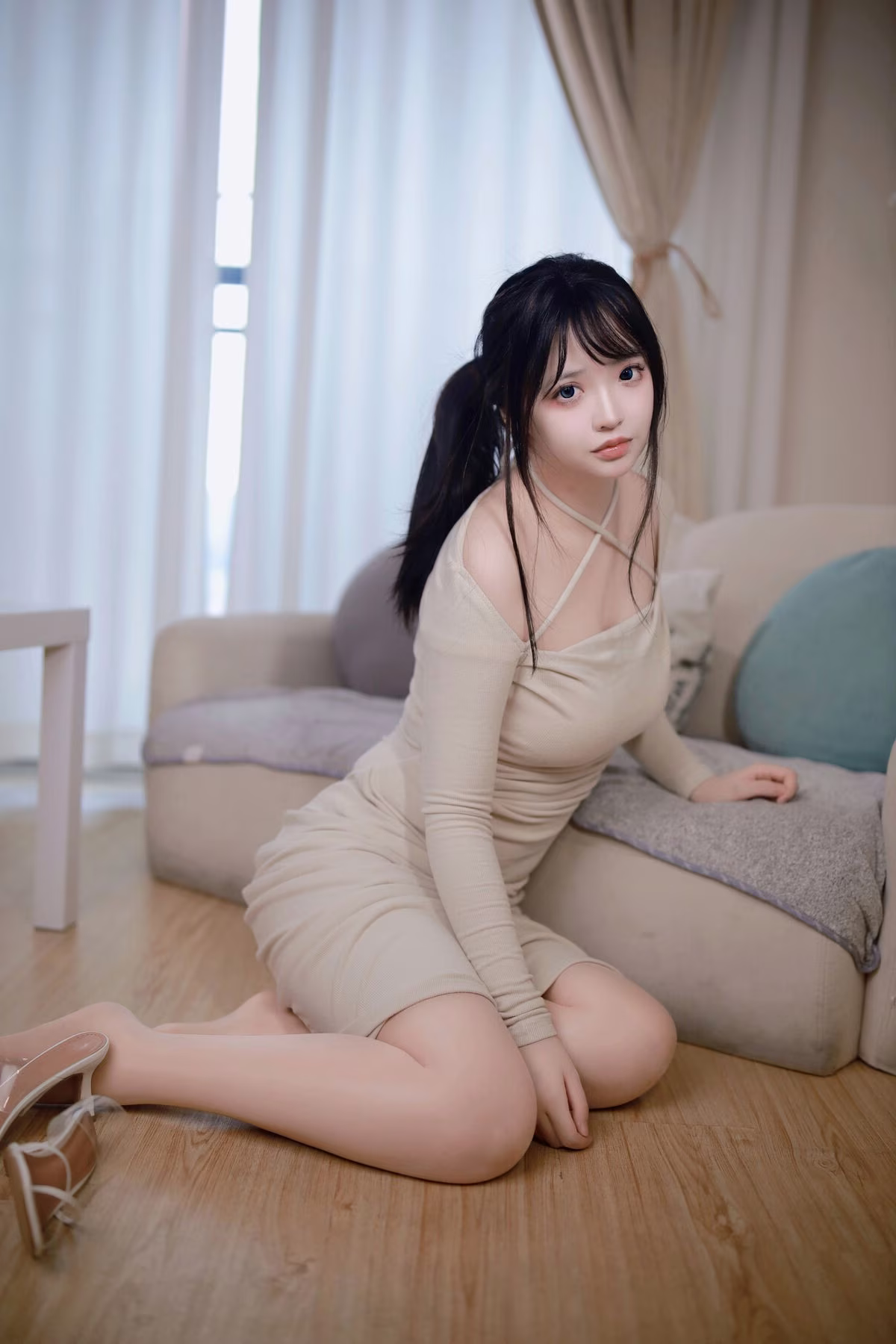 In this Coser Feng Mao Ss Goodnight photoshoot the model Feng Mao Ss transforms into an enchanting figure radiating gentle beauty and allure. She is captured in a soft beige knit dress subtly highlighting her elegant physique and alluring shoulders. Her kneeling pose on the sofa combined with a deep gaze creates a warm and emotionally rich moment. The image not only showcases Coser Feng Mao Ss's professionalism but also conveys a message of comfort and natural beauty within a private setting. This is a sensual and refined piece of photography capturing Feng Mao Ss's unforgettable grace offering a captivating visual experience for viewers.